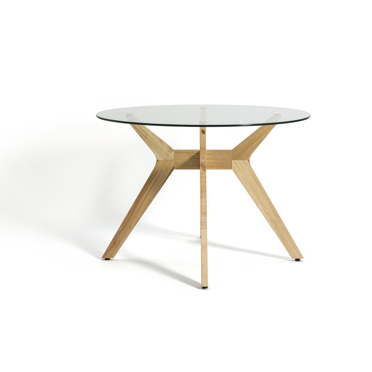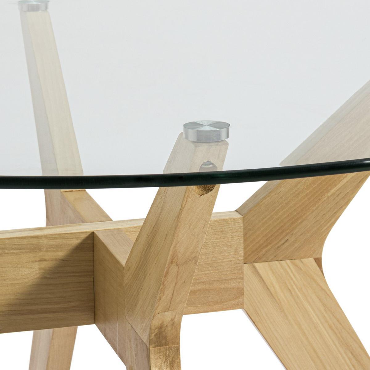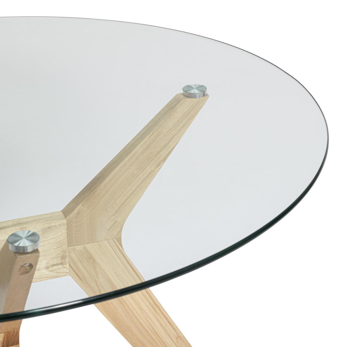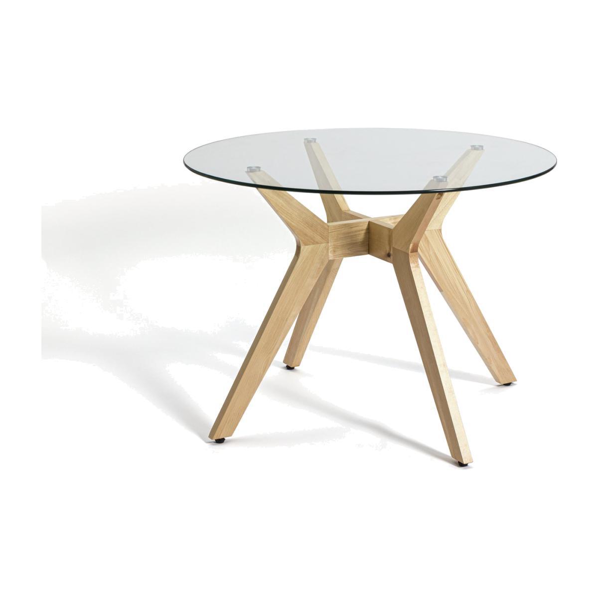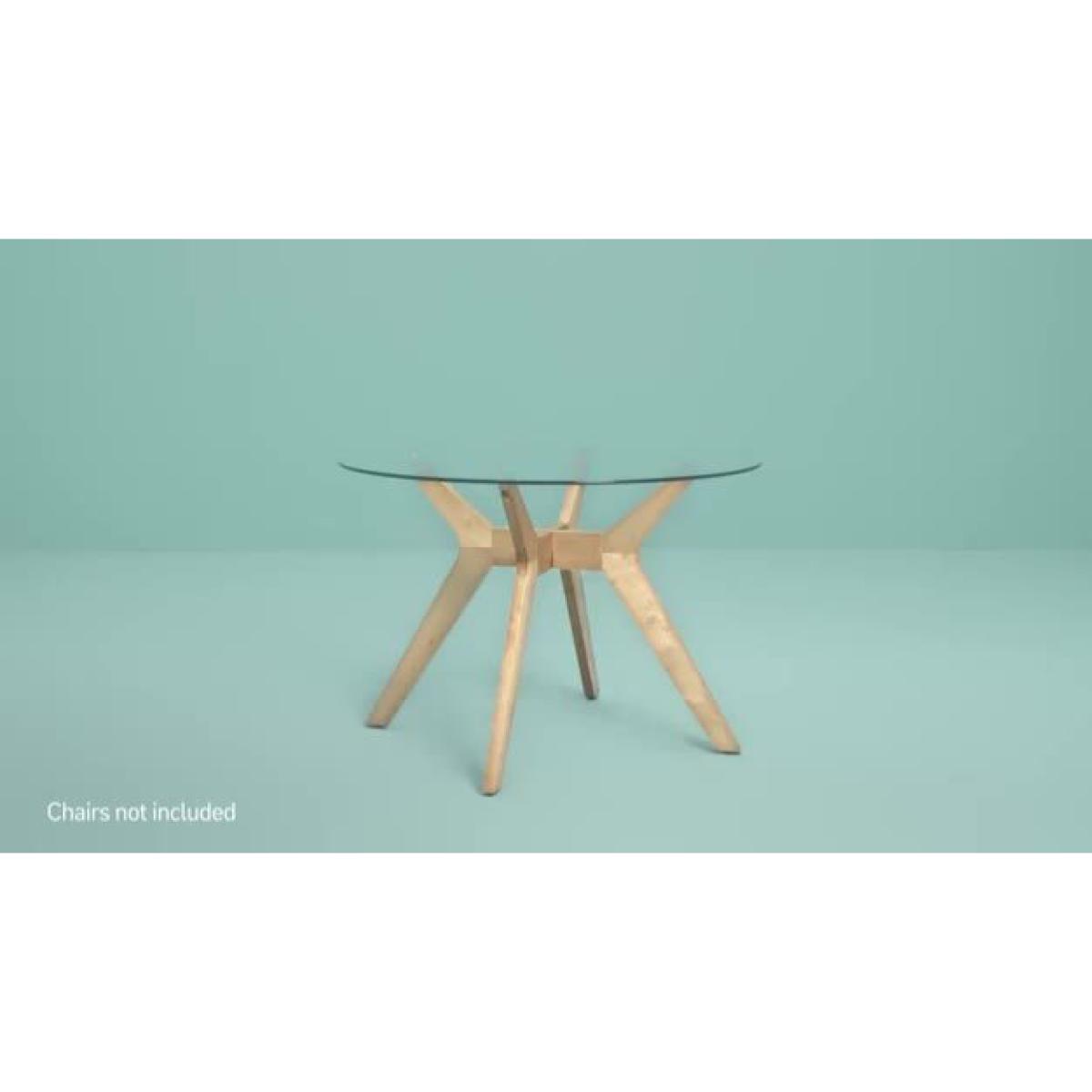 Family, friends, focal point? This solid wood and glass dining table makes every occasion matter. Crafted from birch, it layers natural woodgrain with the simplicity of clear glass. Your visual space is opened up. Designed to seat 4, its angled frame and round table top create a sense of balance and calm. Less is more with this one. Simply coordinate with natural linens, woven textures and simple glassware for a smart yet relaxed style. Breathe.