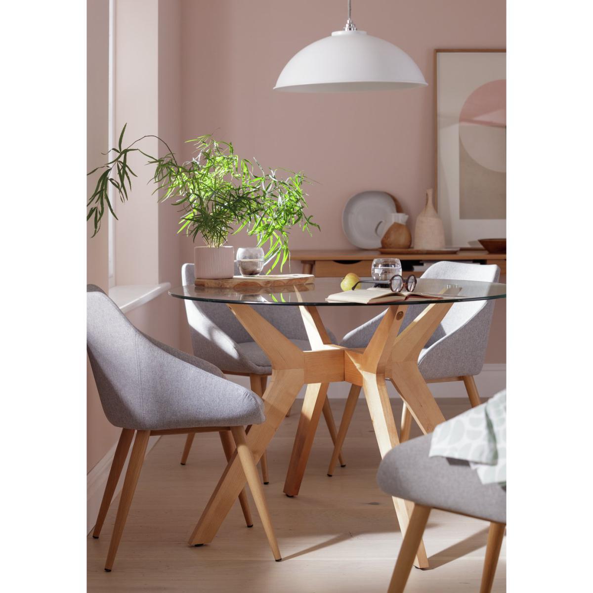 I love this one for its clean, modern look with the glass top and natural wood legs, making it a versatile piece that can suit a variety of interiors-from Scandinavian minimalism to cosy rural schemes. Its transparency helps keep the space feeling open, which is ideal for smaller dining areas or open-plan kitchens. When styling, consider pairing it with either sleek, contemporary chairs in neutral tones or warm wooden seats to enhance the natural feel. Practical tips include layering with a simple runner or a centrepiece such as a vase with fresh flowers to soften the glass surface, and ensuring the chairs you choose are comfortable since it’s perfect for lingering over family meals or casual gatherings.