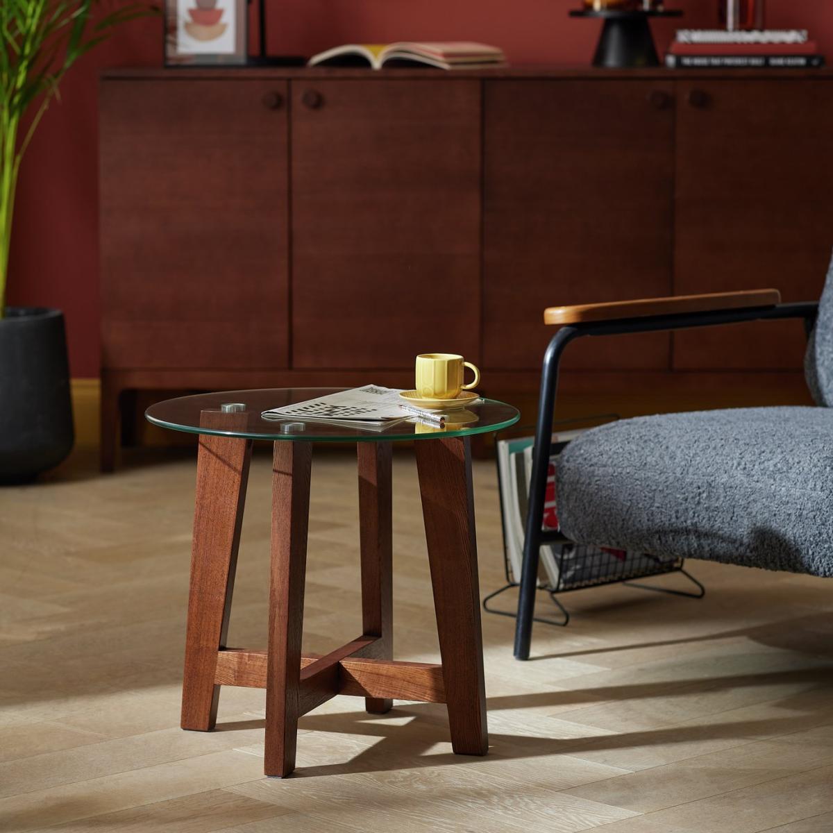 Combine Mid-Century chic with a dash of modern design and ta dah, we have Zela. A glass topped side table with a crisscross base and endless contemporary appeal. Walnut-stained solid wood legs, provide a real feel of authenticity. Part of the Zela collection. Size H 50, W 45, D 50cm. Made from solid wood with a painted finish. Weight 5.2kg. Self-assembly - 2 people recommended. Maximum load weight 100kg. Package Dimensions: Package 1 dimensions: H12.5, W58, D58cm. Package 1 weight: 6.2kg. General information: We are excited to be welcoming some of our favourite HOME products into the Habitat range. Your product may arrive in Habitat or HOME packaging. Manufacturer's 1 year guarantee.