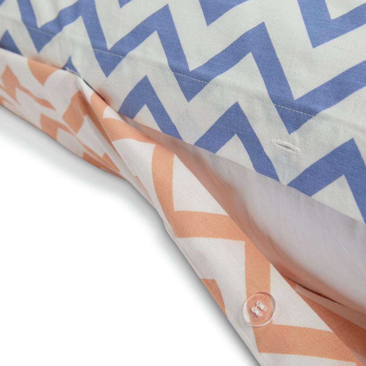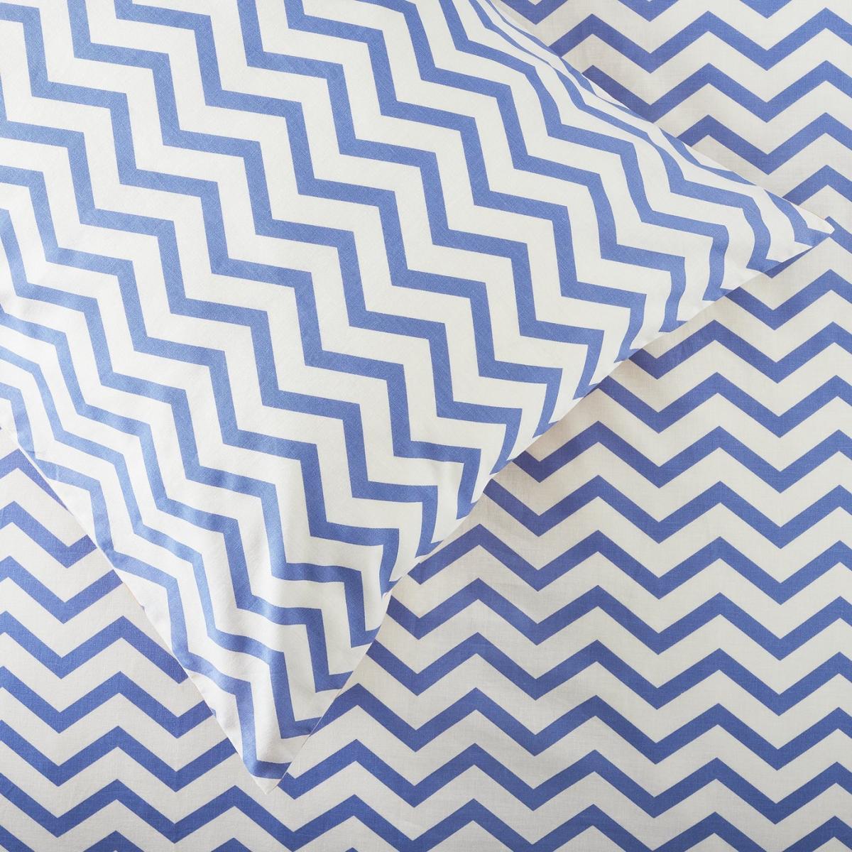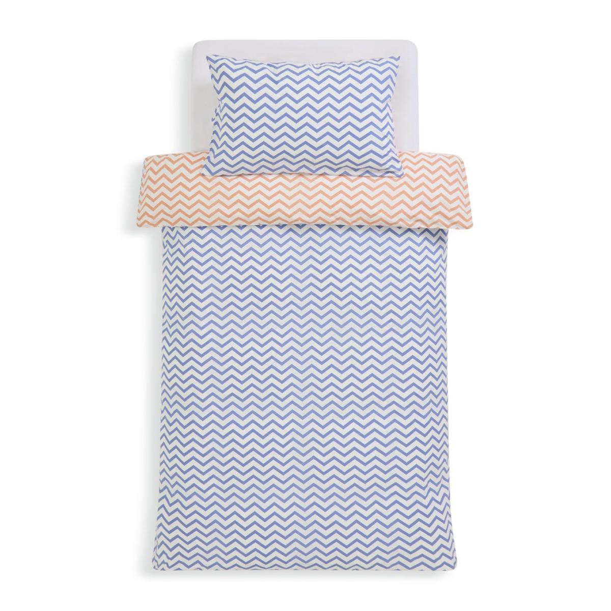 Snazzy, squiggly sheets. Our zig zag single duvet set is fabulous in bold blue and white. Reversible too, so you get more ways to refresh your kid's bedroom. Simple and fun either way, both match with a clean and contemporary decor. This item carries the STANDARD 100 by OEKO-TEX logo, which means you can be certain that every component has been tested for harmful substances and is therefore harmless to human health. Set comprises of 1 duvet cover and 1 pillowcase. Blue and white. Size L200 x W135cm. Pillow case length 60cm, Width 40cm. Standard pillowcase (s). Reversible pillowcase (s). Reversible. Machine washable. Suitable for tumble drying. 50% recycled polyester, 50% cotton. 144 thread count.