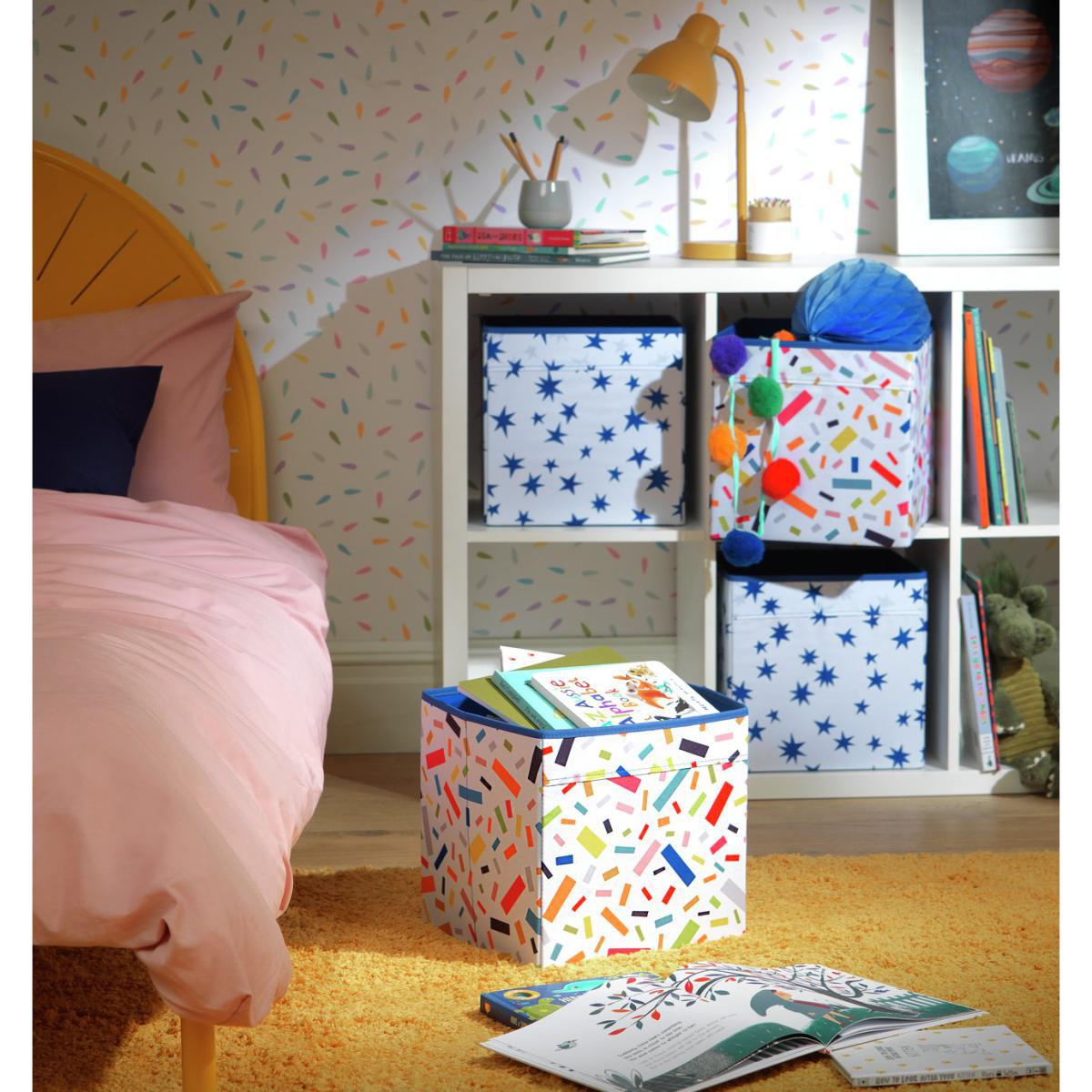 Who says tidying up isn't fun? Kids will love keeping their bits and bobs in our colourful canvas storage boxes. Pop these clever cubes open when you need them. Fold them flat when you don't. Girls and boys can use them to store their toys, books, clothes, or games. Pretty patterns brighten up your kid's bedroom, while keeping things tip top tidy. Neat. Folds for storage. Box size H28, W28, D28cm. Weight 1.8kg. Self-assembly. General Information:Manufacturer's 1 year guarantee.