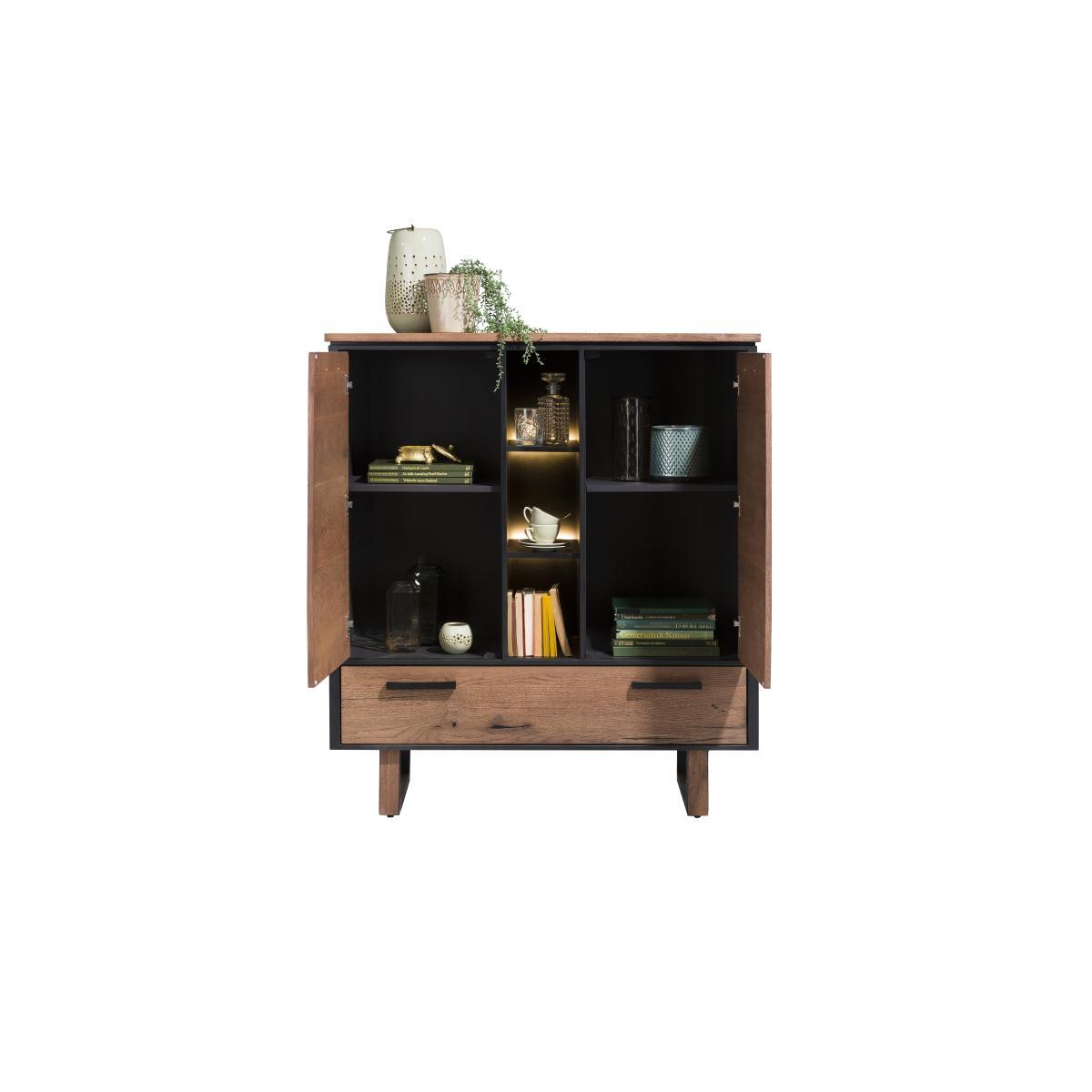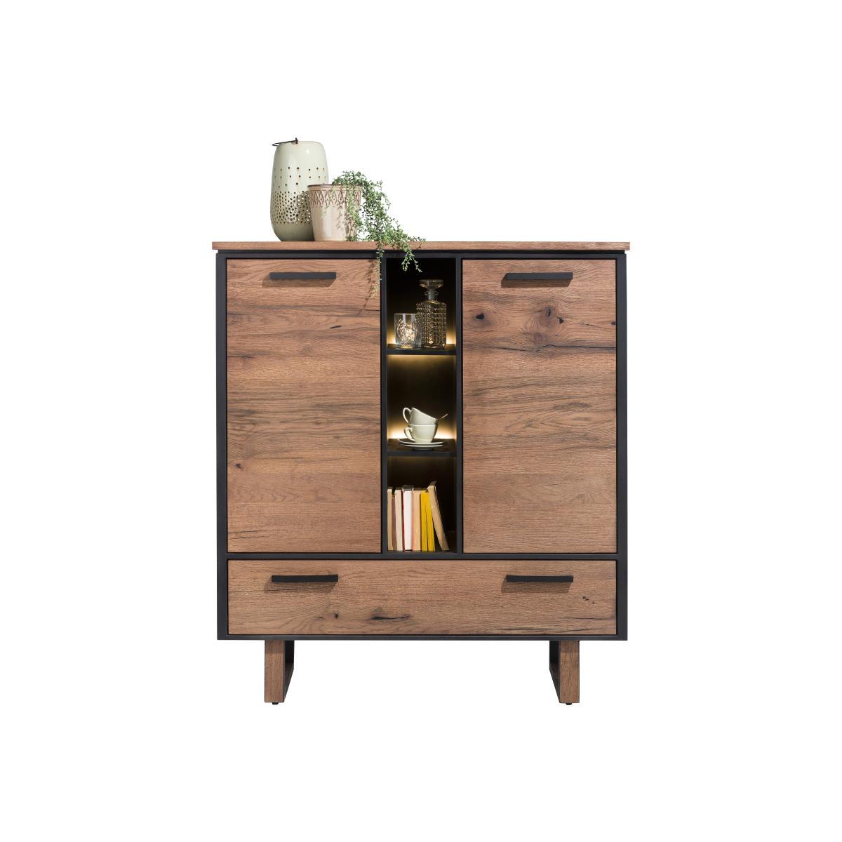 Introducing Austin from design experts Habufa, an extensive modern dining and occasional range in natural oak with bold, linear dark metal detailing. A low sheen lacquer finish brings out the warm oak veneers, while black wax infused into the grain adds an industrial edge. Clever touches include reversible dining table legs, soft close drawers, LED lighting and comfortably contoured dining chairs. Discover tables in every size, stylish chairs and bar stools, and a huge choice of occasional and storage pieces at great value prices. Austin suits the Nordic Fusion look, which blends Nordic design with clean lined Japanese style. This modern highboard offers plenty of storage in its soft close cupboards and drawer and cubby holes. In smooth natural oak and dark metal, with inbuilt LED lighting. Why you'll love it. Striking modern oak highboard from Habufa. Versatile storage for your dining or living room. Smooth oak veneers with a low sheen lacquer finish. Black wax infused into the wood grain adds an Industrial edge. Stylish linear dark metal drawer and door handles. Soft close drawer and cupboards. Cubby holes with subtle LED lighting. Horseshoe shaped dark metal legs. High quality design and finish for a fantastic value price. What you need to know. Designed by famous Dutch furniture makers Habufa. Responsibly made to last, with very little waste. 1 wide drawer, 2 large cupboards and 3 open cubby holes. The 2 cupboards have 1 fixed shelf behind each door. The linear metal detailing is anthracite coloured. Oak has natural markings, knots and colour variations. Each piece is unique, no two are the same. Slight differences compared to the models shown are to be expected. Be sure to tighten the leg bolts every three to four months. Easy to clean, simply wipe with a damp cloth. The low sheen lacquer finish offers some protection but the natural wood finish means placemats are essential. Part of the extensive Austin dining range which includes a wide choice of fixed and extending dining tables, bar tables, occasional furniture and storage pieces. WARNING!. Furniture can tip over unexpectedly and cause injury. This item should be fixed to a wall using the anti-tip kit provided with the furniture. Be sure to use the correct wall fixings suitable for the walls in your home.