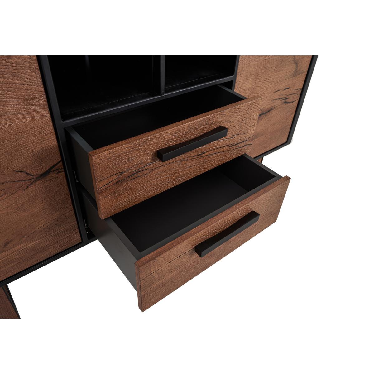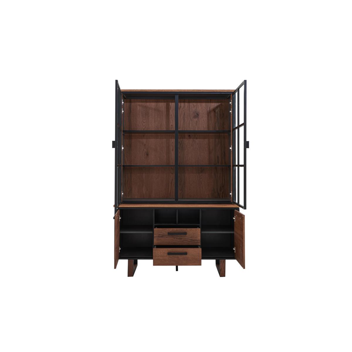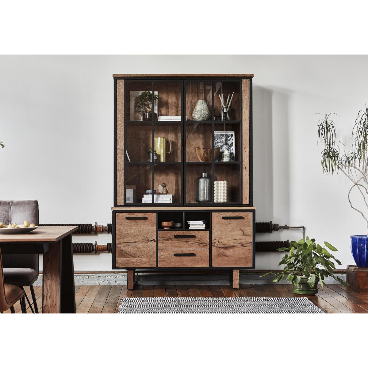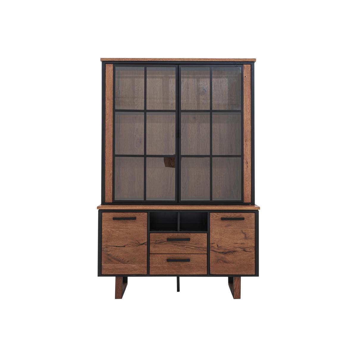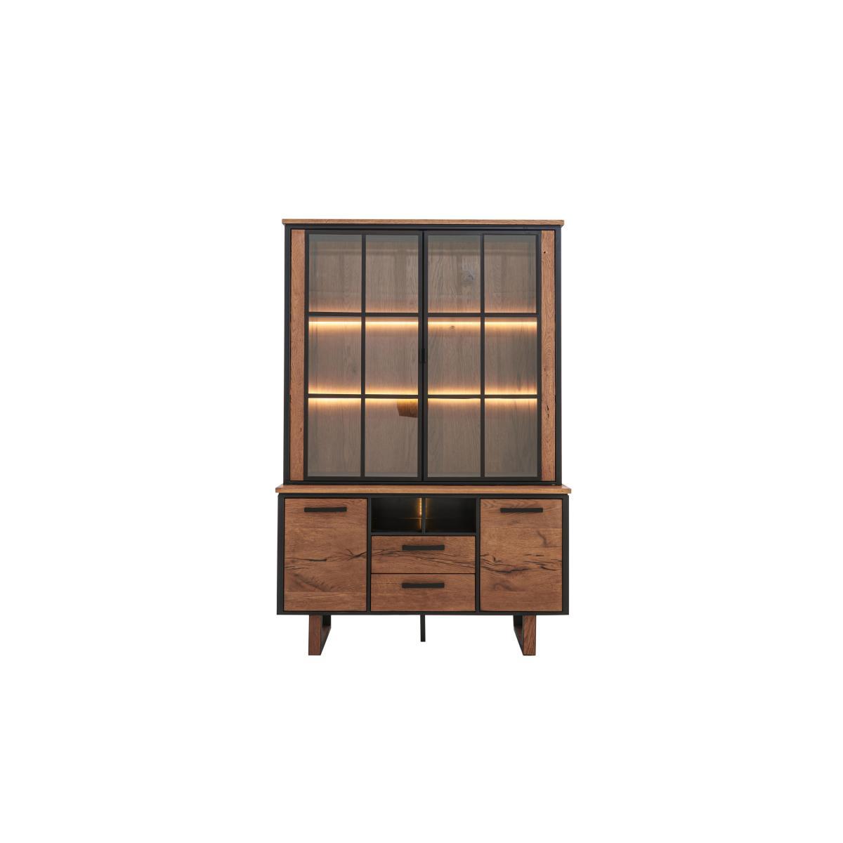Introducing Austin from design experts Habufa, an extensive modern dining and occasional range in natural oak with bold, linear dark metal detailing. A low sheen lacquer finish brings out the warm oak veneers, while black wax infused into the grain adds an industrial edge. Clever touches include reversible dining table legs, soft close drawers, LED lighting and comfortably contoured dining chairs. Discover tables in every size, stylish chairs and bar stools, and a huge choice of occasional and storage pieces at great value prices. Austin suits the Nordic Fusion look, which blends Nordic design with clean lined Japanese style. This impressively large modern oak display cabinet from Habufa has all the storage you need. Inbuilt LED lighting shows off your treasured possessions. Striking, modern oak display cabinet from Habufa. Versatile, spacious storage for your dining or living room. Smooth oak veneers with a low sheen lacquer finish. Black wax infused into the wood grain adds an Industrial edge. Large shelved display area behind glass doors. Stylish linear dark metal drawer and door handles. Soft close drawers and cupboards. Subtle LED lighting. Horseshoe shaped dark metal legs. High quality design and finish for a fantastic value price. What you need to know. Designed by famous Dutch furniture makers Habufa. Responsibly made to last, with very little waste. 2 drawers, 2 cupboards and 2 open cubby holes. The 2 cupboards each have 1 fixed shelf. The linear metal detailing is anthracite coloured. Oak has natural markings, knots and colour variations. Each piece is unique, no two are the same. Slight differences compared to the models shown are to be expected. Be sure to tighten the leg bolts every three to four months. Easy to clean, simply wipe with a damp cloth. Part of the extensive Austin dining range which includes a wide choice of fixed and extending dining tables, bar tables, occasional furniture and storage pieces. WARNING!. Furniture can tip over unexpectedly and cause injury. This item should be fixed to a wall using the anti-tip kit provided with the furniture. Be sure to use the correct wall fixings suitable for the walls in your home.