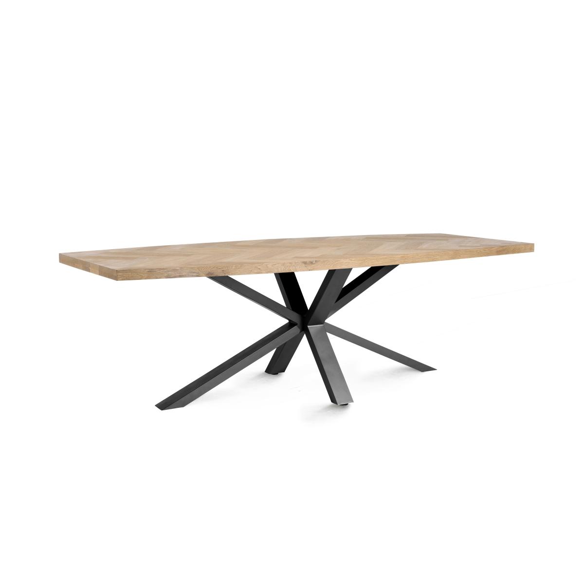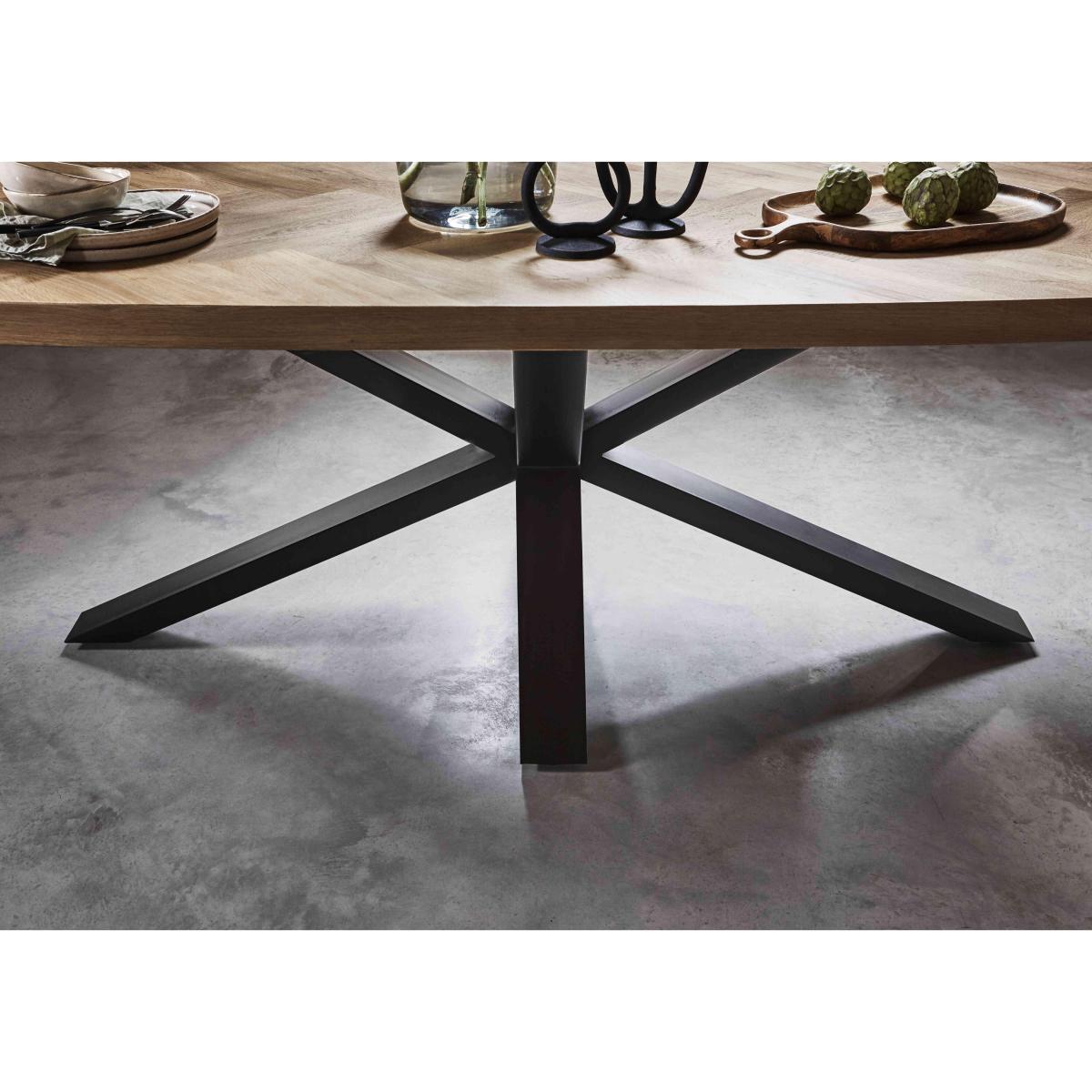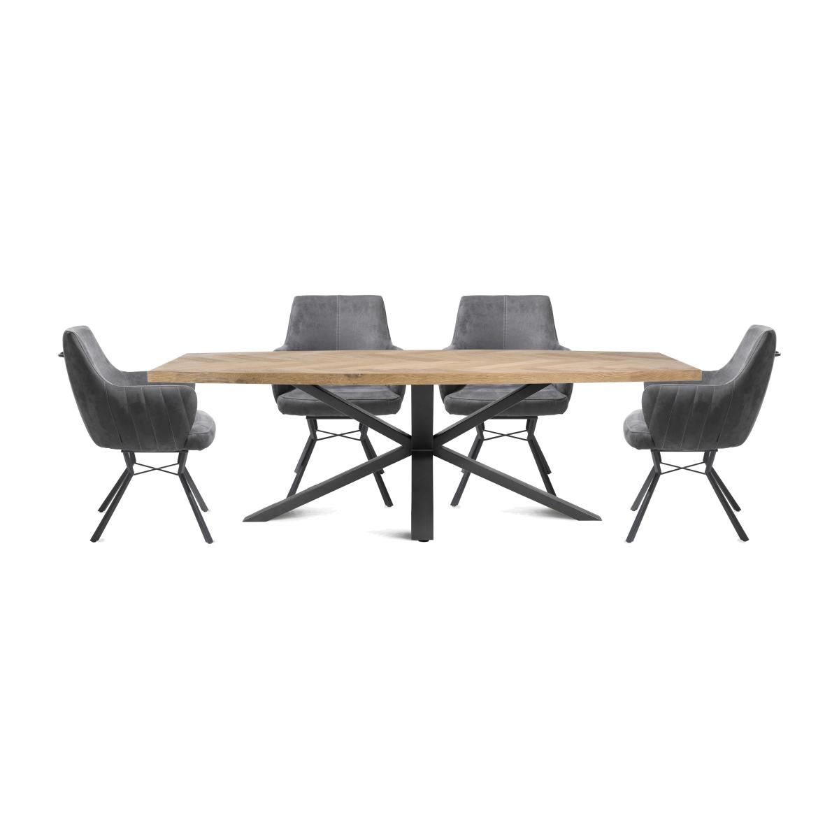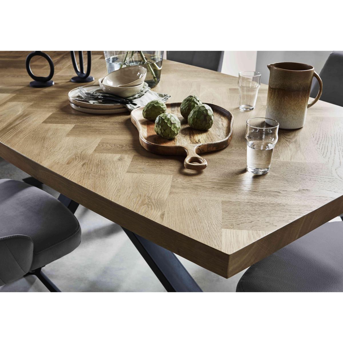 The Habufa Cleveland range is one of the most striking – yet understated – iterations of industrial style yet. The soft curves of its boat-shaped dining table and the clean lines of its many sideboards, TV units and occasional pieces elevate the natural oak veneer and metal finish into a design aesthetic that’s well out of the ordinary. The range’s dining table, offered in a choice of two sizes, features a handcrafted marquetry top in a timeless herringbone design supported by a black metal starburst base – the perfect balance of contemporary style and wonderful craftsmanship. This extensive collection also includes dining sets, dining chairs and dining armchairs. This Habufa dining set is the perfect combination of on-trend style, wonderful craftsmanship and dining comfort. Dining chairs have supportive backs and arms and self-righting swivel bases. Why you'll love it Striking dining set combines on-trend urban style with fabulous craftsmanship. Contemporary industrial style with elegant design details. Elegant boat-shaped dining table with a natural oak veneer finish. Table top has beautiful handcrafted marquetry in a herringbone pattern. With 4 swivel dining armchairs in soft faux leather in a choice of colours. High-quality cushioning for comfort with support. Self-righting swivel mechanisms and handles for manoeuvrability. This dining set is part of the Habufa Cleveland range. What you need to know Chairs have black metal legs and foam cushioning. Oak veneer dining table top. Table is 240 cm wide and seats 8. As oak is a natural material, knots and markings are to be expected. Avoid placing in direct sunlight or close to a heat source. We recommend using placemats and coasters at all times. Metal may show welding marks.