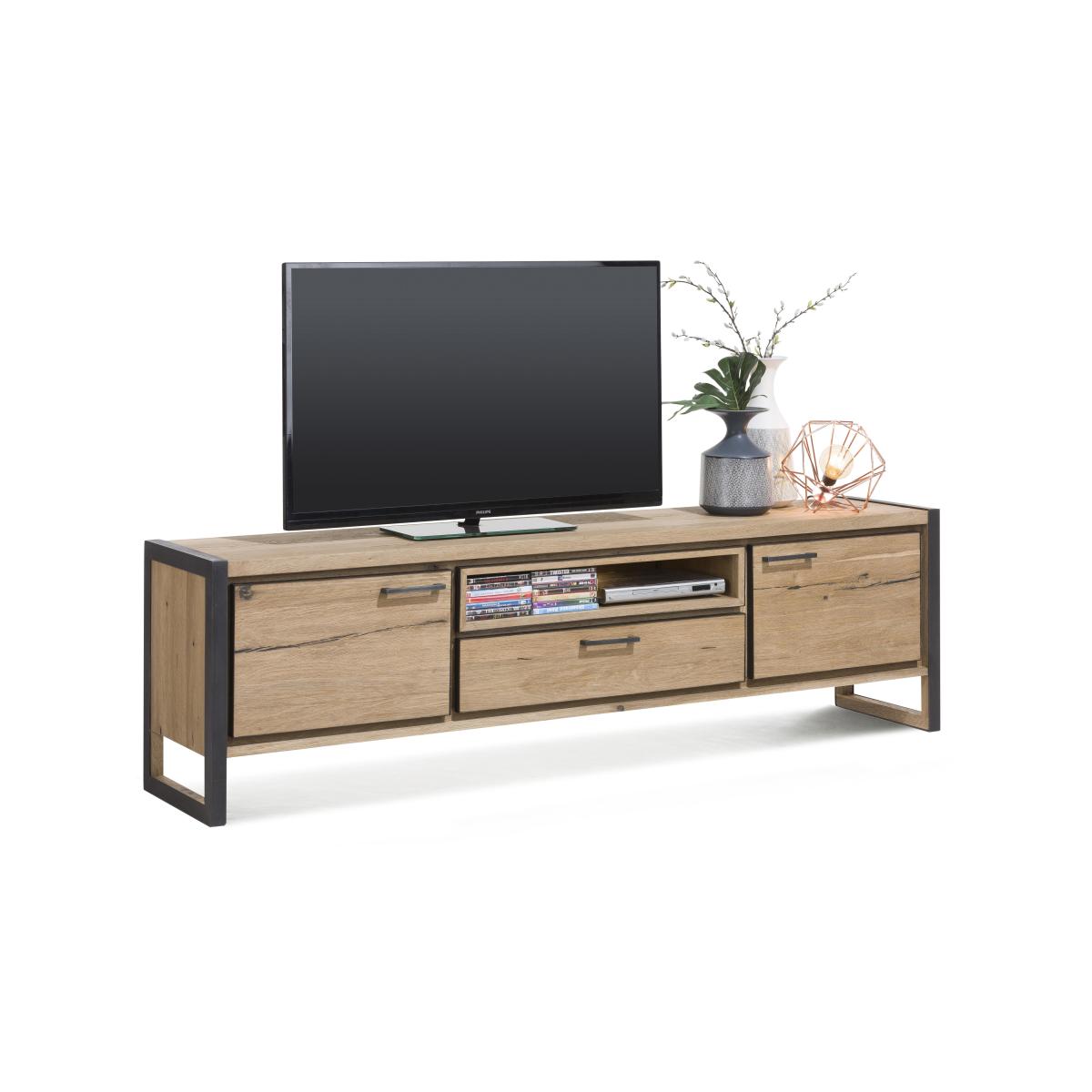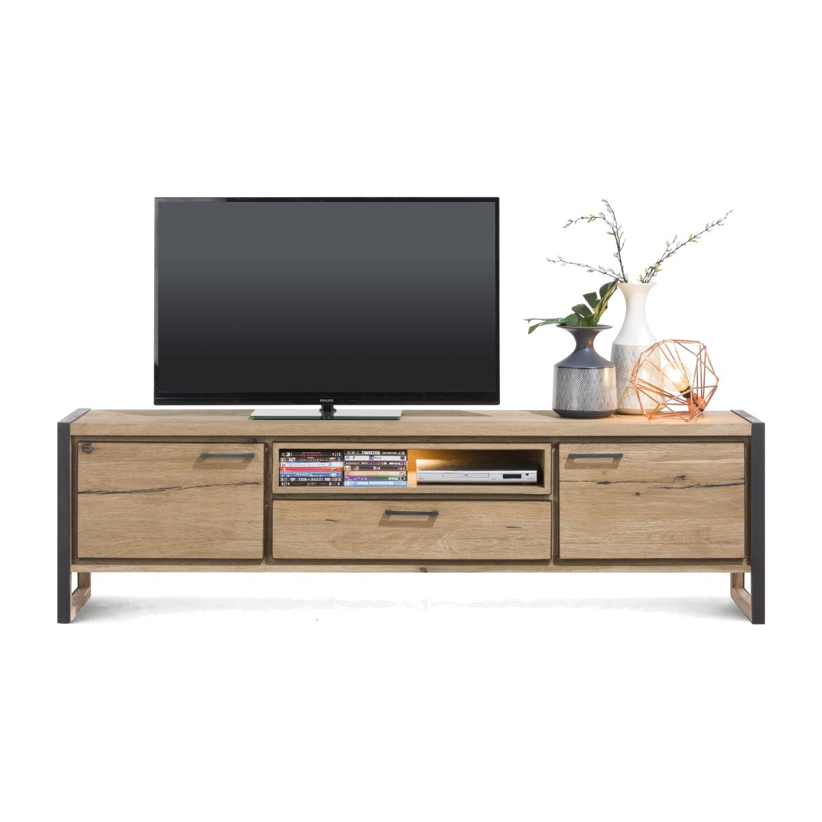 The Habufa Cleveland range is one of the most striking – yet understated – iterations of industrial style yet. The soft curves of its boat-shaped dining table and the clean lines of its many sideboards, TV units and occasional pieces elevate the natural oak veneer and metal finish into a design aesthetic that’s well out of the ordinary. The range’s dining table, offered in a choice of two sizes, features a handcrafted marquetry top in a timeless herringbone design supported by a black metal starburst base – the perfect balance of contemporary style and wonderful craftsmanship. This extensive collection also includes dining sets, dining chairs and dining armchairs. This large TV unit makes light work of media storage and brings home sophisticated industrial style thanks to its high-end finish and natural oak veneer surfaces. Why you'll love it This large TV unit by Habufa is a stylish living room focal point. Contemporary industrial style with elegant design details. Natural oak veneer finish with black metal accents. Large alcove with LED lighting. Soft-close drawer and cupboard doors. This large TV unit is part of the Habufa Cleveland range. What you need to know 2 single-door cupboards each with a fixed shelf, 1 drawer, 1 alcove. As oak is a natural material, knots and markings are to be expected. Avoid placing in direct sunlight or close to a heat source. We recommend using placemats and coasters at all times. Metal may show welding marks. WARNING!