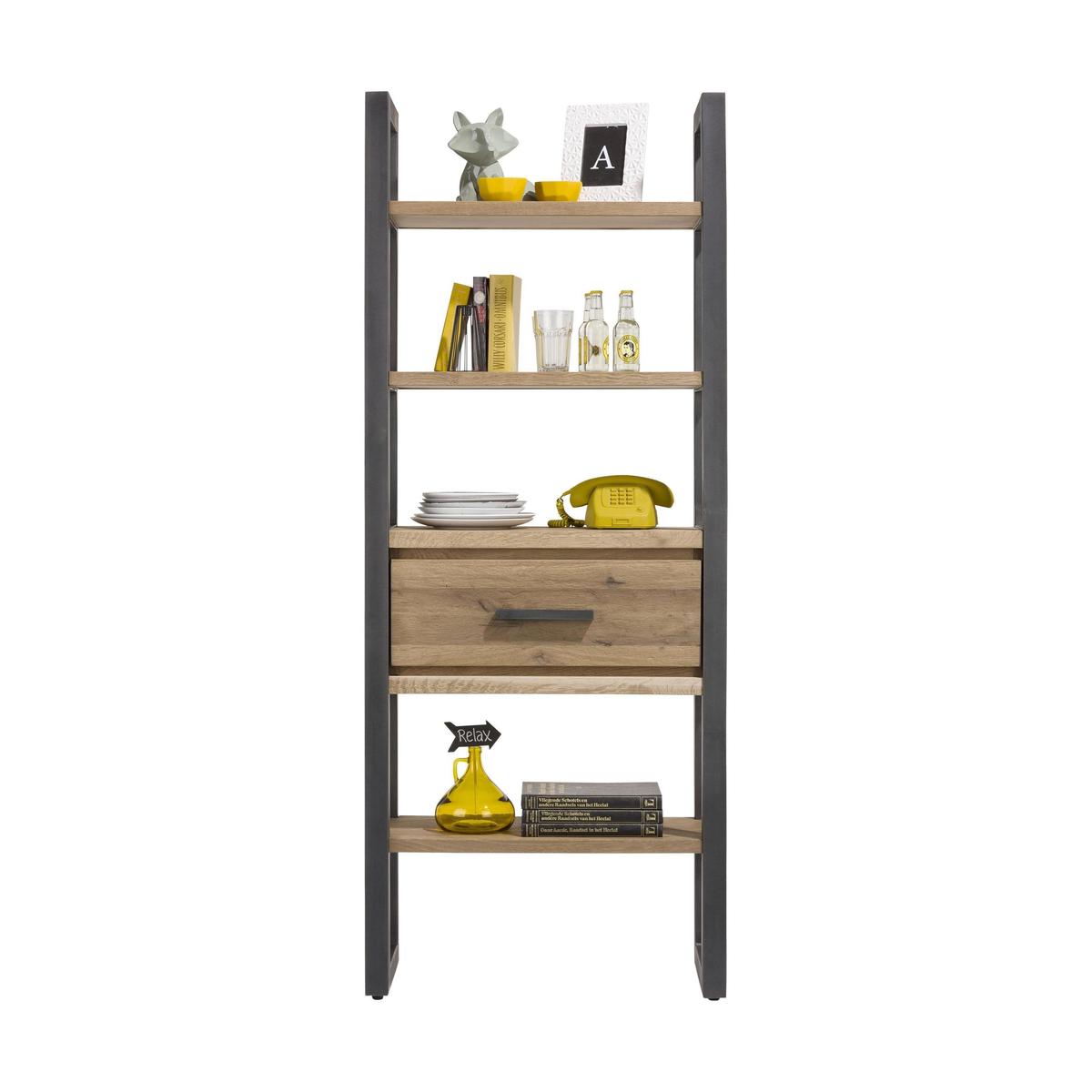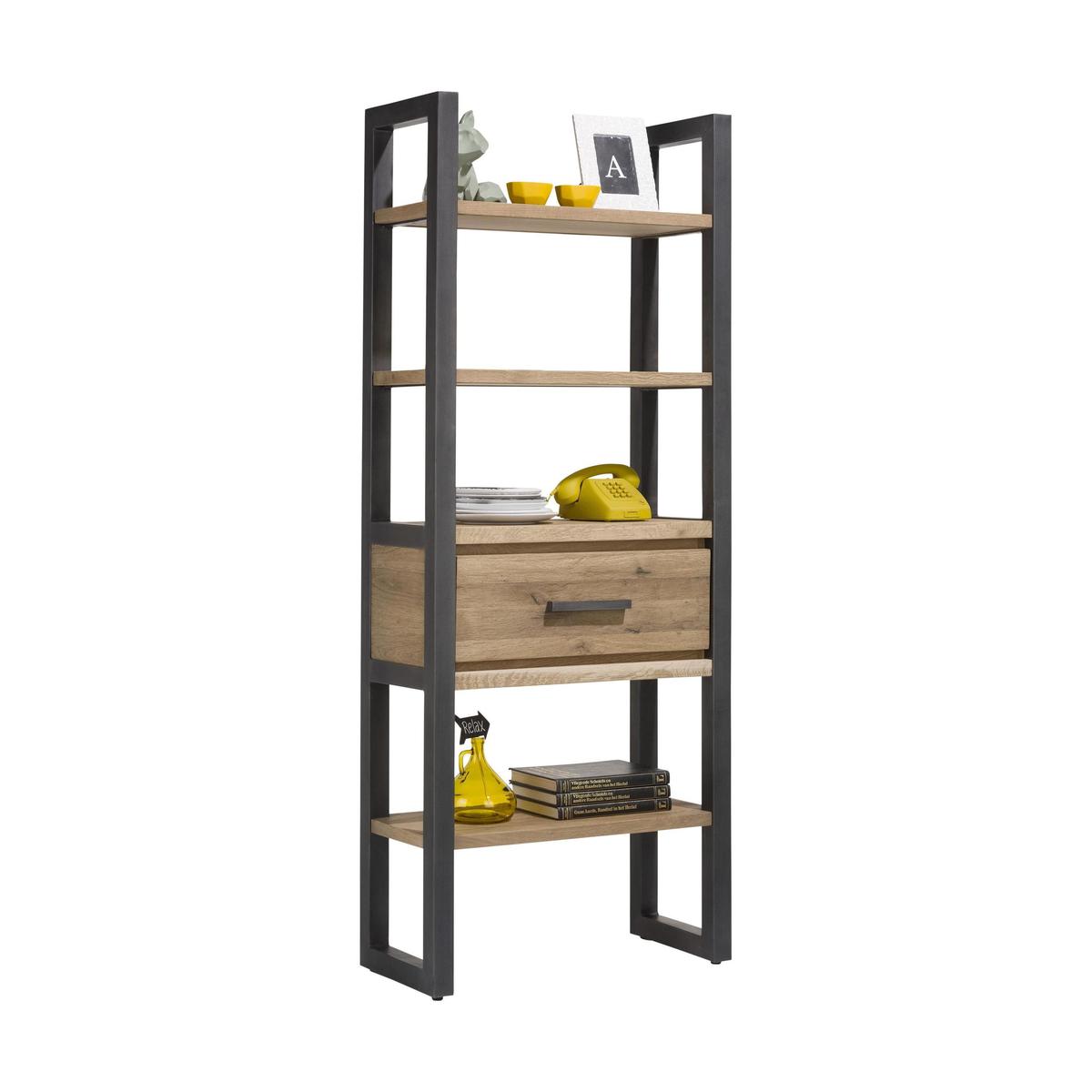 Detroit makes it easy to bring home the very current industrial trend. Perfectly imperfect oak surfaces with deliberately dark knots team with strong metal accents – metal-trimmed legs, borders on the ends of pieces, and drawer handles – in an aesthetic that’s confident and stylish. And with a range that includes sideboards, TV stands and dining tables, Detroit has plenty of function along with its modern, sophisticated form. Industrial-style wood and metal bookcase. Made of solid oak with oak veneers. Wood’s darker knots and splits give a handmade appearance. Distinctive metal frame. Open-plan design with 4 shelves and a useful drawer. Soft-close drawer has an elongated metal handle. Confident design and mixed materials for an on trend urban look. WARNING!. Furniture can tip over unexpectedly and cause injury. This item shall be fixed to a wall using the anti-tip kit provided with the furniture. Be sure to use the correct wall fixings suitable for the walls in your home. The wood used for this furniture is a unique product of nature, not one piece of wood is equal in shape, structure and colour. In time, the furniture will obtain a lighter and warmer colour through use and exposure to light, colour differences in comparison to showroom models are therefore expected.
