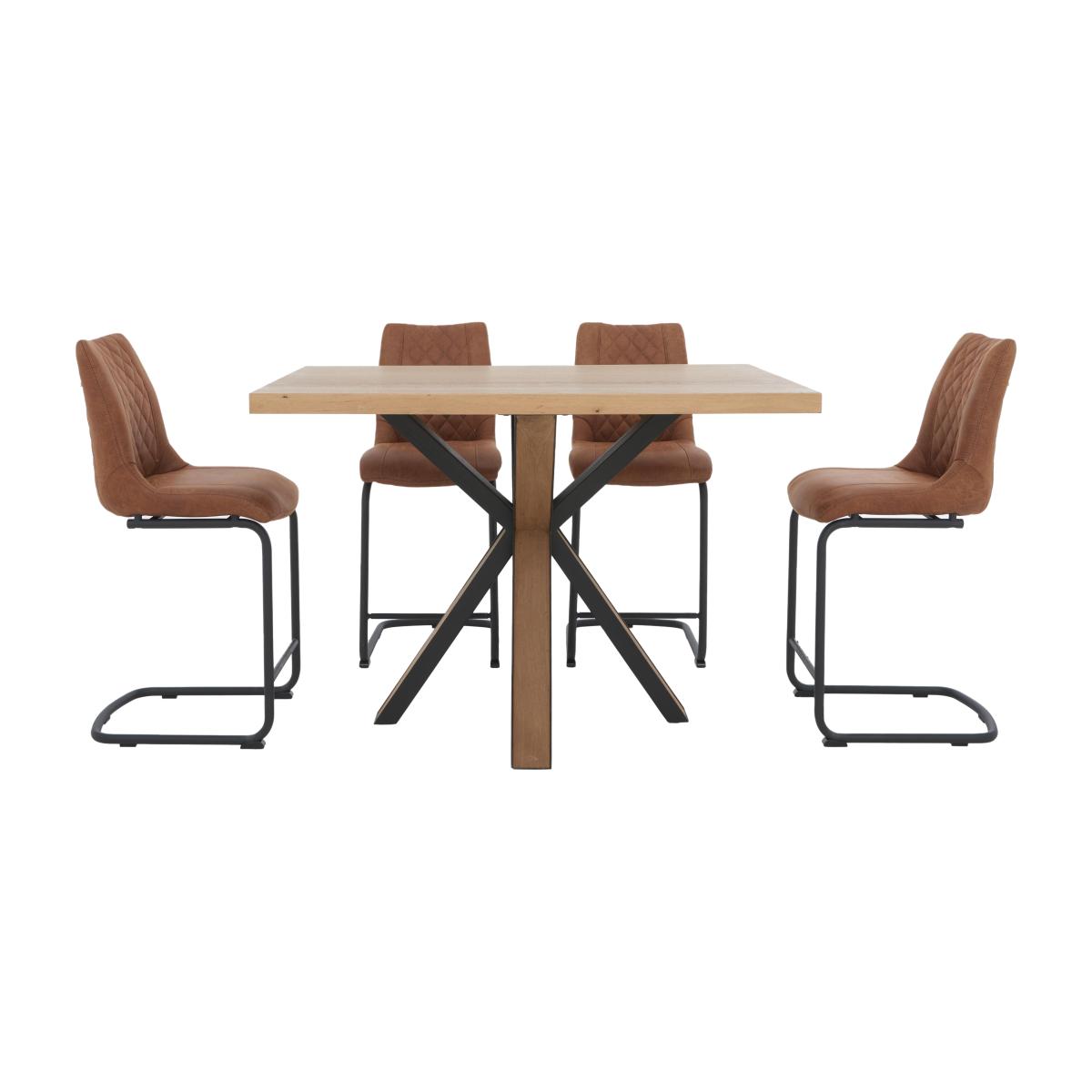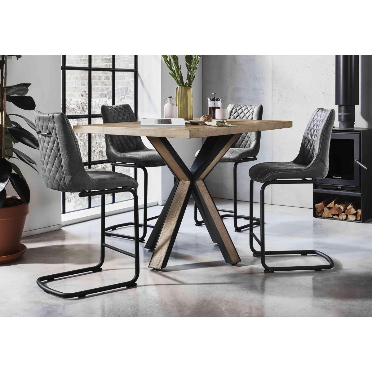 The Habufa Detroit collection makes it easy to bring home the ever-fashionable industrial trend. Delivering an aesthetic that’s confident and stylish, this well-crafted range features perfectly imperfect solid oak and oak veneer surfaces, rich in rustic character, and bold metal accents. This extensive range includes dining tables and dining sets, sideboards and display cabinets, and bar tables and media units, all of which showcase the most effective blend of understated design and beautiful, carefully chosen natural materials. Luxuriously upholstered dining chairs and bar stools provide an elegant counterpoint to the range’s oak finish while staying true to its stylish urban look. We’re in love with this Habufa bar table set. It’s designed for compact spaces, yet the rectangular bar table seats six comfortably. Those cantilever bar stools are the perfect pairing. Why you'll love it Innovative bar table set with rectangular table and cantilever bar stools. Industrial cool meets relaxed dining style. Rectangular bar table is compact in scale but seats 6 in comfort. Rustic oak top brims with character. Black metal starburst base has wood inlays. Ultra-comfy Baltimore bar stools have off-black metal cantilever bases. Soft faux leather upholstery with decorative stitching. Choice of colours. Bar stools have seat back hand grips for manoeuvrability. This bar table and bar stool set is part of the Habufa Detroit range. What you need to know Bar stools have metal frames and legs. Foam seat cushioning. Choose either one colour for all bar stools, or 2 of each colour. Bar stools require self-assembly. As oak is a natural material, knots and markings are to be expected. Avoid placing in direct sunlight or close to a heat source. We recommend using placemats and coasters.