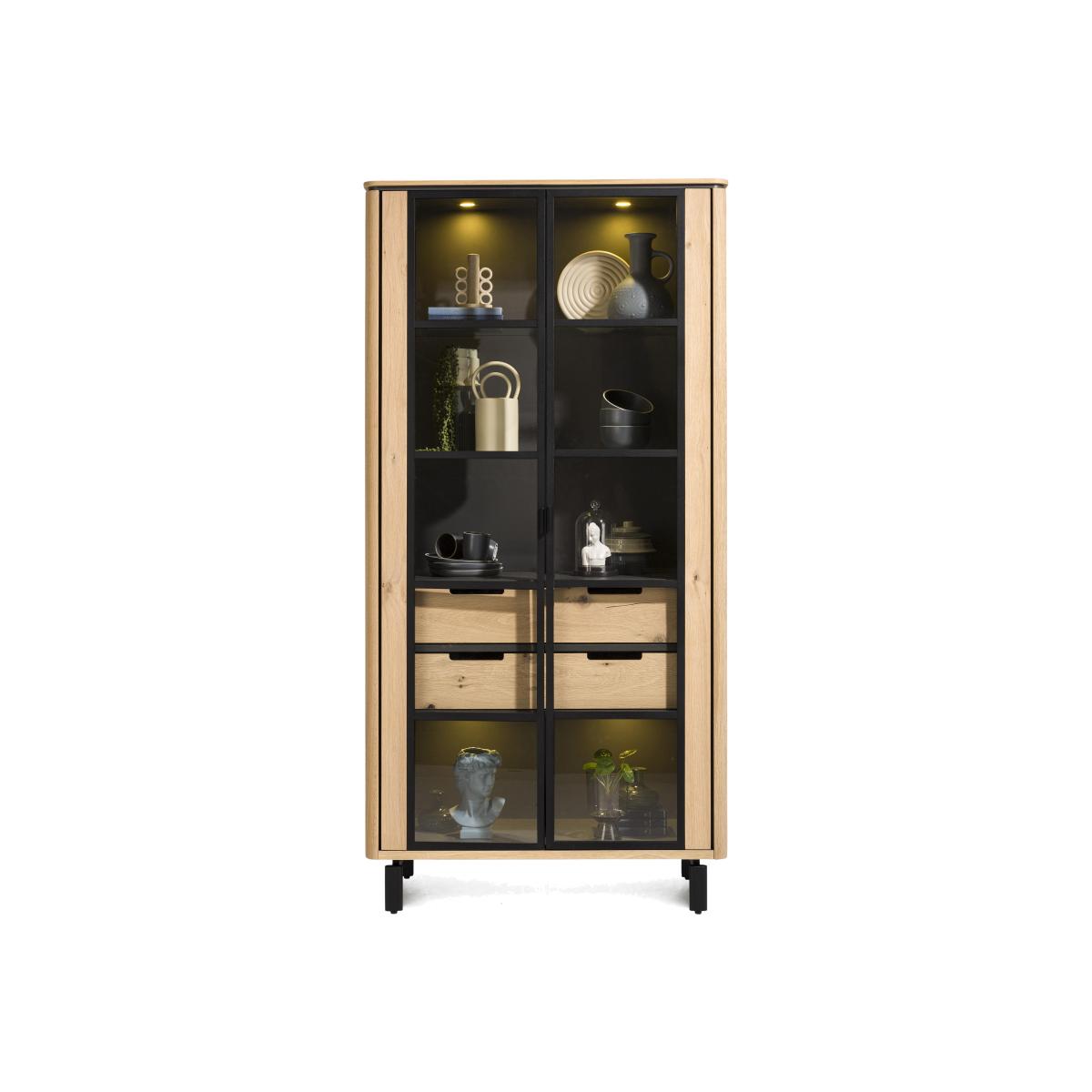 Thanks to its perfectly smooth oak veneer surfaces and finely crafted metal elements, Habufa’s Montreal collection showcases the evolution of industrial design from rustic and bold to elegant and refined. Above all, this is a range that offers a wealth of ways to customise your dining room furniture. Pieces are available in a choice of fashionable oak finishes. Dining tables are offered in three sizes and two different base styles – distinctive spider legs and bold U-shaped legs. And dining sets feature a choice of dining chair. The Habufa Montreal range also includes living room and dining room storage furniture and is exclusive to Furniture Village. Thoughtful design and contemporary industrial style come together – beautifully – in this striking tall glass-fronted display unit by Habufa. Why you'll love it This striking glazed display unit makes a wonderful living room focal point. Clean modern style with an industrial feel. Oak veneer in a choice of 4 beautiful finishes. Plenty of storage – 2 glass shelves and 2 drawers. Elegant details include curved edges and a slender top. Built-in LED lighting shines a spotlight on your favourite pieces. Drawers are soft-closing. This range is exclusive to Furniture Village. This glazed display unit is part of the Habufa Montreal range. What you need to know 2 full-width glass shelves. 2 full-width drawers. As oak is a natural material, knots and markings are to be expected. Avoid placing in direct sunlight or close to a heat source. We recommend using placemats and coasters at all times. WARNING!