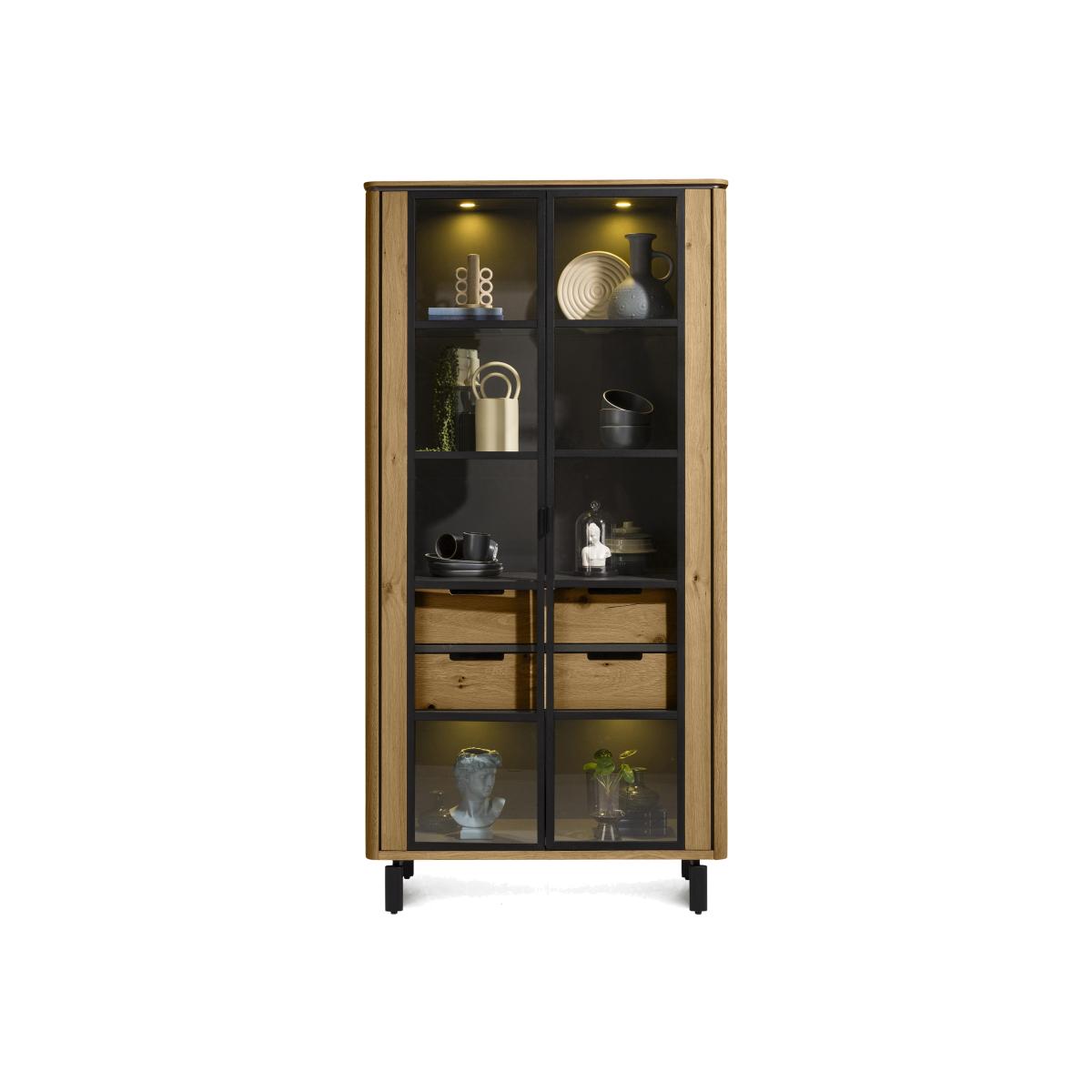 Thanks to its perfectly smooth oak veneer surfaces and finely crafted metal elements, Habufa’s Montreal collection showcases the evolution of industrial design from rustic and bold to elegant and refined. Above all, this is a range that offers a wealth of ways to customise your dining room furniture. Pieces are available in a choice of fashionable oak finishes. Dining tables are offered in three sizes and two different base styles – distinctive spider legs and bold U-shaped legs. And dining sets feature a choice of dining chair. The Habufa Montreal range also includes living room and dining room storage furniture and is exclusive to Furniture Village. Thoughtful design and contemporary industrial style come together – beautifully – in this striking tall glass-fronted display unit by Habufa. Why you'll love it This striking glazed display unit makes a wonderful living room focal point. Clean modern style with an industrial feel. Oak veneer in a choice of 4 beautiful finishes. Plenty of storage – 2 glass shelves and 2 drawers. Elegant details include curved edges and a slender top. Built-in LED lighting shines a spotlight on your favourite pieces. Drawers are soft-closing. This range is exclusive to Furniture Village. This glazed display unit is part of the Habufa Montreal range. What you need to know 2 full-width glass shelves. 2 full-width drawers. As oak is a natural material, knots and markings are to be expected. Avoid placing in direct sunlight or close to a heat source. We recommend using placemats and coasters at all times. WARNING!