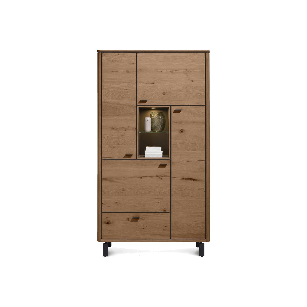 Thanks to its perfectly smooth oak veneer surfaces and finely crafted metal elements, Habufa’s Montreal collection showcases the evolution of industrial design from rustic and bold to elegant and refined. Above all, this is a range that offers a wealth of ways to customise your dining room furniture. Pieces are available in a choice of fashionable oak finishes. Dining tables are offered in three sizes and two different base styles – distinctive spider legs and bold U-shaped legs. And dining sets feature a choice of dining chair. The Habufa Montreal range also includes living room and dining room storage furniture and is exclusive to Furniture Village. There’s room for everything in this space-efficient tall highboard from Habufa and the glass-shelved illuminated alcove makes it a great display unit too. Why you'll love it This tall highboard gives you roomy storage in a smaller footprint. Clean modern style with an industrial feel. Oak veneer in a choice of 4 beautiful finishes. Plenty of storage – 4 cupboards, drawer and alcove. Elegant details include curved edges and a slender top. Alcove has built-in LED lighting. Soft-close drawer and cupboard doors. This range is exclusive to Furniture Village. This tall highboard is part of the Habufa Montreal range. What you need to know 4 single-door cupboards each with a fixed shelf, 1 drawer, 1 alcove. As oak is a natural material, knots and markings are to be expected. Avoid placing in direct sunlight or close to a heat source. We recommend using placemats and coasters at all times. WARNING!