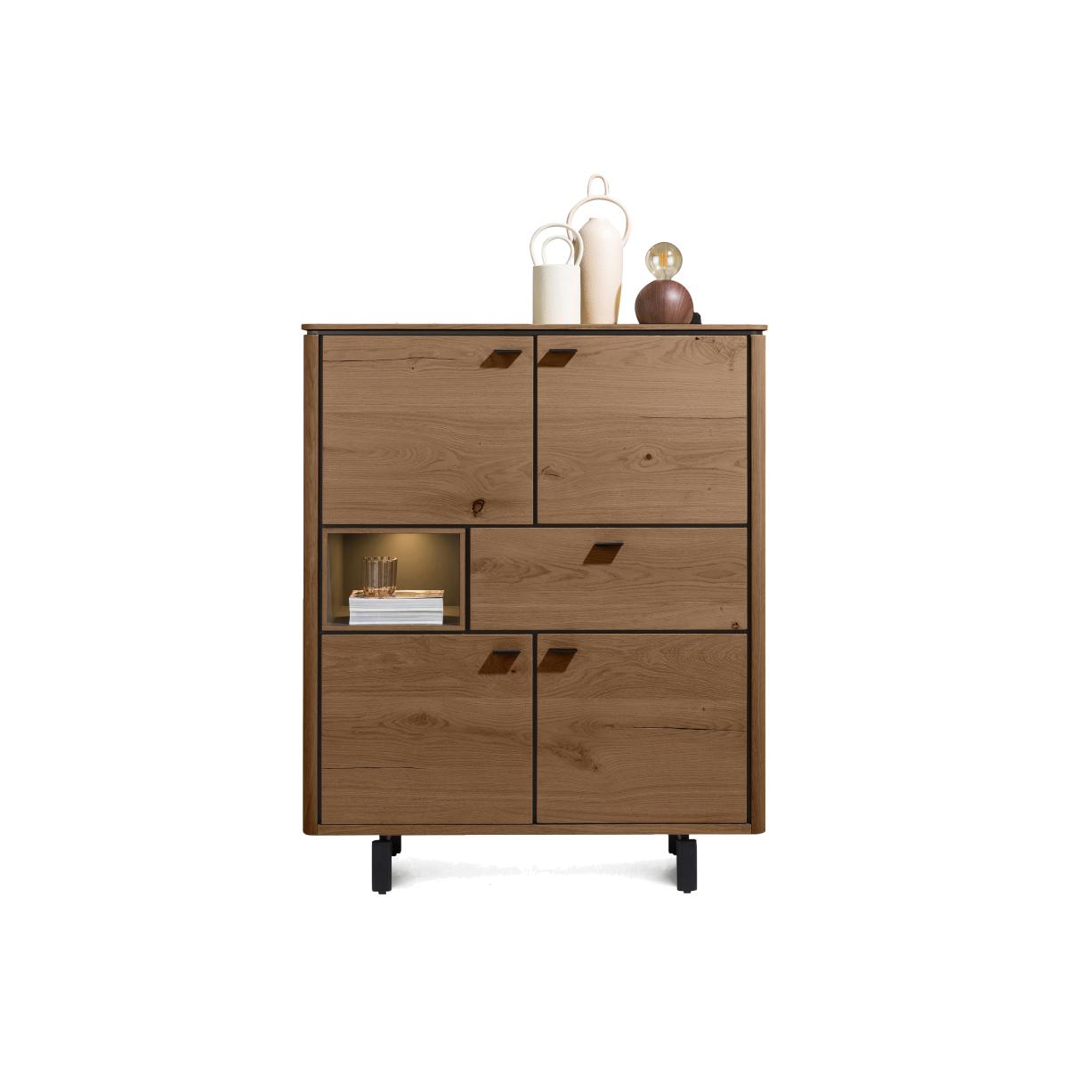 Thanks to its perfectly smooth oak veneer surfaces and finely crafted metal elements, Habufa’s Montreal collection showcases the evolution of industrial design from rustic and bold to elegant and refined. Above all, this is a range that offers a wealth of ways to customise your dining room furniture. Pieces are available in a choice of fashionable oak finishes. Dining tables are offered in three sizes and two different base styles – distinctive spider legs and bold U-shaped legs. And dining sets feature a choice of dining chair. The Habufa Montreal range also includes living room and dining room storage furniture and is exclusive to Furniture Village. If you’re short on floor space and need storage, then this Habufa highboard is the answer. It’s also very stylish, and the oak veneer finish comes in a choice of four looks. Why you'll love it Make the most of your space with this storage-rich wide highboard. Clean modern style with an industrial feel. Oak veneer in a choice of 4 beautiful finishes. Plenty of storage – cupboards, drawer and alcove. Elegant details include curved edges and a slender top. Alcove has built-in LED lighting. Soft-close drawer and cupboard doors. This range is exclusive to Furniture Village. This wide highboard is part of the Habufa Montreal range. What you need to know 2 double-door cupboards each with a fixed shelf, 1 drawer, 1 alcove. As oak is a natural material, knots and markings are to be expected. Avoid placing in direct sunlight or close to a heat source. We recommend using placemats and coasters at all times. WARNING!