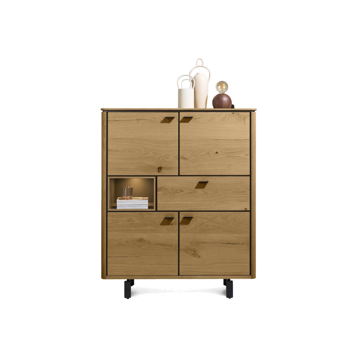 Thanks to its perfectly smooth oak veneer surfaces and finely crafted metal elements, Habufa’s Montreal collection showcases the evolution of industrial design from rustic and bold to elegant and refined. Above all, this is a range that offers a wealth of ways to customise your dining room furniture. Pieces are available in a choice of fashionable oak finishes. Dining tables are offered in three sizes and two different base styles – distinctive spider legs and bold U-shaped legs. And dining sets feature a choice of dining chair. The Habufa Montreal range also includes living room and dining room storage furniture and is exclusive to Furniture Village. If you’re short on floor space and need storage, then this Habufa highboard is the answer. It’s also very stylish, and the oak veneer finish comes in a choice of four looks. Why you'll love it Make the most of your space with this storage-rich wide highboard. Clean modern style with an industrial feel. Oak veneer in a choice of 4 beautiful finishes. Plenty of storage – cupboards, drawer and alcove. Elegant details include curved edges and a slender top. Alcove has built-in LED lighting. Soft-close drawer and cupboard doors. This range is exclusive to Furniture Village. This wide highboard is part of the Habufa Montreal range. What you need to know 2 double-door cupboards each with a fixed shelf, 1 drawer, 1 alcove. As oak is a natural material, knots and markings are to be expected. Avoid placing in direct sunlight or close to a heat source. We recommend using placemats and coasters at all times. WARNING!