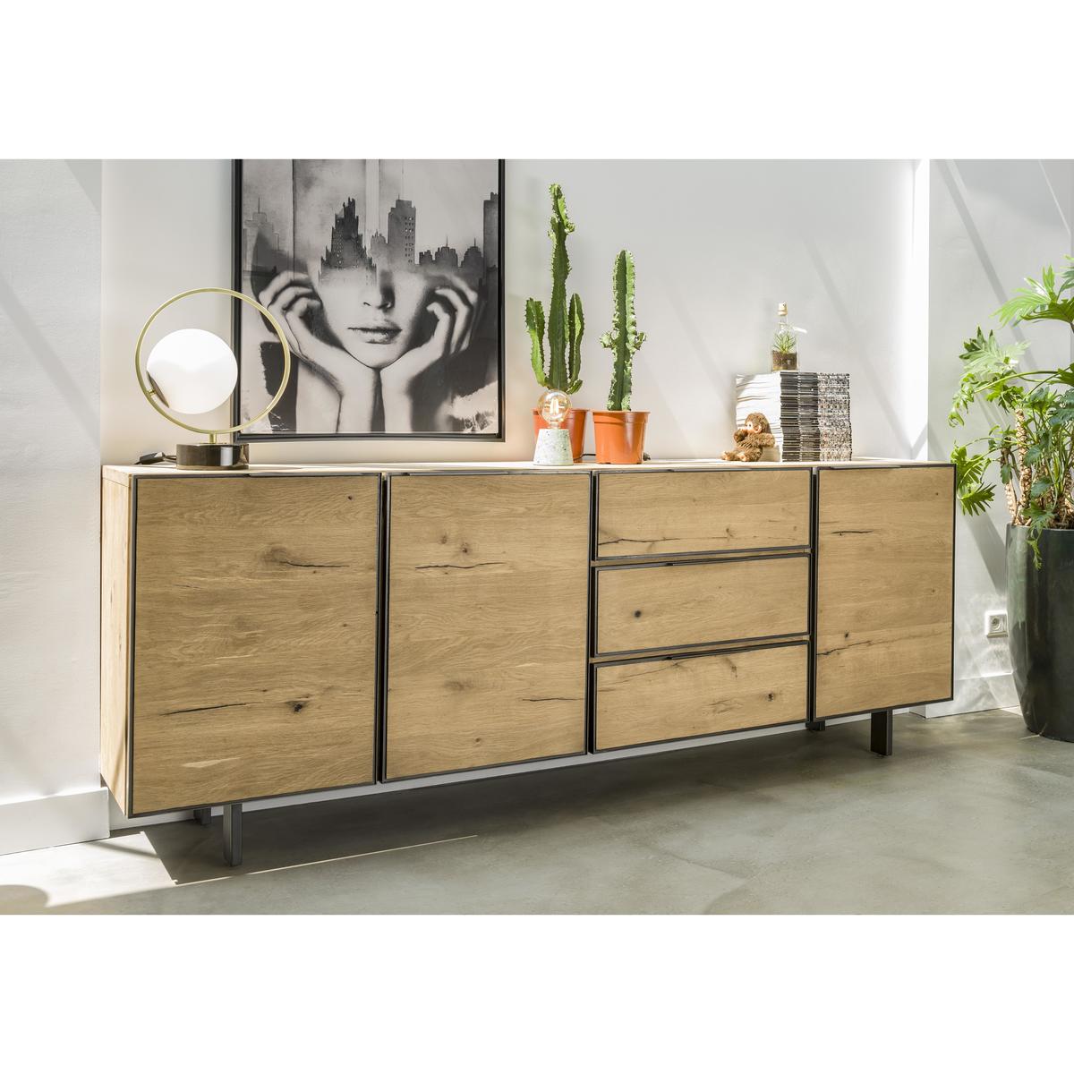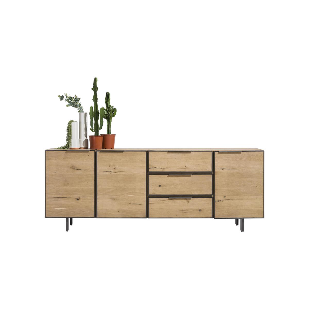 Beautifully crafted from solid oak and oak veneers. Spacious storage. Soft-close doors and drawers. The Sox 3 Door 3 Drawer Sideboard 240cm gives a cool, contemporary twist to classic sideboard storage. Crafted from solid natural oak and oak veneer, its warm tones are given a striking contrast with black metal edging for a distinctive style inspired by the popular industrial look. Behind the ultra-practical soft close doors and drawers, discover an adjustable shelf to house small and large items alike with plenty of space inside the roomy drawers. Accented by elegant, slimline legs for a light, contemporary silhouette, its authentic materials and modern design make for a truly simple and elegant addition to your home. The Sox 3 Door 3 Drawer Sideboard 240cm is part of the industrial-inspired Habufa Sox collection. For a stunning pairing, try the clean lines and elegant simplicity of the Sox Coffee Table. No two pieces of veneer or solid timber are the same, colour variances will occur. Avoid placing in direct sun or close to heat. Coasters and placemats are recommended.