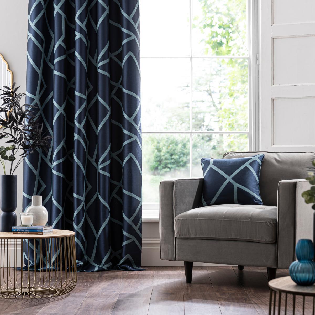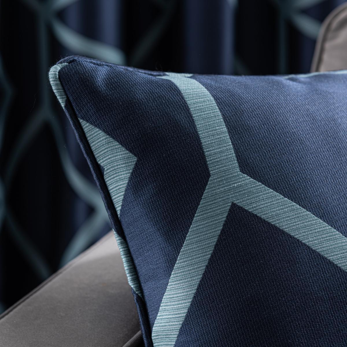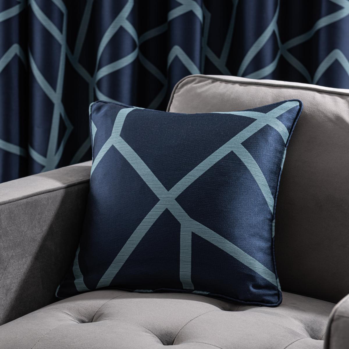 Our Hackney cushion features an architecturally inspired, woven jacquard design in a contemporary navy colourway. Featuring a piped edging detail, this cushion is feather filled for maximum comfort and styled with a removable cover for easy care. Coordinating curtains are available from the Hackney Luxury Collection.