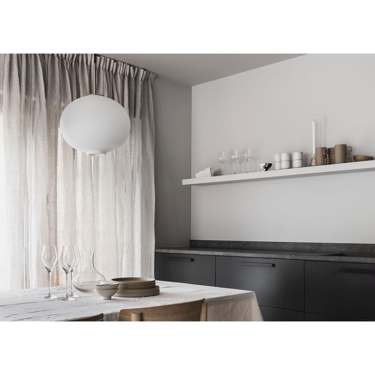 I love this pendant because of its clean, sculptural design - it's a versatile piece that adds a contemporary touch to various interiors. The large white glass shape offers a soft, diffused light, making it ideal for dining areas, kitchens, or open-plan living spaces where you want a statement but understated fixture. It works particularly well in minimalist, Scandinavian, or modern interiors, but can also provide a graphic contrast in more eclectic spaces. For styling tips, consider hanging it alone in a spacious room or in a cluster with smaller pendants at different heights to create visual interest. Pair it with neutral colour palettes or natural textures to keep the look fresh and sleek.