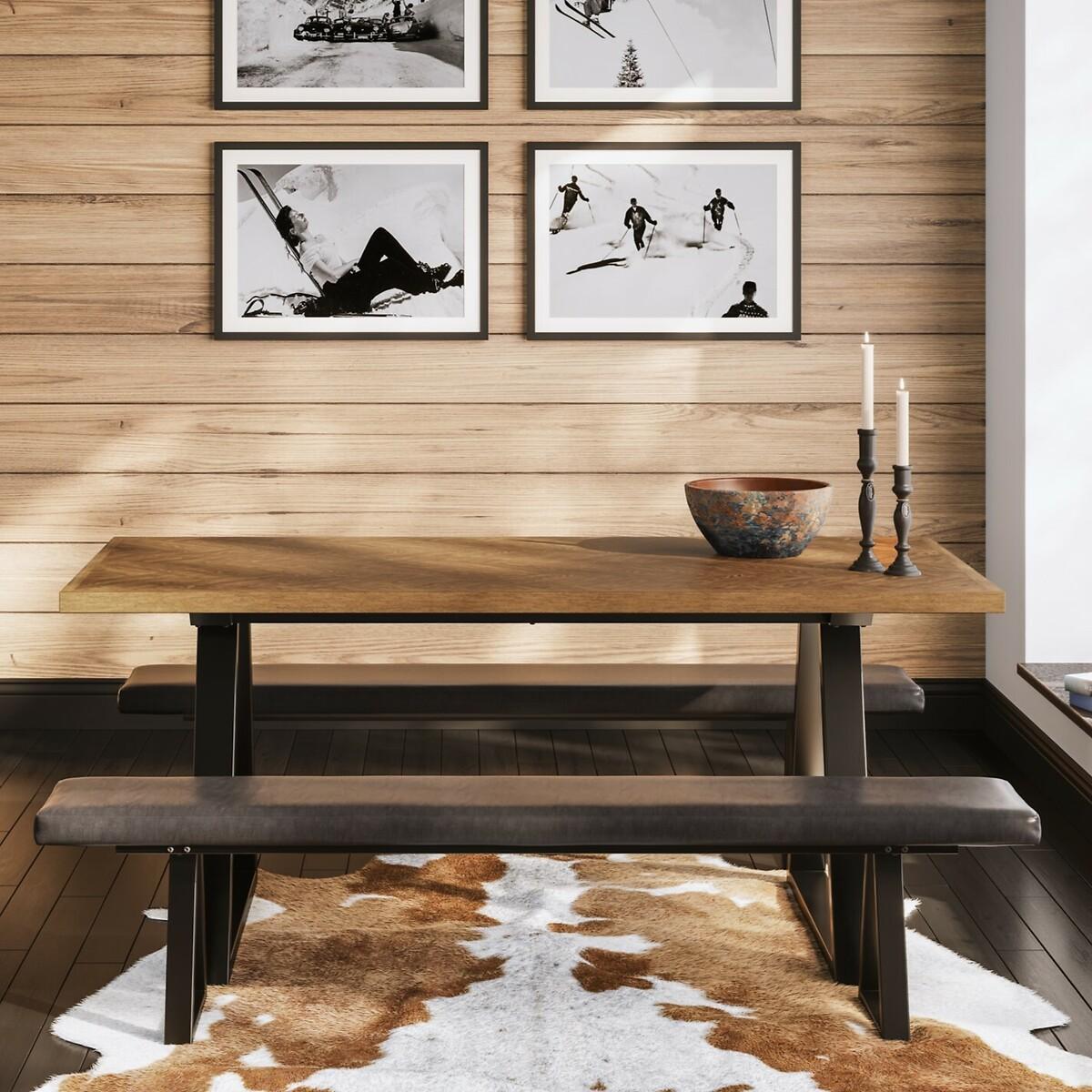 The Haden bench features a comfortable faux leather seat with channel stitched detail and a sturdy metal A-frame. Perfect for bringing an industrial touch to the dining room. Product Details • Faux leather upholstered seat • Seats 3-4 people • Metal frame • Foam fillings • Full assembly required • Care Instructions - Clean with a damp cloth or duster. Product Composition - PU, Metal. Product Dimensions - 35 cm x 180 cm x 45 cm , Weight - 2.3 KG • Seat height - 45 cm • Clearance to floor - 40 cm Parcel 1 Packaged Dimensions - 188 cm x 42 cm x 10 cm, Weight 9.55 KGParcel 2 Packaged Dimensions - 42 cm x 37 cm x 12 cm, Weight 3.75 KGPlease note: this product cannot be be delivered to all Offshore Islands, Scottish Highlands, Northern Ireland or Republic of Ireland. This product will be dispatched by one of our trusted suppliers. You’ll be contacted by their selected courier about your delivery.