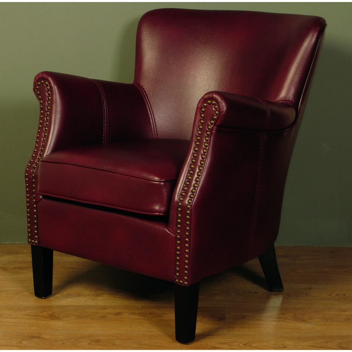 Designed with comfort and style in mind, the burgundy Hadfield armchair will be a stunning and practical addition to your living room. This chair has a strong, enduring frame and a comfortable seat cushion, and features smooth leather air fabric upholstery for a luxury look. A stylish, cosy and comfortable armchair for your living room or study. Classic wingback design that’s reminiscent of traditional, vintage furniture. Has a strong and durable frame. Sleek leather air fabric upholstery that gives the chair a luxurious and plush look. Stylish curvilinear design. Short strong legs with an elegant dark brown finish. Chic burgundy finish adds a layer of colour and warmth to the room. Traditional scrolled arms. Delicate metal stud detailing for a chic finishing touch. Dense and comfortable seat cushion. Also available in tan and brown leather air fabric upholstery.