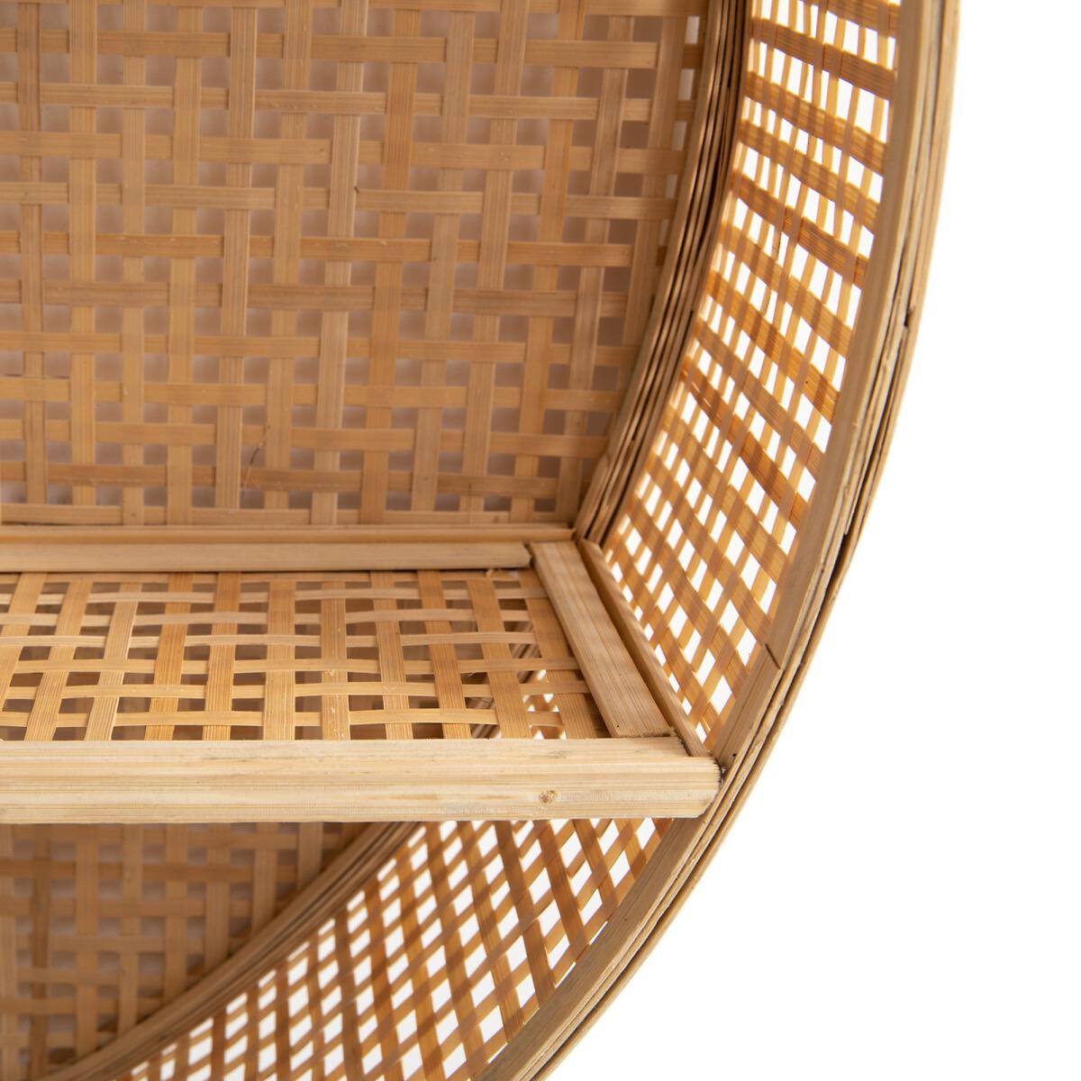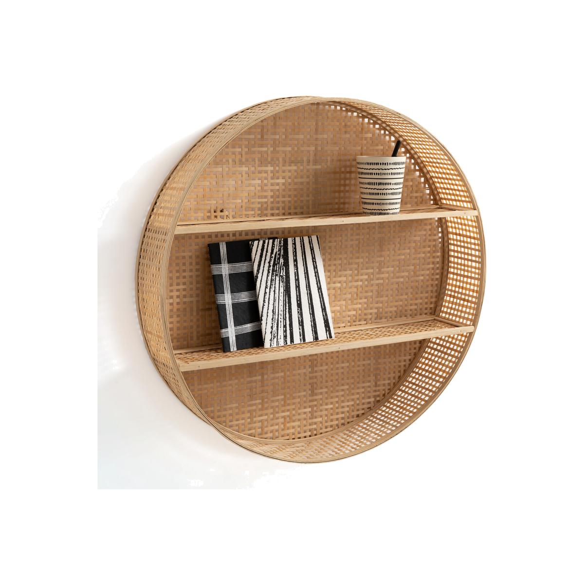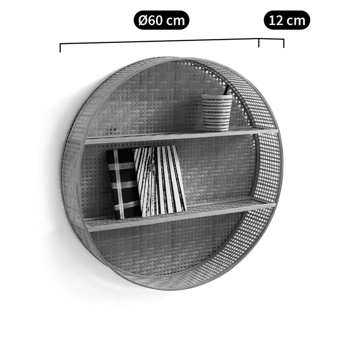 Product Details. Round bamboo shelf with braiding. 2 shelves. Wall fixing (screws and plugs not supplied). Max weight per shelf: 0.5kg. Dimensions. Diameter 60cm. Thickness 12cm. Height between the 2 tiers : 22cm Parcel dimensions and weight. 62 x 14 x 62cm. 2kg.