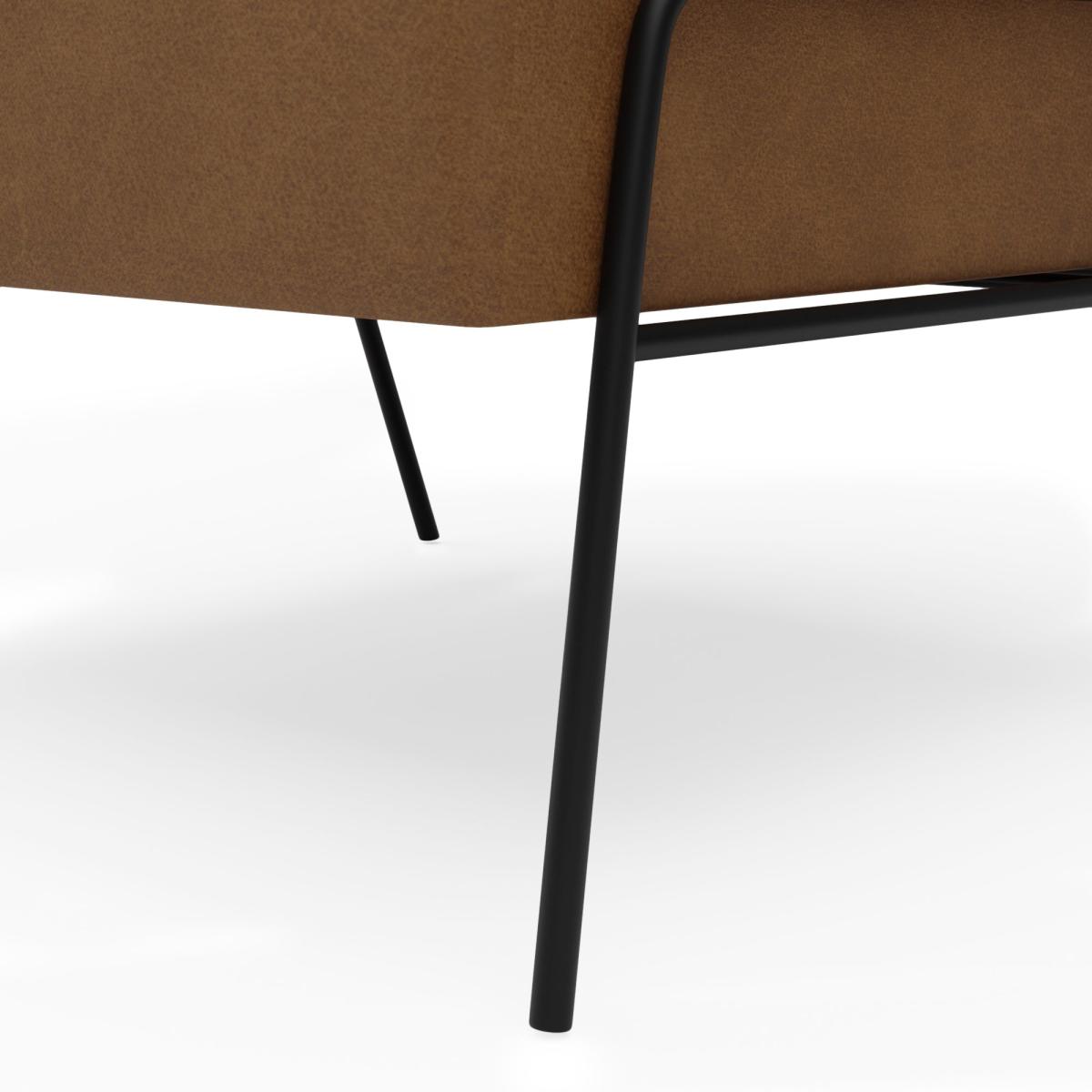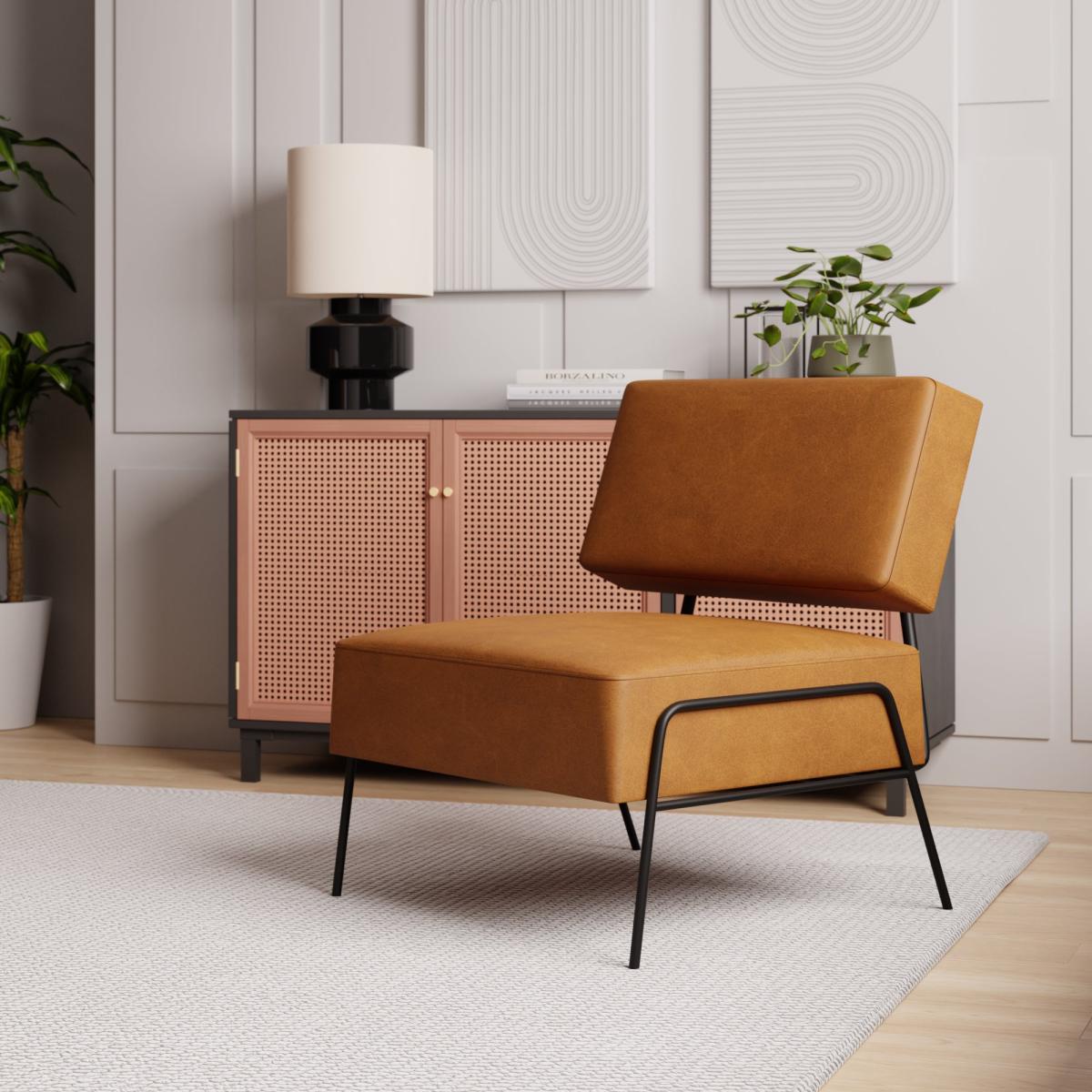 I love the Hadlee faux leather chair because it combines clean, modern lines with a touch of warmth, making it versatile for many interiors. Its rich brown tone adds depth and complements neutral colour schemes, while the faux leather finish offers a sleek, low-maintenance alternative to real leather. This chair works particularly well in contemporary or Scandinavian-inspired spaces, but can also add a stylish contrast within more eclectic or bohemian rooms. Practical styling tips include pairing it with textured cushions or a soft throw to add comfort, and anchoring it next to a statement side table or floor lamp to create a cosy reading nook. Its delicate metal legs give it a light, airy feel that can help prevent small spaces from feeling cluttered.
