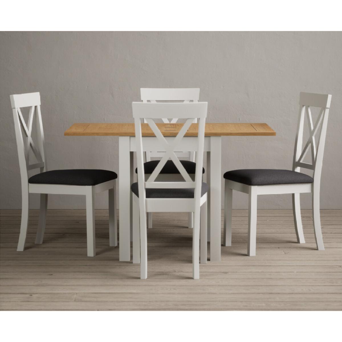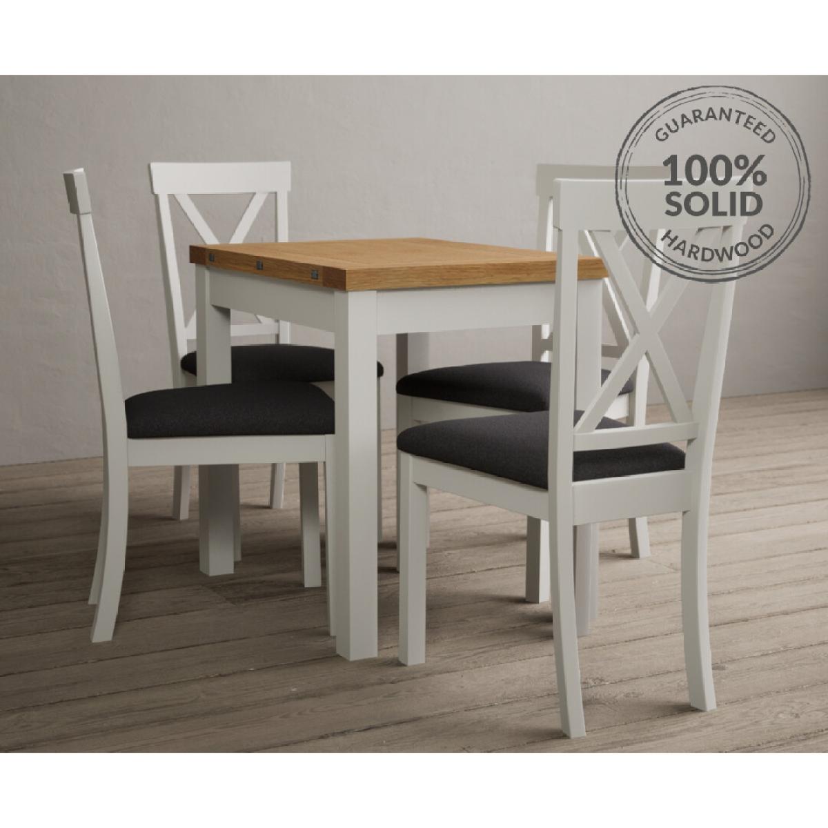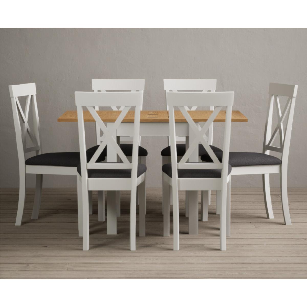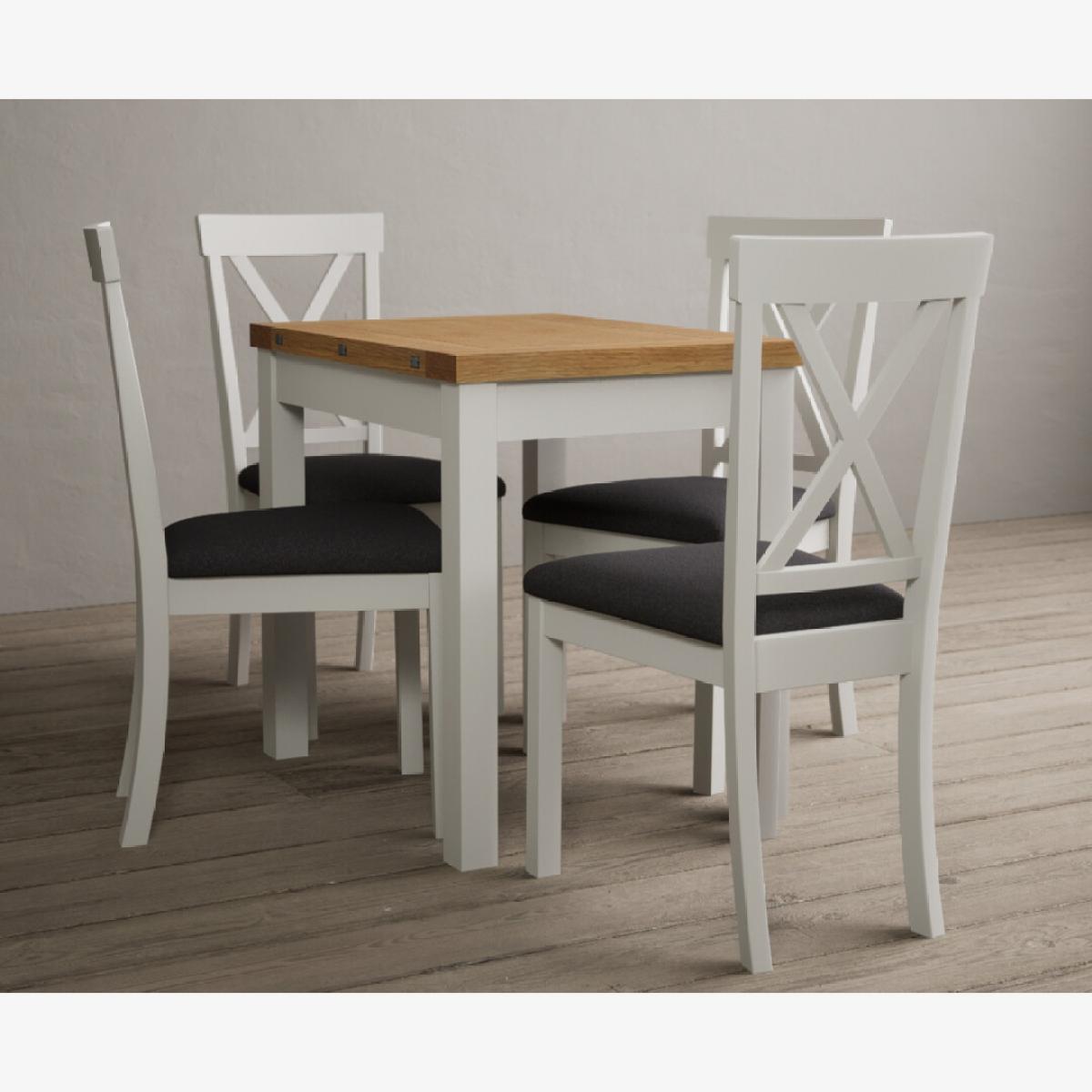 The Hadleigh Oak and Signal White Painted Extending Dining Table with Hertford Chairs is a stylish and versatile extending dining table set.