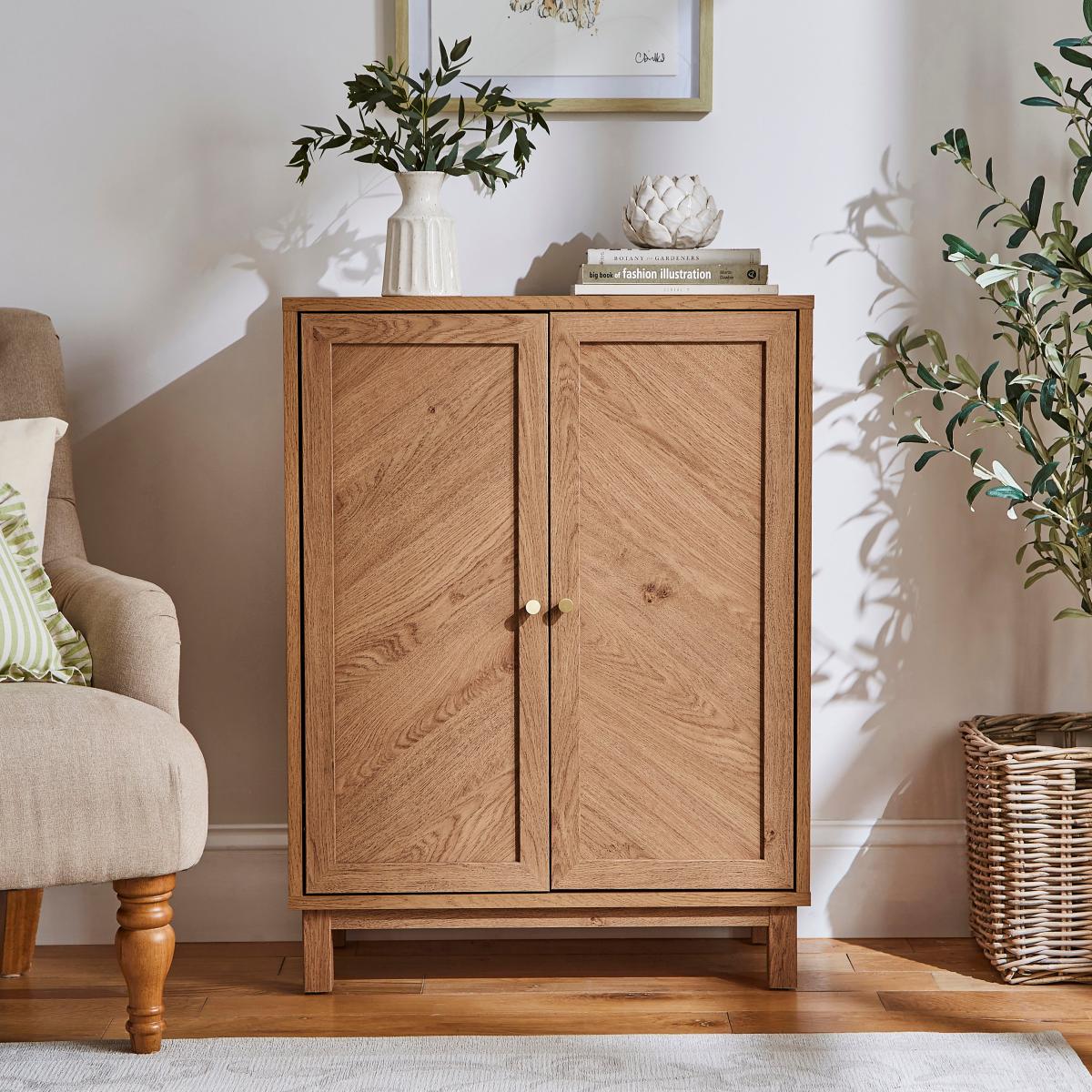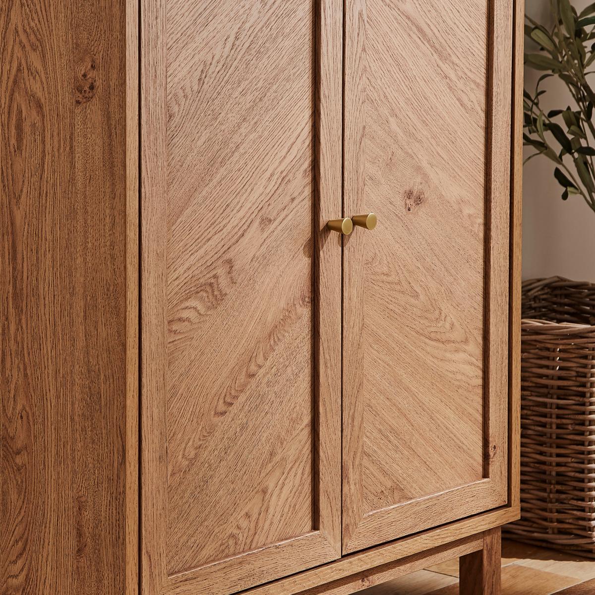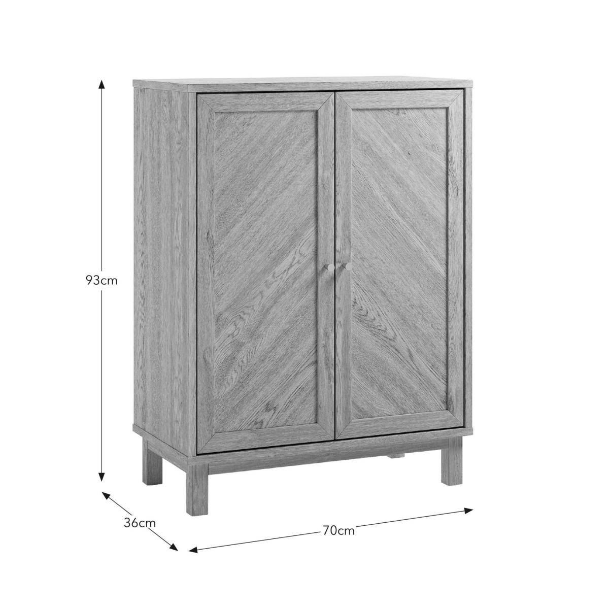 Save 10% on this item by using our DUN23AWFURN1. 0 code. Just enter the code when at the basket.  *Terms and conditions apply* Elevate your living space with the Hadley Tall Sideboard. Its stunning chevron, oak effect door face instantly grabs attention and adds a modern flair to your decor. The sideboard features a fixed shelf and an adjustable/removable shelf, allowing you to create the perfect storage configuration. The soft closing doors ensure gentle closure, while the metal handle adds a touch of elegance. Experience both style and functionality with this exquisite piece.