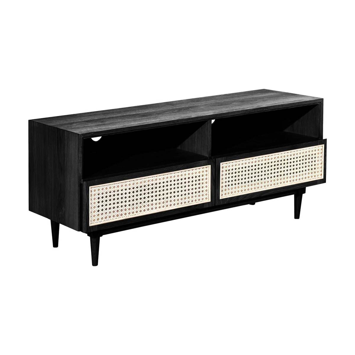 A striking spin on a practical piece of furniture, the Hague 2 drawer TV unit brings together handwoven wicker rattan and stained black wood. Featuring a sturdy oak frame with natural grains and markings, it suits a wide range of interior looks and colour schemes. Two open shelves provide space for your set-top box and consoles, while two handy drawers stow away anything that doesn’t need to be seen. The drawer’s beautiful cane fronts give the TV stand its signature look, a combination of natural and contemporary style. Also available in natural for a more bohemian feel.