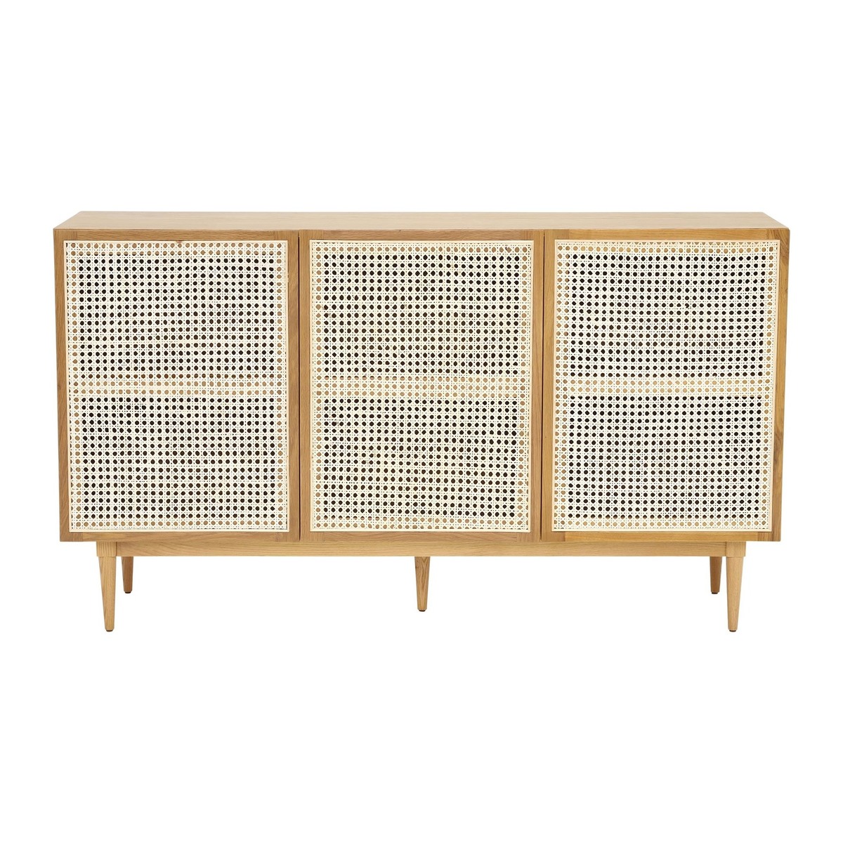Bringing the rattan trend back indoors, the Hague 3 door sideboard features charming cane door fronts that give a delicate touch to its wooden frame. Displaying natural wood grains and colourings, this oak sideboard oozes timeless style and quality. Inside, a fixed shelf make it easy to organise tableware, accessories and linen – but it works equally well outside of the dining room, too. Try topping with unique pottery pieces and pampas grass, or simply let the handwoven wicker speak for itself. Also available in black for striking contrast.