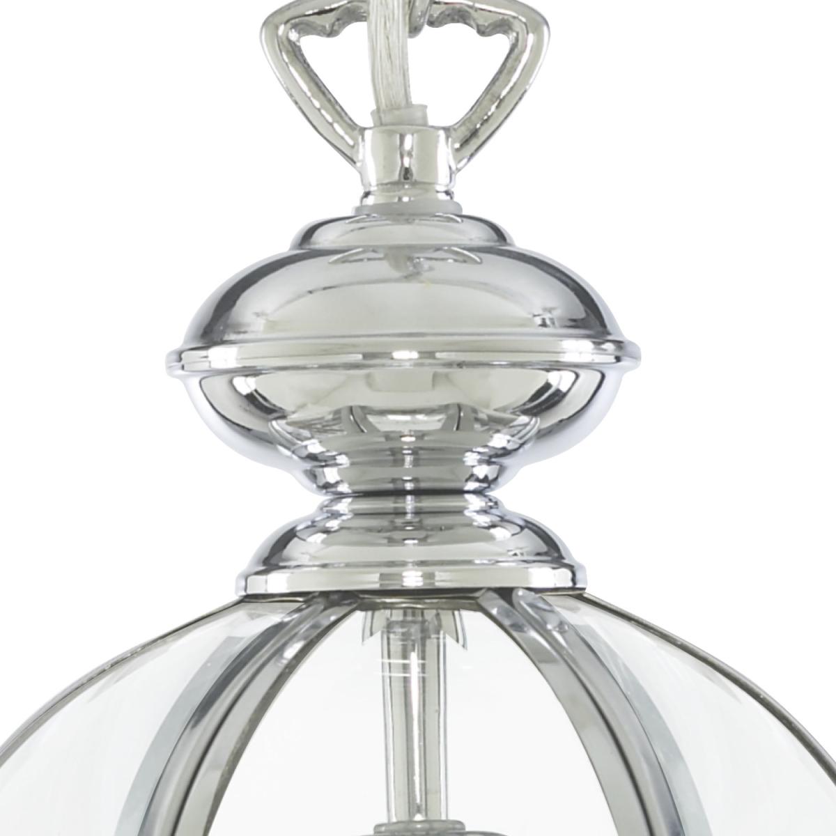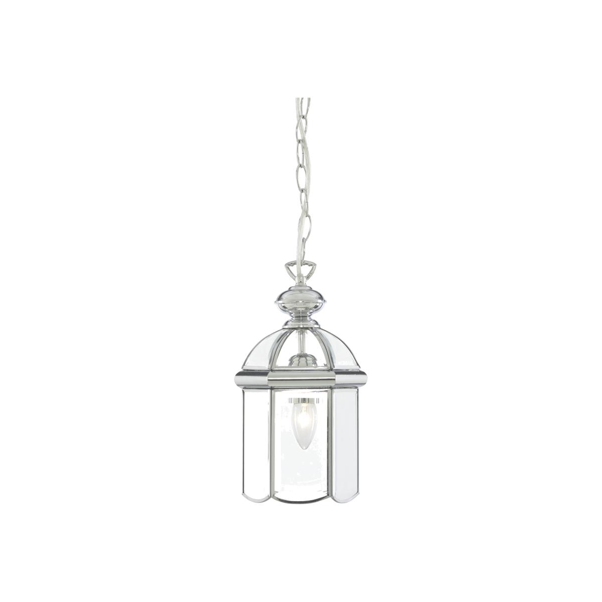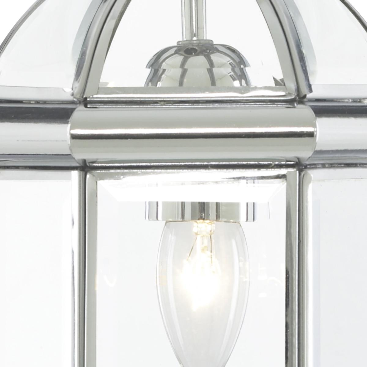 This chrome single light lantern with curved bevelled glass shade is intricately designed and styled. The chrome finish frame is full of ornate curves, with detailed fittings at the top and bottom of a central mast, and a chain attaching it to the ceiling. And the bevelled glass panels create a beautiful oval shaped lantern, which is internally lit by a candle style light fitting.
