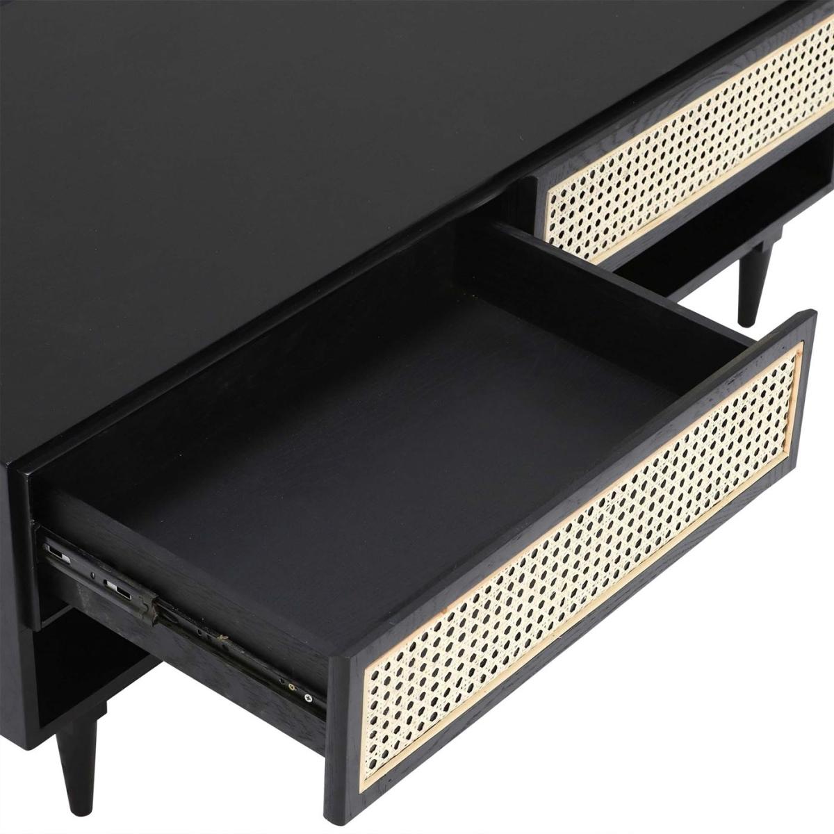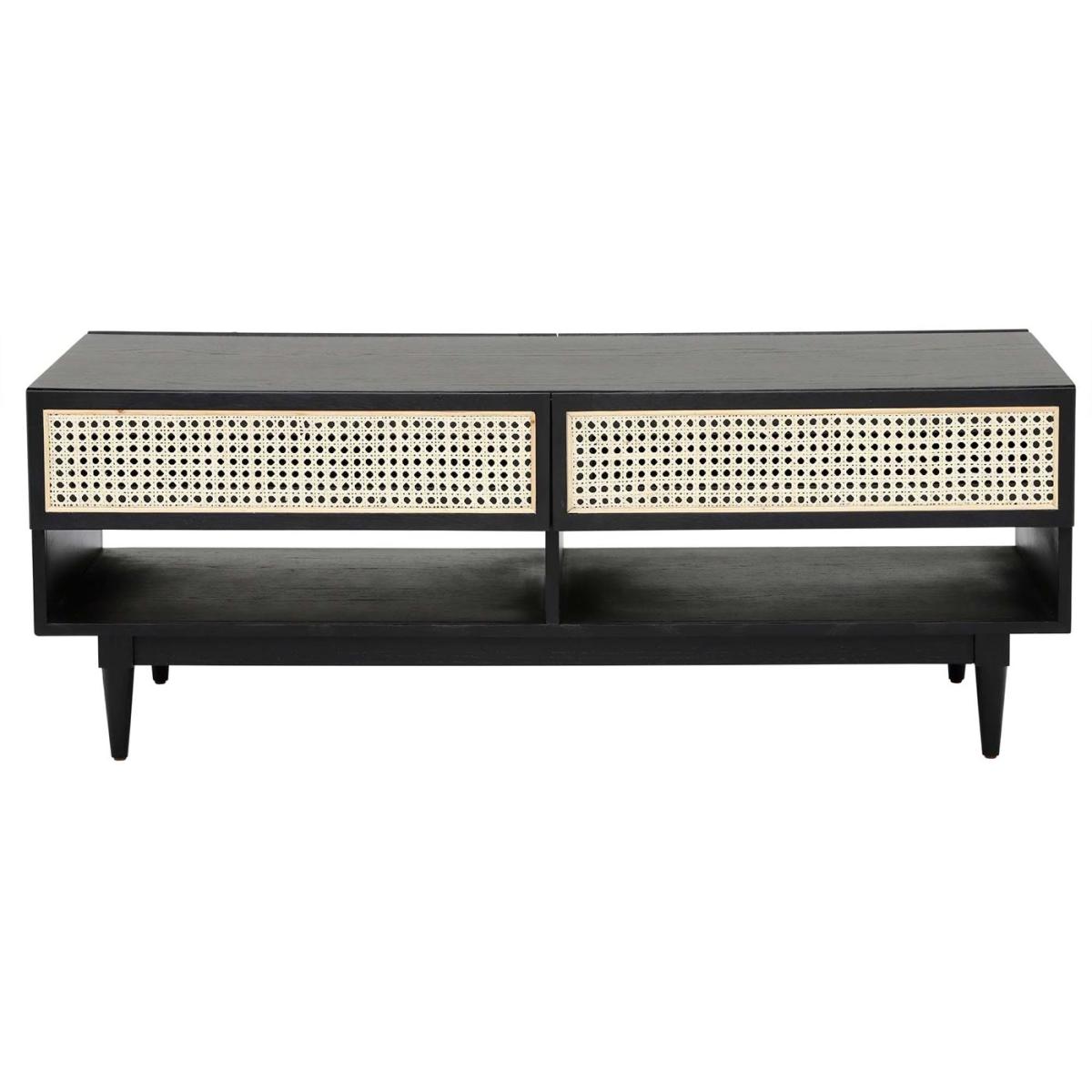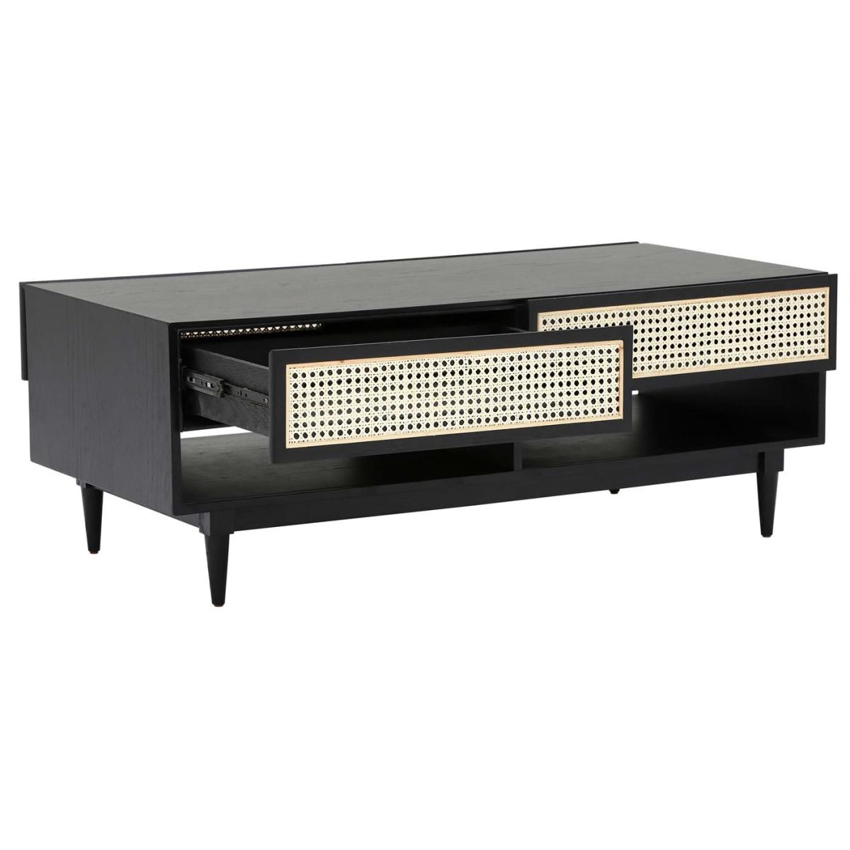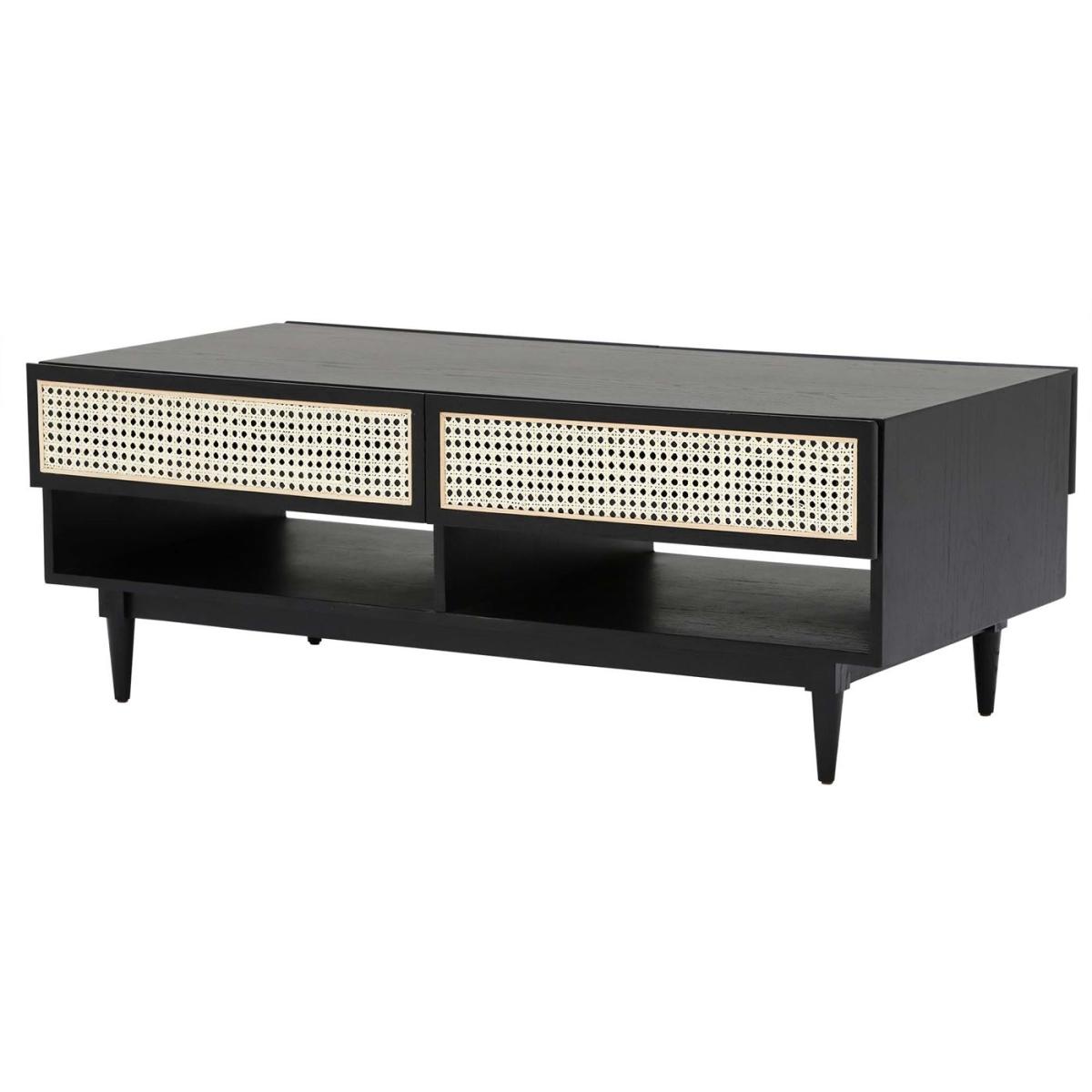 Design. Rattan furniture is back in a big way – and the Hague coffee table in black oak lets you introduce a little to your home with ease. This stunning coffee table features two drawers for clearing away clutter, whose fronts and backs are detailed with delicate handwoven wicker. Set within a stained black wooden frame, these otherwise subtle design elements will stand out beautifully in any living room scheme. Functional as well as fabulous, the coffee table contains two open shelves for housing magazines, remote controls and more. Also available in. Natural. For a more bohemian look.