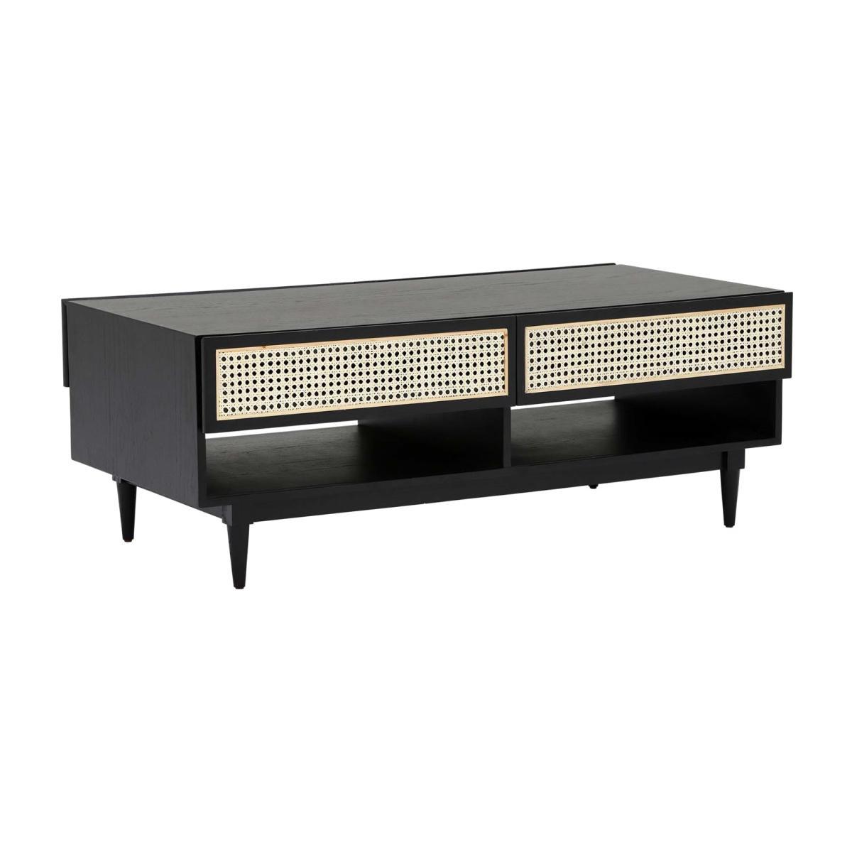 Design. Rattan furniture is back in a big way – and the Hague coffee table in black oak lets you introduce a little to your home with ease. This stunning coffee table features two drawers for clearing away clutter, whose fronts and backs are detailed with delicate handwoven wicker. Set within a stained black wooden frame, these otherwise subtle design elements will stand out beautifully in any living room scheme. Functional as well as fabulous, the coffee table contains two open shelves for housing magazines, remote controls and more. Also available in. Natural. For a more bohemian look.