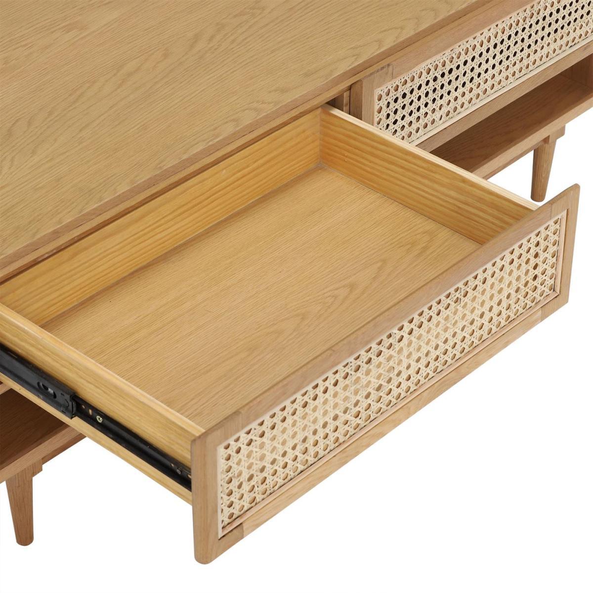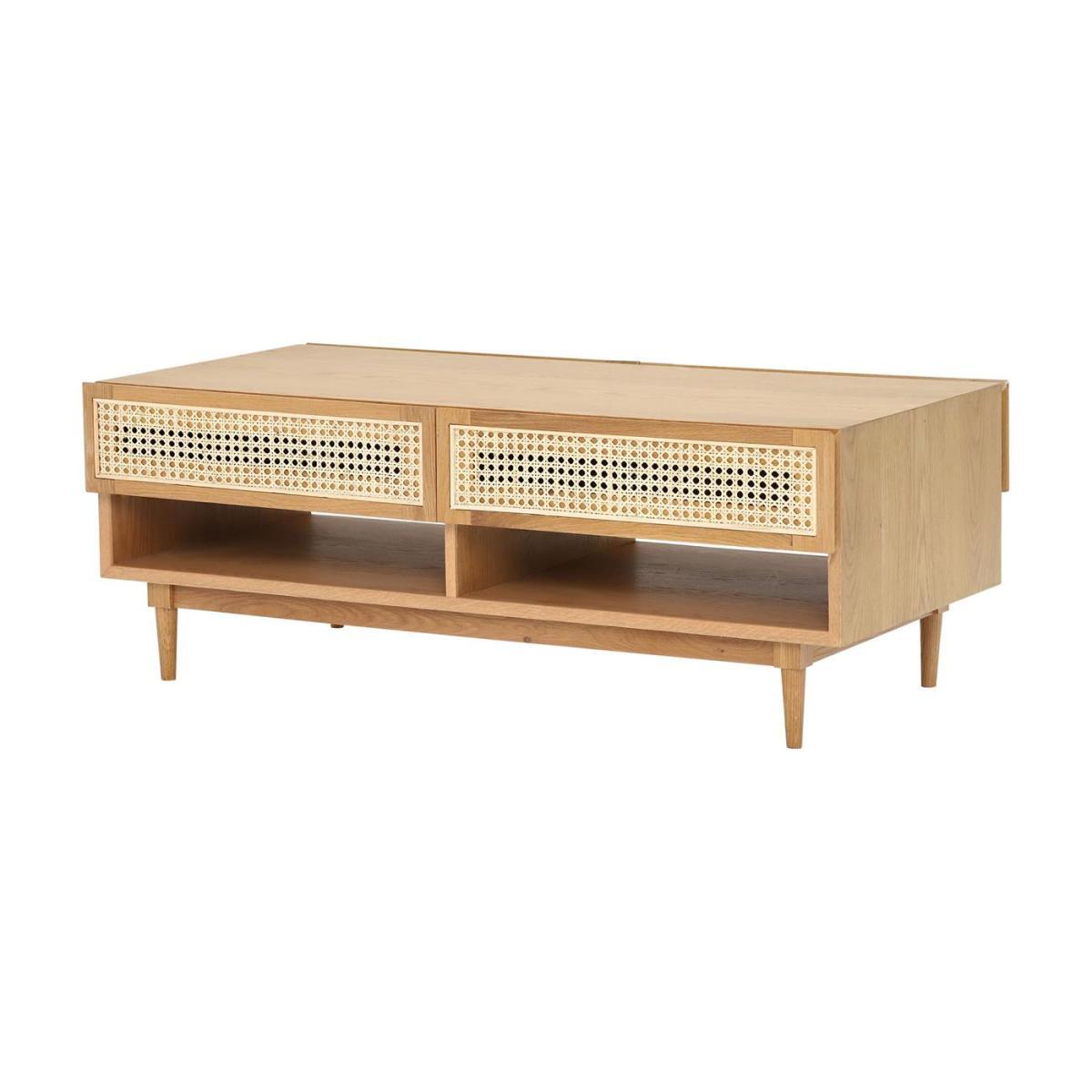 With a notable nod to retro design, the Hague coffee table features recently revived rattan detailing and a boxy, mid-century shape. Complete with open shelves and two spacious drawers, this stylish coffee table is designed to make your life easier. Plus, with beautiful cane wicker panels to both the fronts and the backs of the drawers, it looks lovely from all angles. Crafted from quality oak, it is sure to see you through the years - while its naturally warm finish