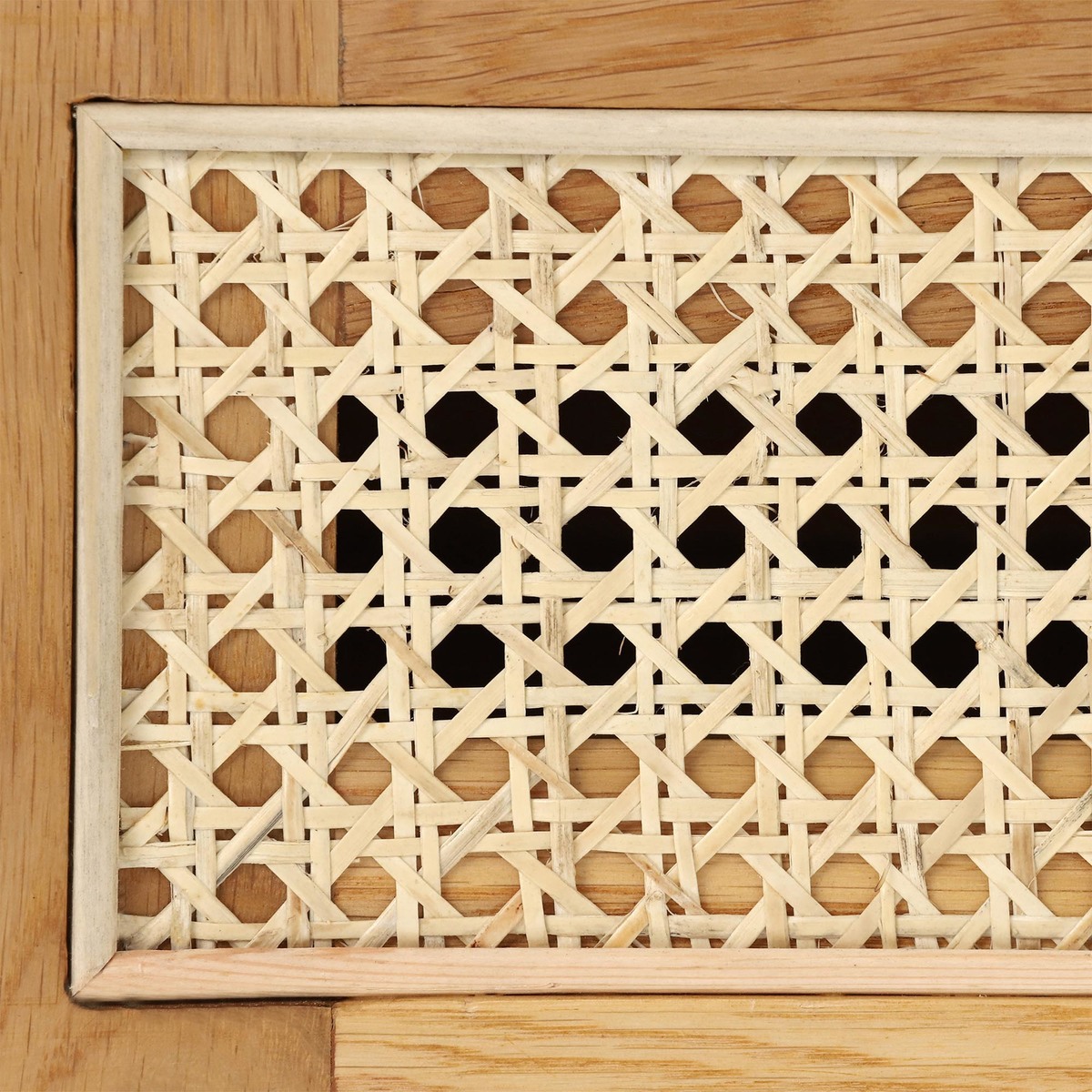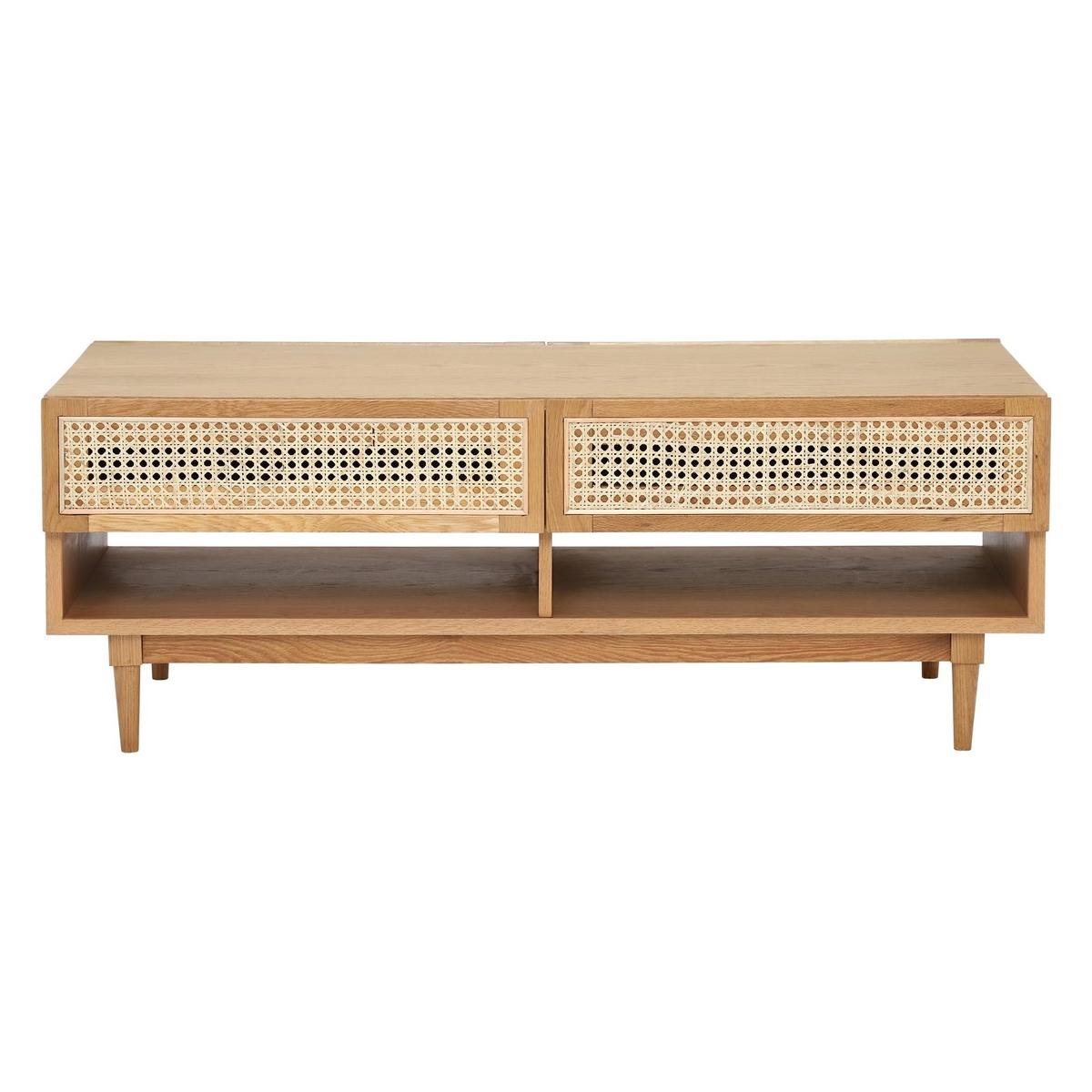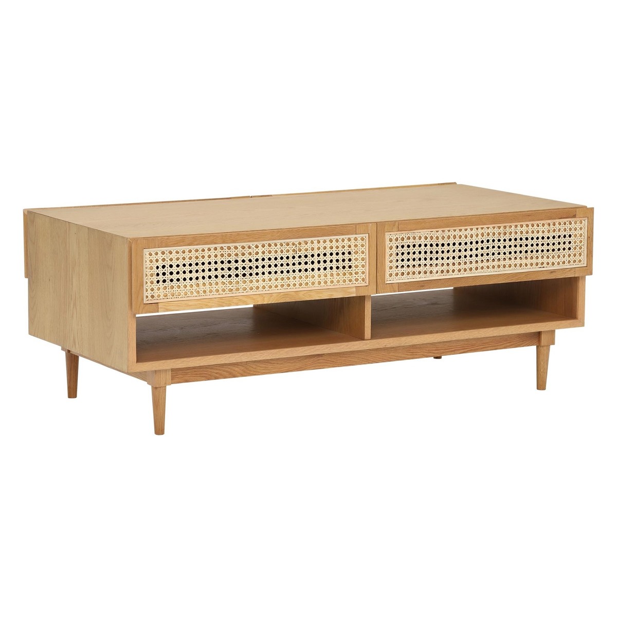 With a notable nod to retro design, the Hague coffee table features recently revived rattan detailing and a boxy, mid-century shape. Complete with open shelves and two spacious drawers, this stylish coffee table is designed to make your life easier. Plus, with beautiful cane wicker panels to both the fronts and the backs of the drawers, it looks lovely from all angles. Crafted from quality oak, it is sure to see you through the years - while its naturally warm finish can be dressed up or down to suit an array of interior schemes. Also available in black for contemporary contrast.