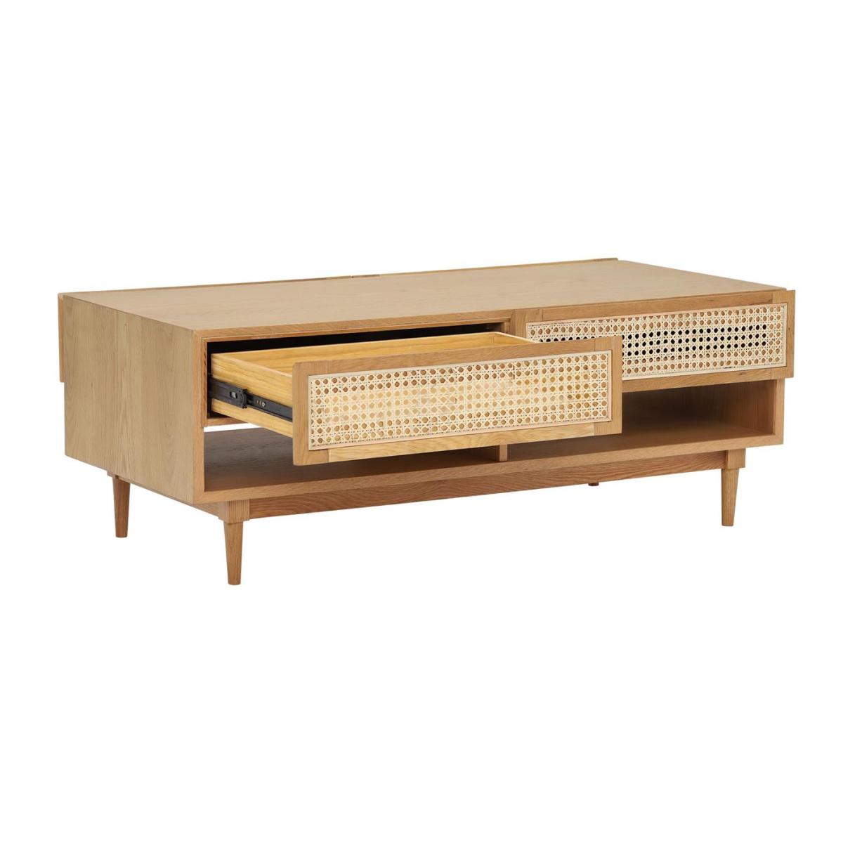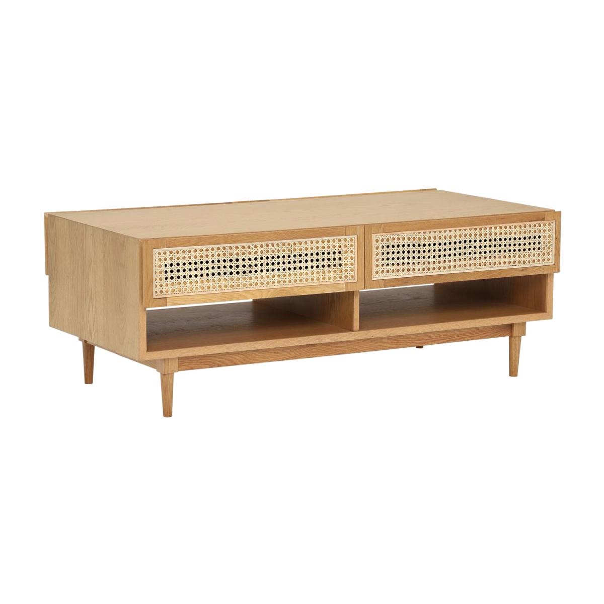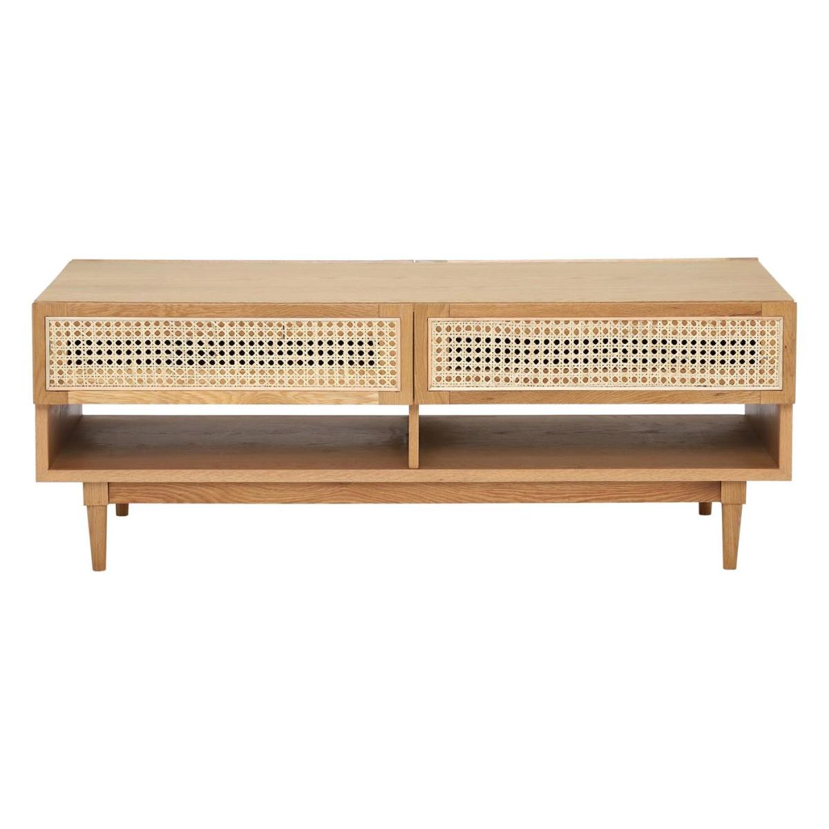 I love this coffee table for its clean, neutral palette and natural wood finish, making it a versatile anchor in a variety of interiors. It works particularly well in Scandi, coastal, or modern rustic schemes, where its understated elegance can shine without overpowering the space. Practical styling tips include layering with a stack of books, a vase with fresh greenery, or a candle to add interest. Its open shelving provides functional space for magazines or small decorative items, while the spacious top is perfect for placing drinks or trays. The woven detail on the drawers adds texture and a subtle touch of character, making it both stylish and practical for everyday living.