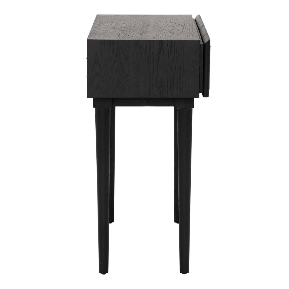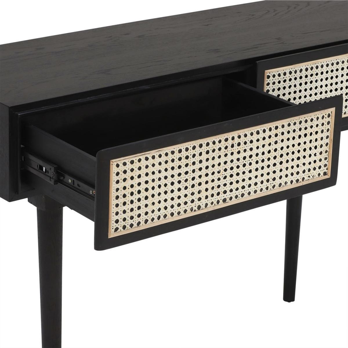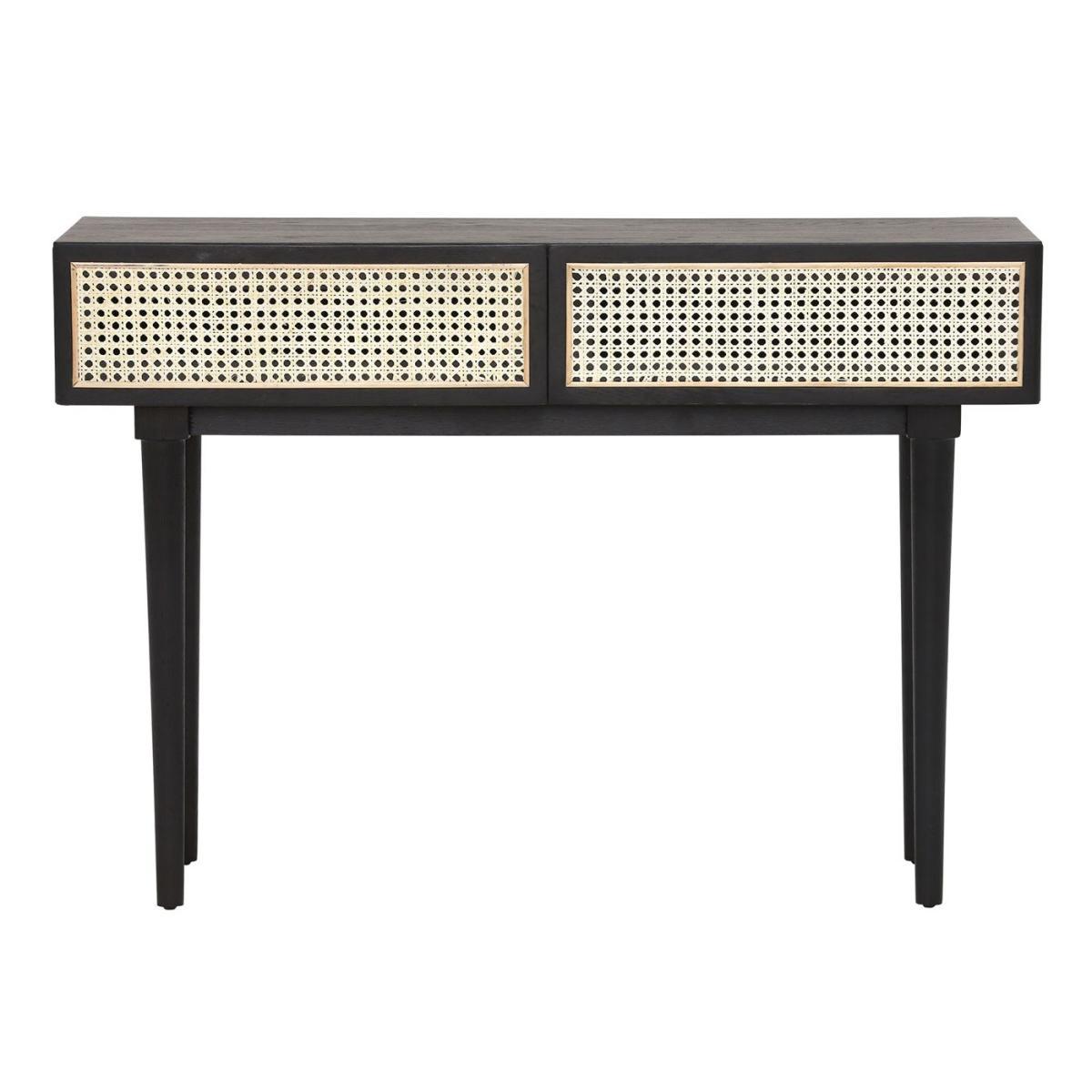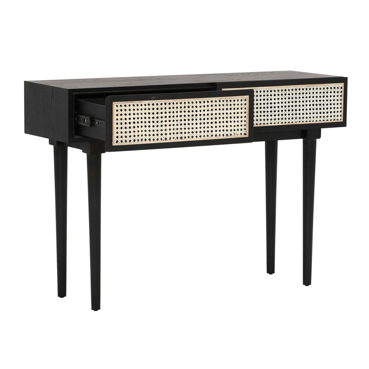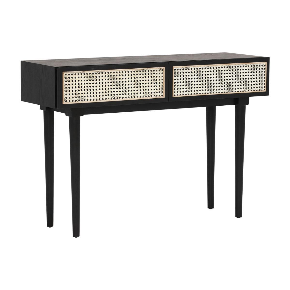 Design. Tap into the must-have rattan trend of the moment with the Hague console table in black, featuring beautifully handwoven wicker drawer fronts set against smart stained wood. Guaranteed to capture your guests’ attention in the hallway, living room and beyond, this console table has an incredibly distinctive look that juxtaposes black oak and natural cane for a modern take on a vintage classic. The table’s slim proportions are neat and refined, with space inside and on top to keep your daily essentials easily at hand. However you choose to style it, the Hague will not disappoint. Also available in natural for a softer touch.