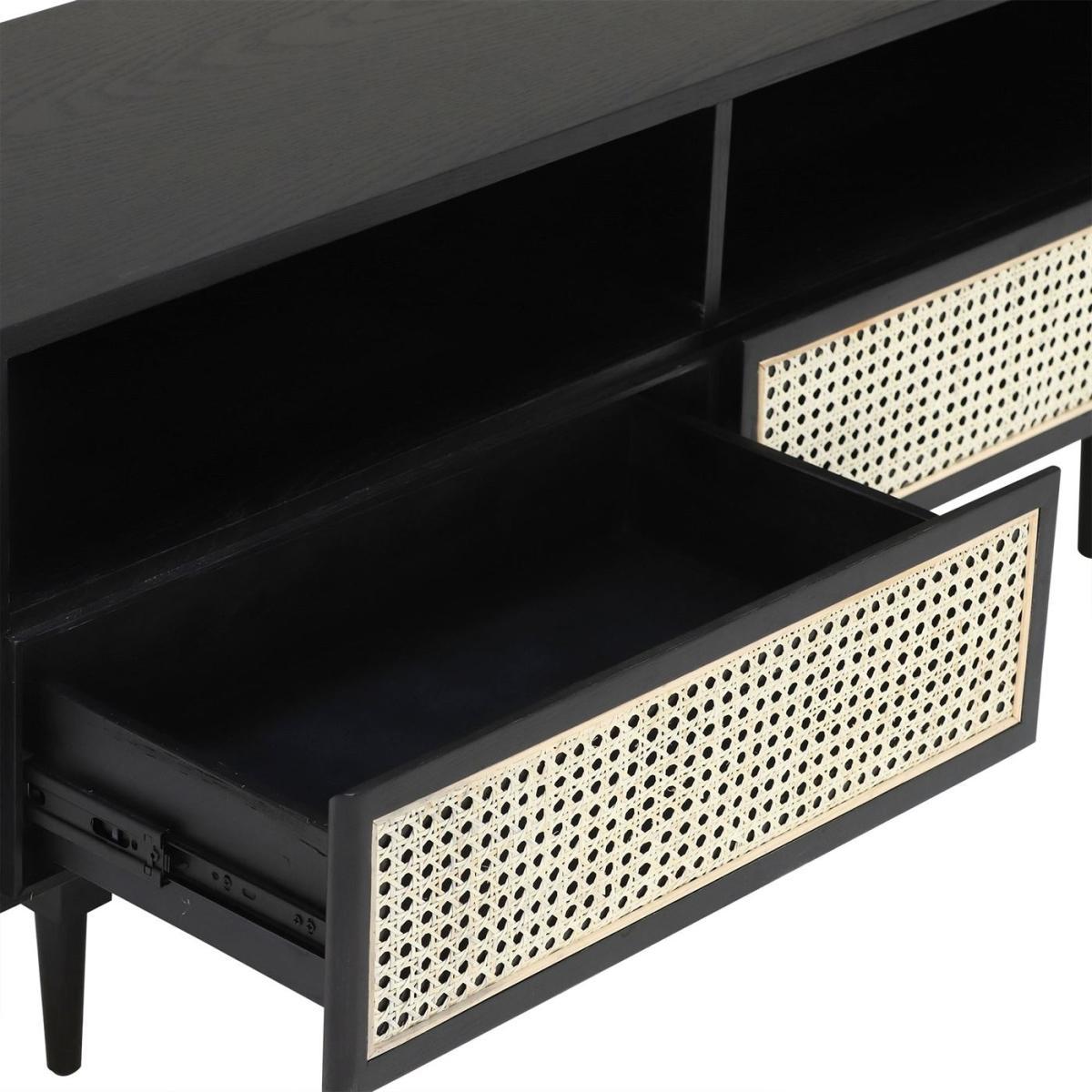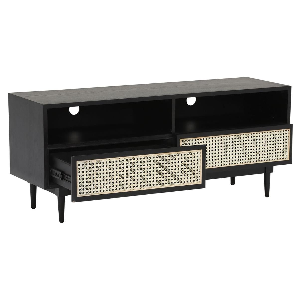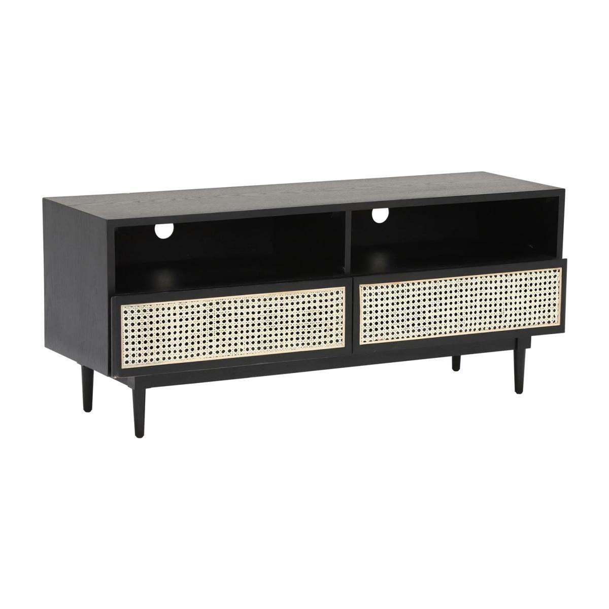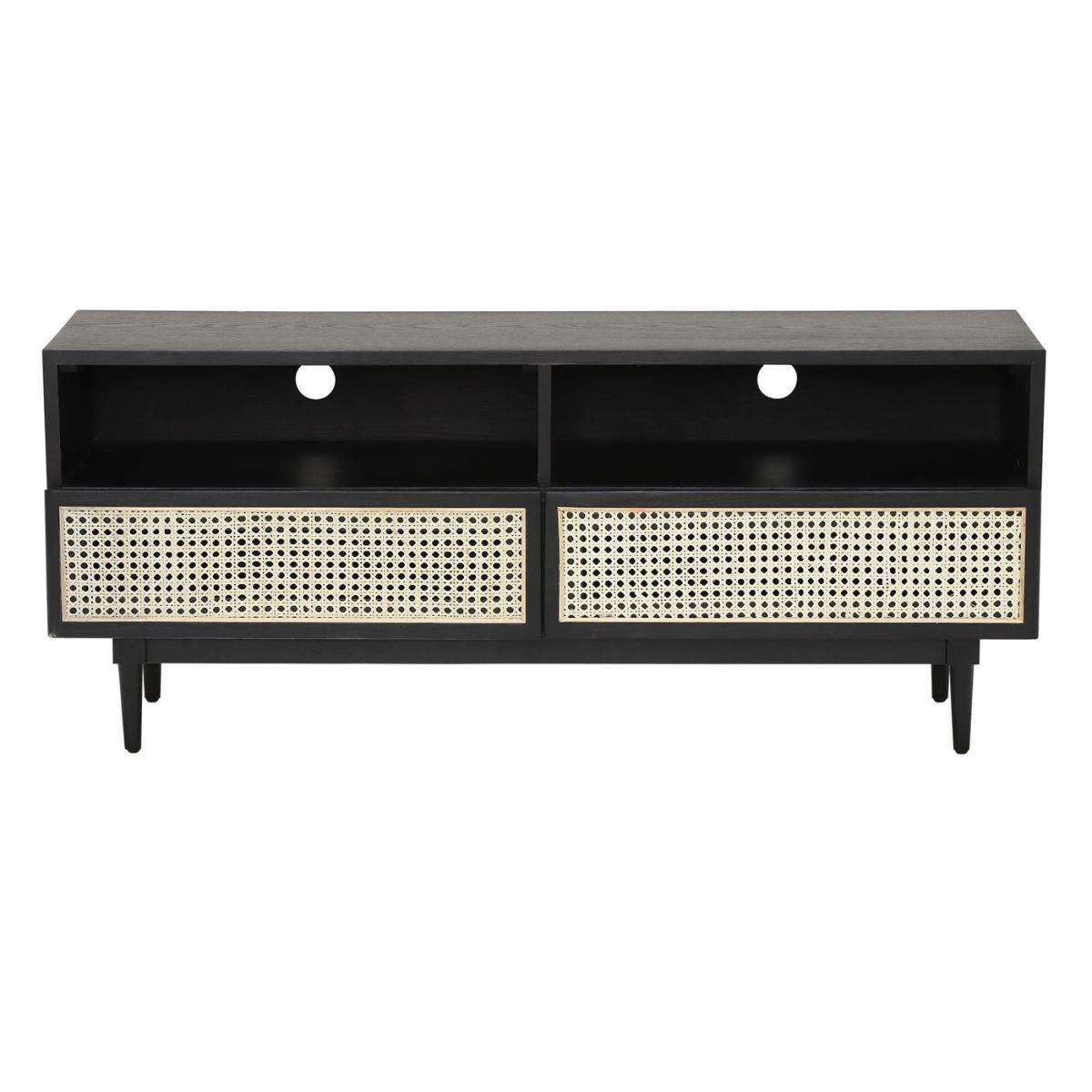 Design. A striking spin on a practical piece of furniture, the Hague 2 drawer TV unit brings together handwoven wicker rattan and stained black wood. Featuring a sturdy oak frame with natural grains and markings, it suits a wide range of interior looks and colour schemes. Two open shelves provide space for your set-top box and consoles, while two handy drawers stow away anything that doesn’t need to be seen. The drawer’s beautiful cane fronts give the TV stand its signature look; a combination of natural and contemporary style. Also available in natural for a more bohemian feel.
