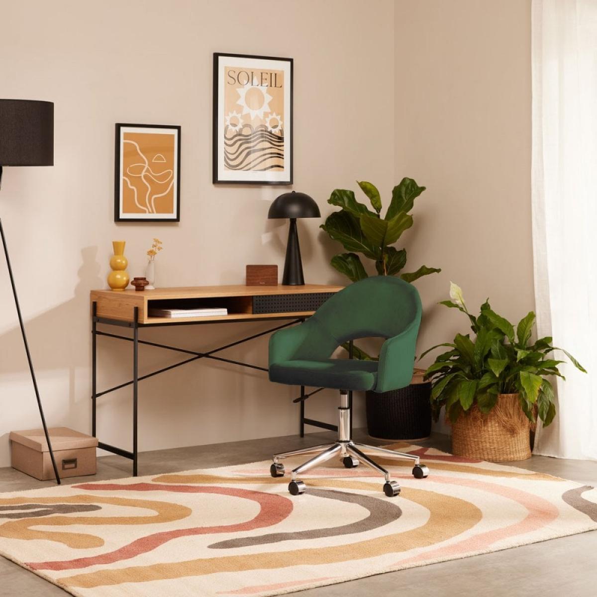 I love this chair for adding a rich, colour-pop element to both contemporary and eclectic interiors. The forest green velvet lends a sophisticated yet inviting vibe, making it a statement piece in any home office or creative space. The brass legs bring a touch of luxe and warmth, making it versatile enough to pair with muted tones or more vibrant palettes. Practical styling tips include pairing it with natural textures like wood or woven accessories to soften the look, and adding contrasting cushions or throws for extra comfort and visual interest. It works especially well in mixed materials settings, where its plush velvet and metallic accents can really shine.