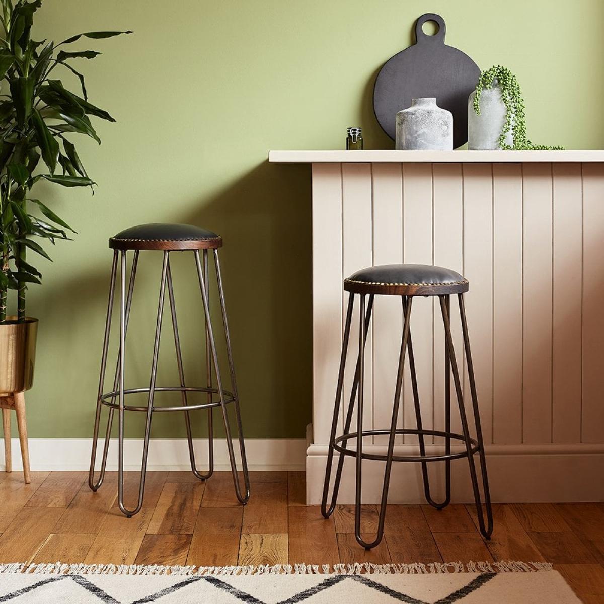 The Hairpin Bar Stool features those classic hairpin metal legs in a black or white finish, a padded faux leather seat with rustic studded finish. Ideal for those seeking a clean Industrial design at the centre of any kitchen, the Hairpin Bar Stool combines two classic materials for a robust and stylish design. Built with strength and versatility in mind, the Hairpin Stool mixes Industrial and Mid Century Modern for an instant kitchen uplift. View The Hairpin Range