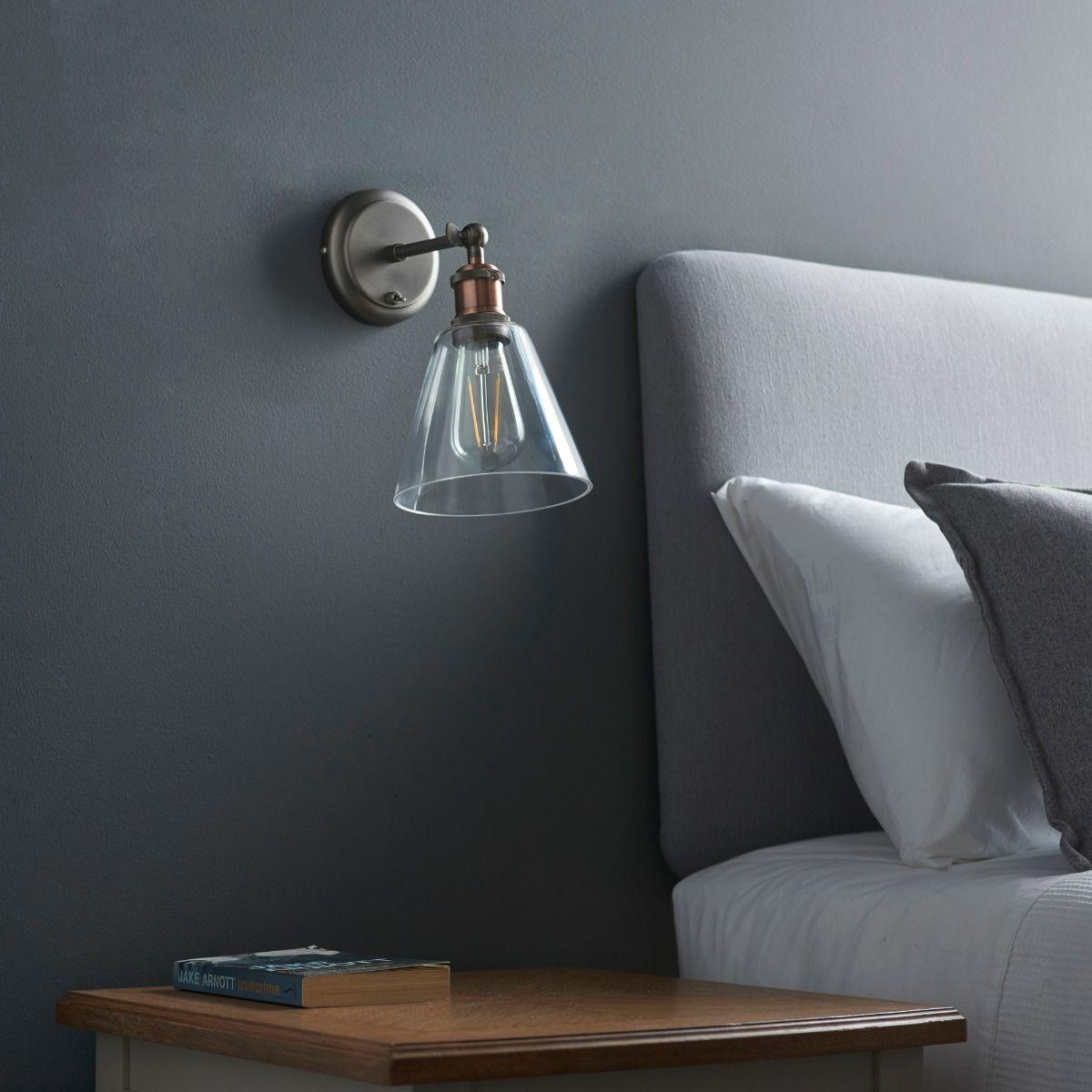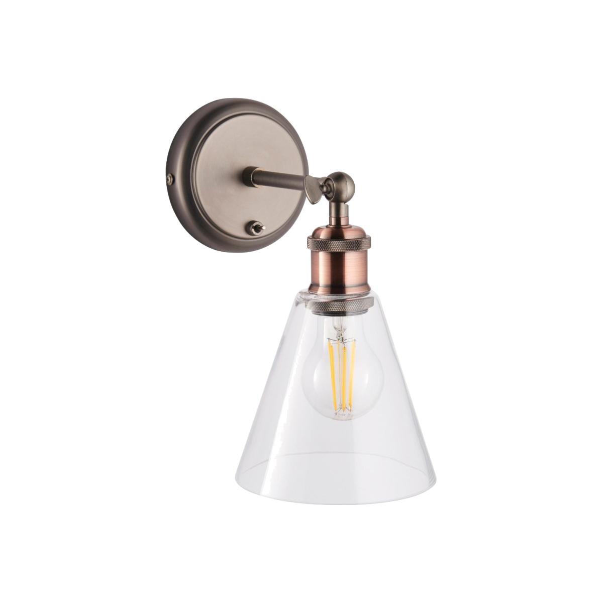 Industrial wall light boasting pewter and copper finish with glass shade. A beautiful addition to your home, this wall light is part of the Hal range. Finished in aged pewter and aged copper with glass shade, the fitting boasts a fixed arm and an authentic knurled bulb holder. Complete with an adjustable knuckle, the lamp head can be adjusted into the desired position. Operated by a simple on/off switch on the back plate, it is ideal for use in both commercial and residential premises. Style this light with one of our vast selection of LED E27 light bulbs.