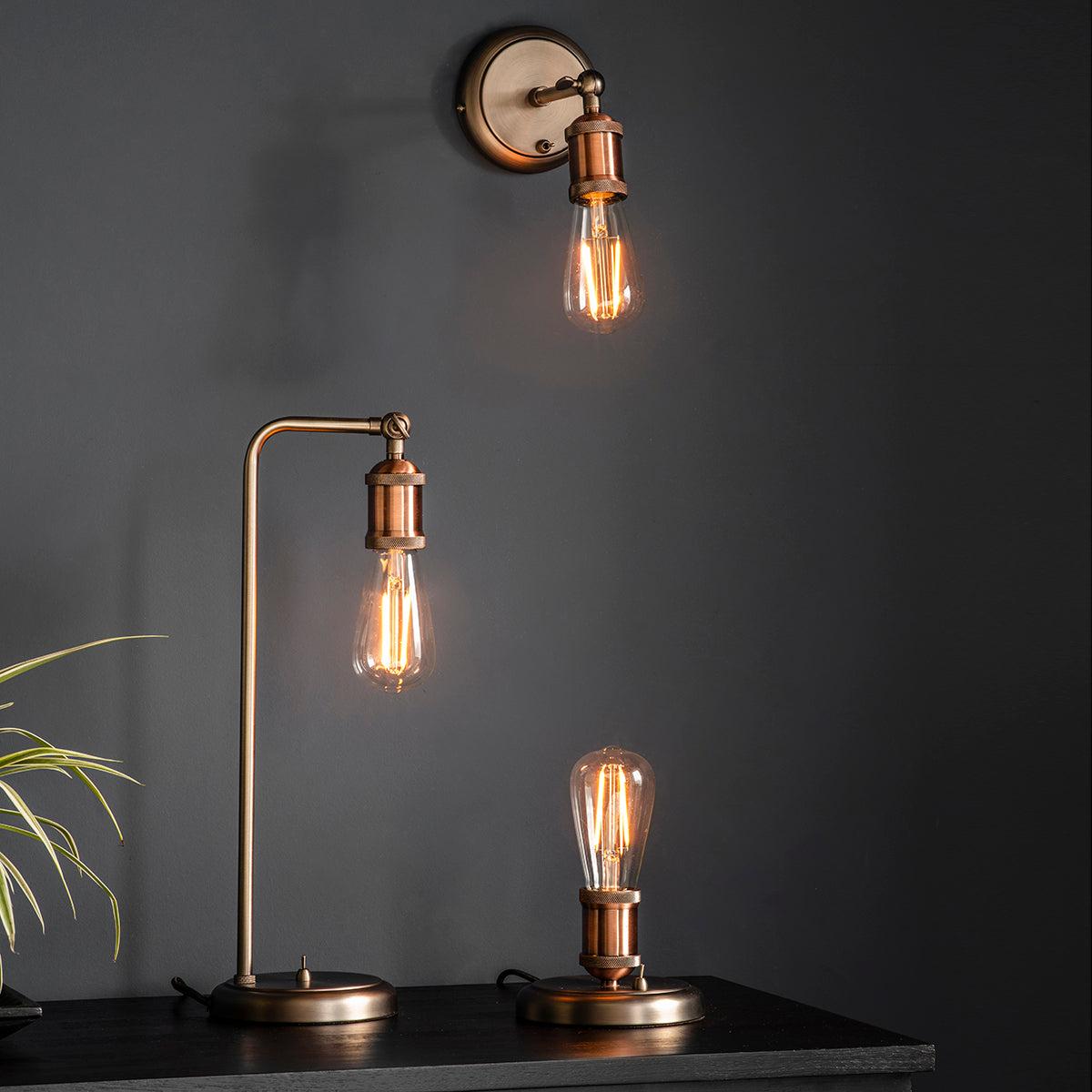 An industrial styled wall light, finished in aged pewter and aged copper, making it bang up to date with on-trend 'resto' styling. Adjustable knuckles and knurled lamp holders complete the authentic look. Perfect when paired with filament LED lamps and easily controlled by a simple on/off switch. Complete the industrial look with the complimentary ceiling and table light options.