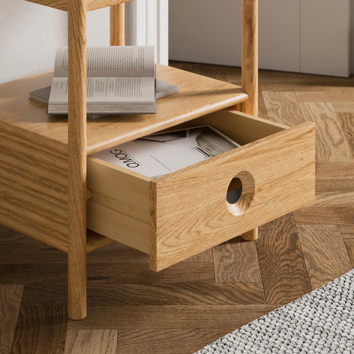 I love this small bedside table for its clean lines and natural materials, making it versatile across various interior styles. It works particularly well in minimalist, Scandi, or modern interiors thanks to its simple oak frame and glass top, which add a touch of warmth and elegance without feeling bulky. Practical styling tips include keeping the surface clear with a favourite book or a small plant, and utilising the drawer or shelf for essentials like your reading glasses or chargers. Its natural wood finish pairs beautifully with neutral colour schemes, but it can also stand out as a subtle contrast in rooms with darker or more saturated tones. Overall, it’s a functional yet stylish piece that adds a calm, organic touch to any bedroom.