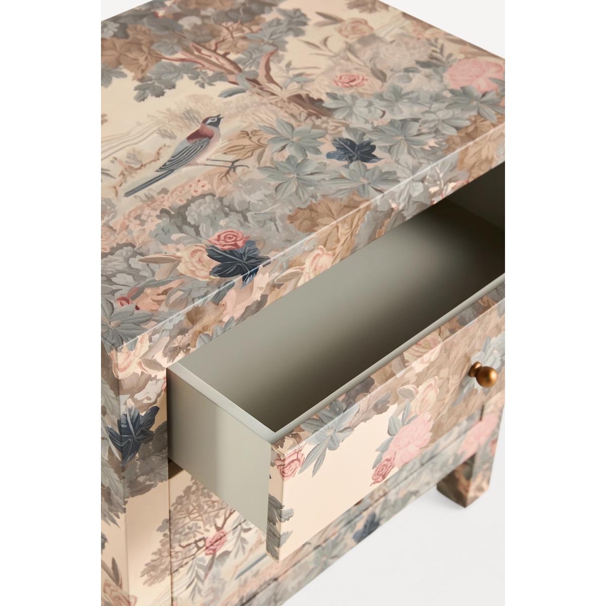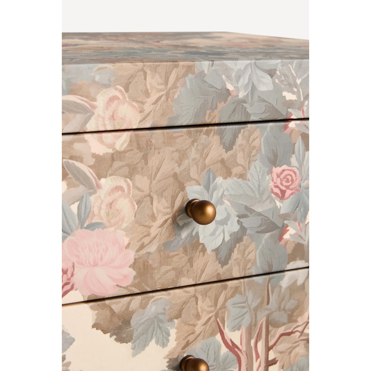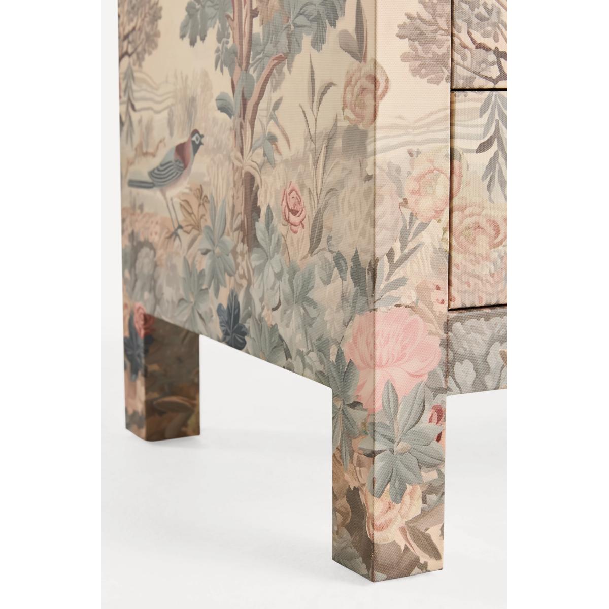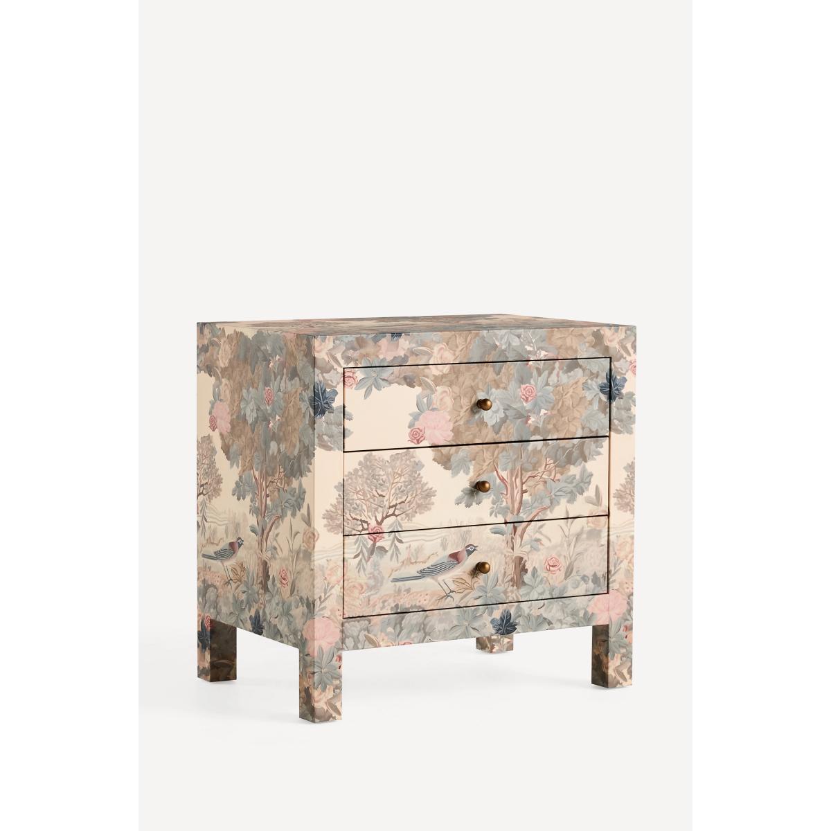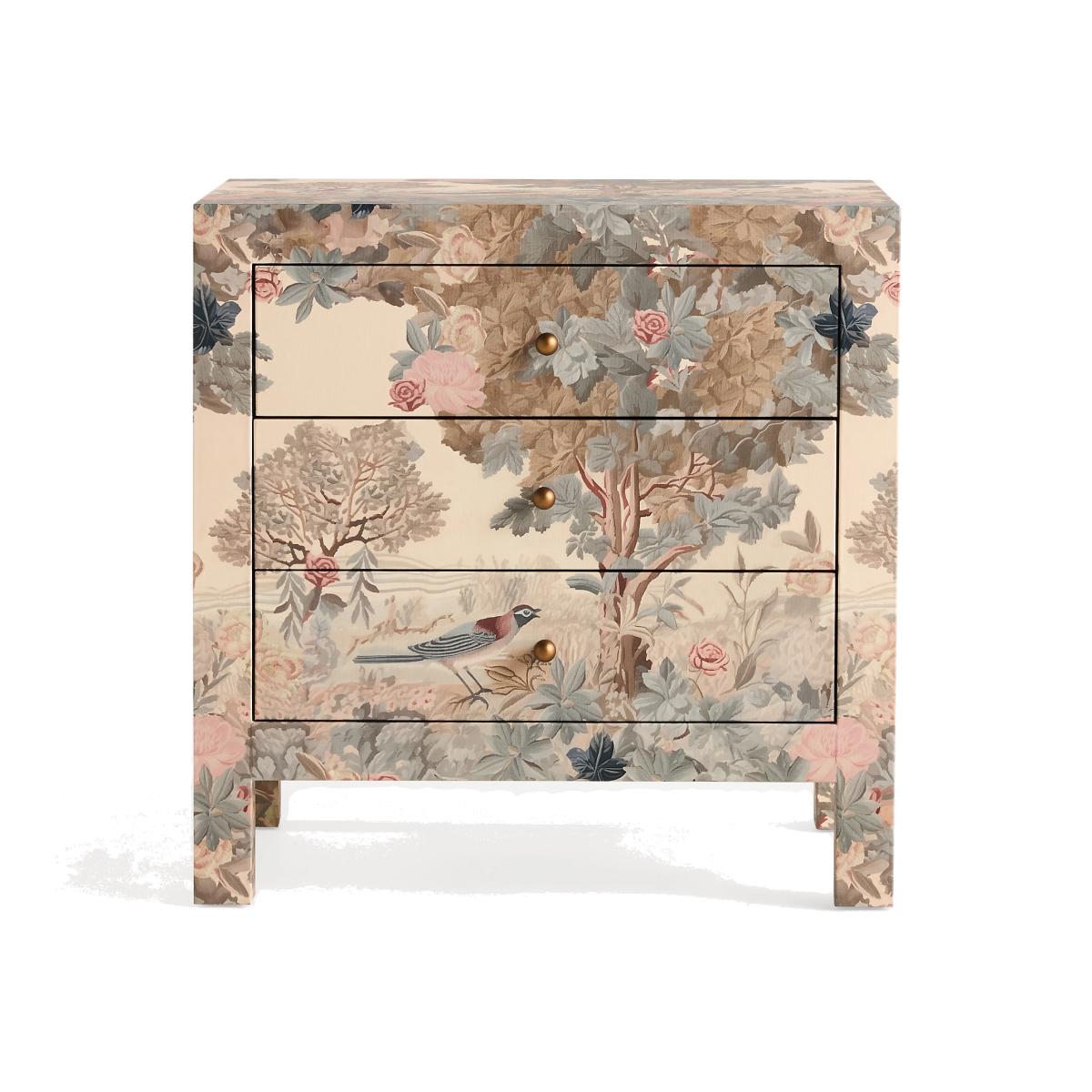 * Poplar wood and beechwood veneer reinforced with engineered hardwood, finished with cotton canvas inlay * Steel handles with brass finish * Three drawers open on metal glides * Wipe clean with soft cloth. Avoid using chemical cleaners * Levelers are included * Anti-tip hardware included for extra safety and stability * This piece is intended for indoor use * No assembly required * Imported