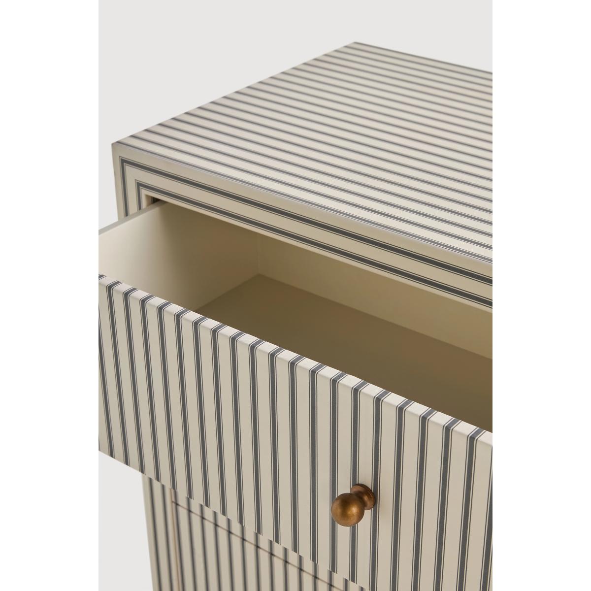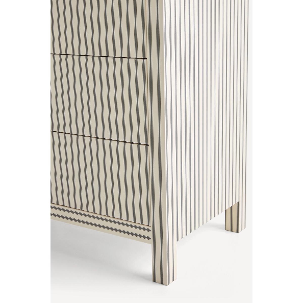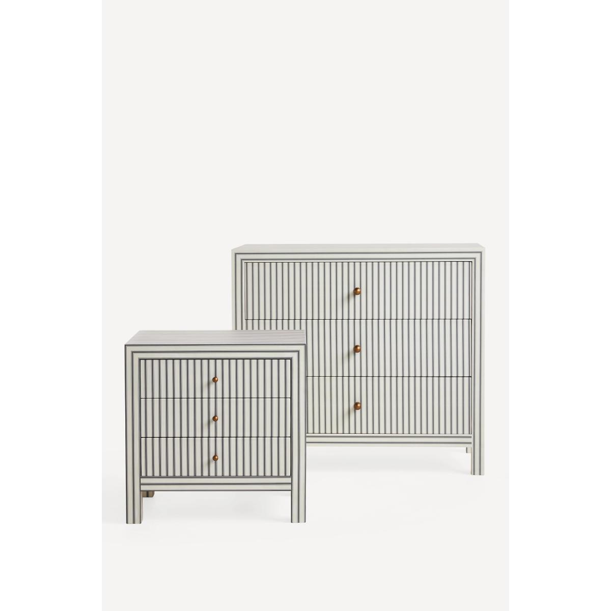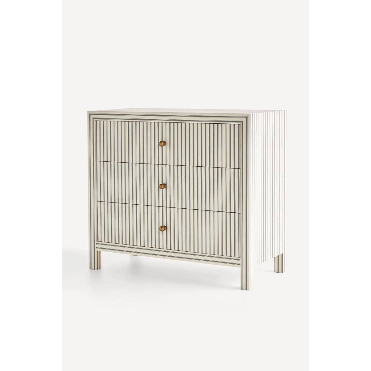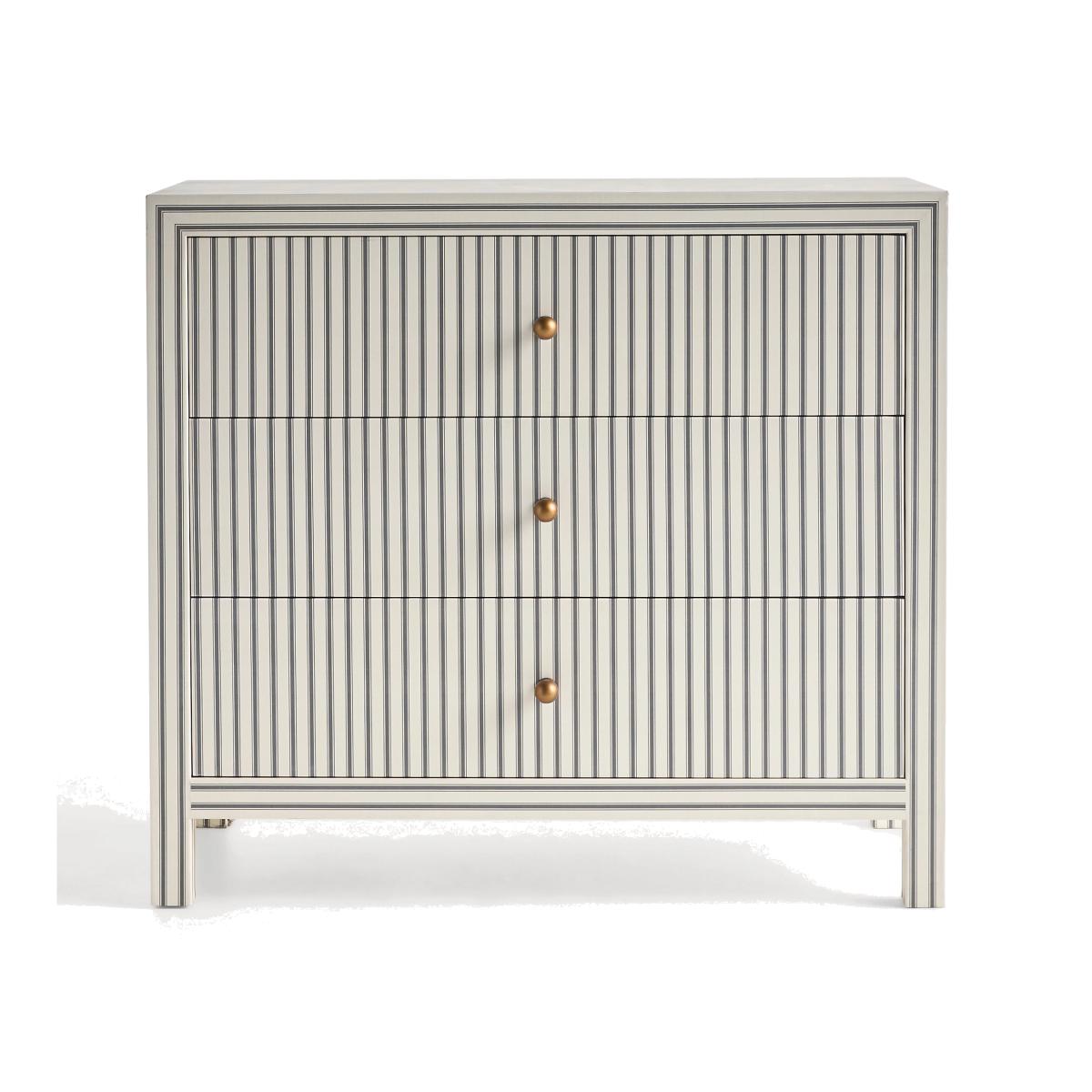 Poplar wood and beechwood veneer reinforced with engineered hardwood, finished with cotton canvas inlay Steel handles with brass finish Three drawers open on metal glides Wipe clean with soft cloth. Avoid using chemical cleaners Anti-tip hardware included for extra safety and stability This piece is intended for indoor use No assembly required Imported Hale Chest of Drawers by Anthropologie