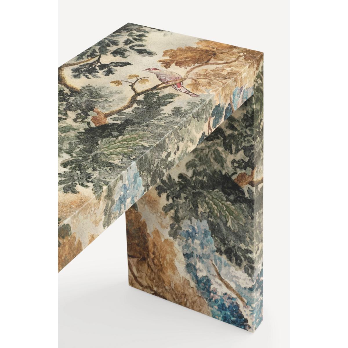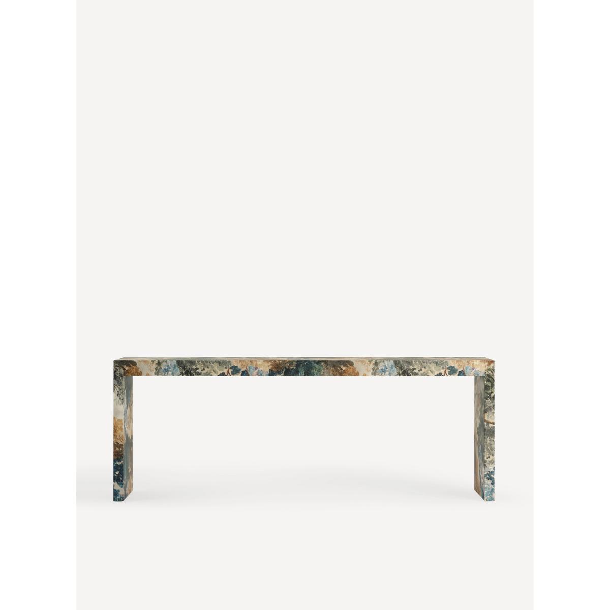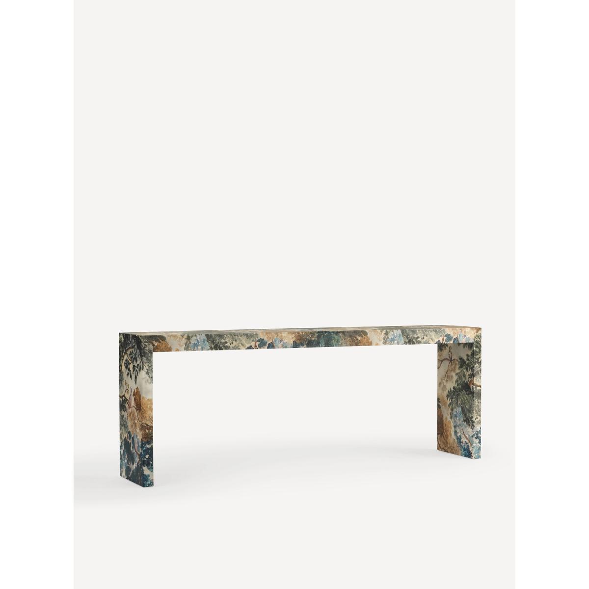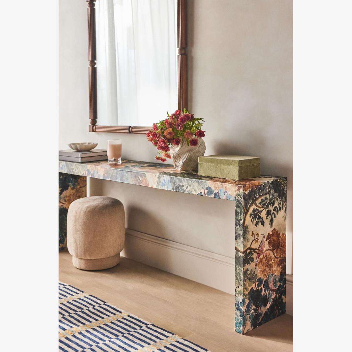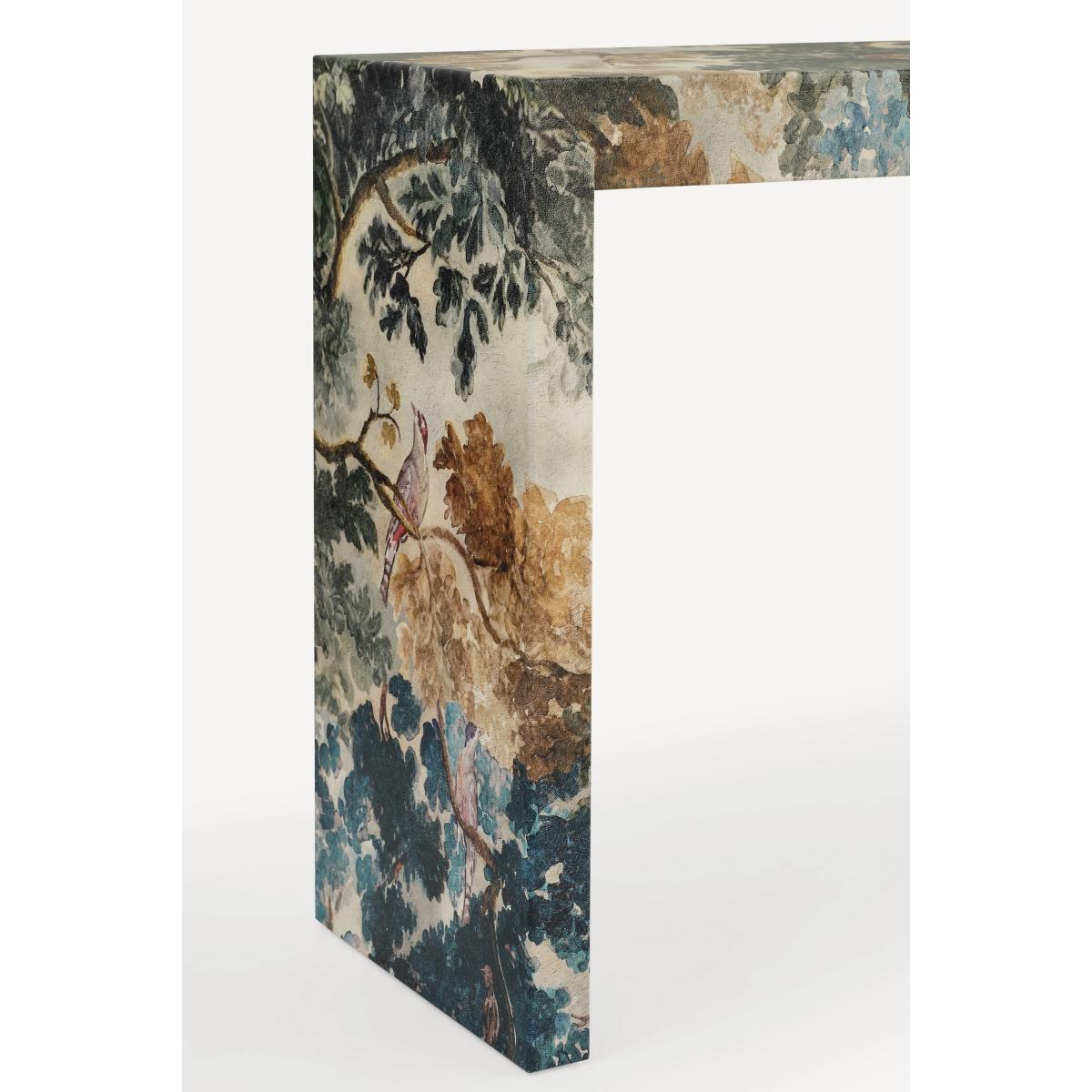 Ensconced in the fan-favourite Judarn print, this statement console makes an artful addition to the entryway, living room, and more. * Poplar and rubber wood console with beech veneer finished with a canvas print inlay * Sealed with clear lacquer for protection * Wipe clean with soft cloth. Avoid using chemical cleaners * This piece is intended for indoor use * No assembly required * Imported