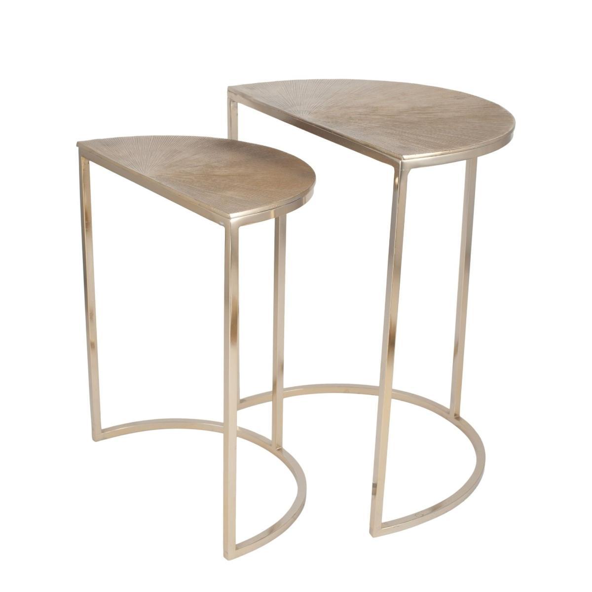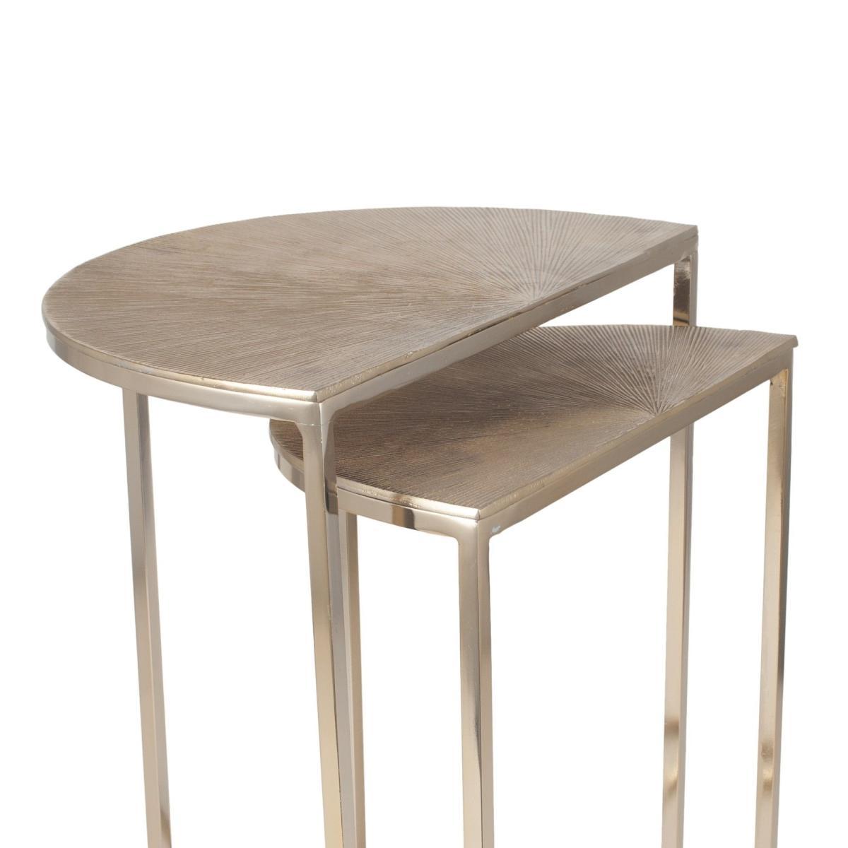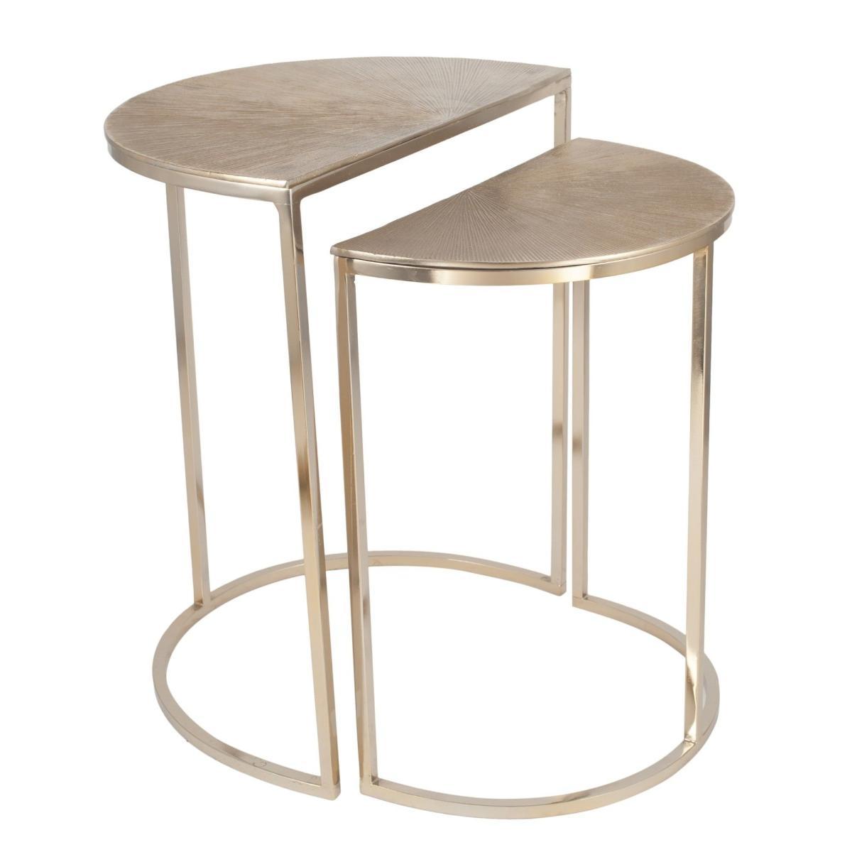 A striking set of two half-moon nesting tables finished in beautiful champagne, adding luxury to any home. A beautiful addition to your home, this glamorous set of half-moon nesting tables is from Pacific Lifestyle. A modern design, these tables are finished in a beautiful champagne cast aluminium top with slim gold metal legs. A striking piece, these nesting tables are both functional and stylish,ideal for use in lounges and living areas for anyone looking for a trend-setting,statement piece.