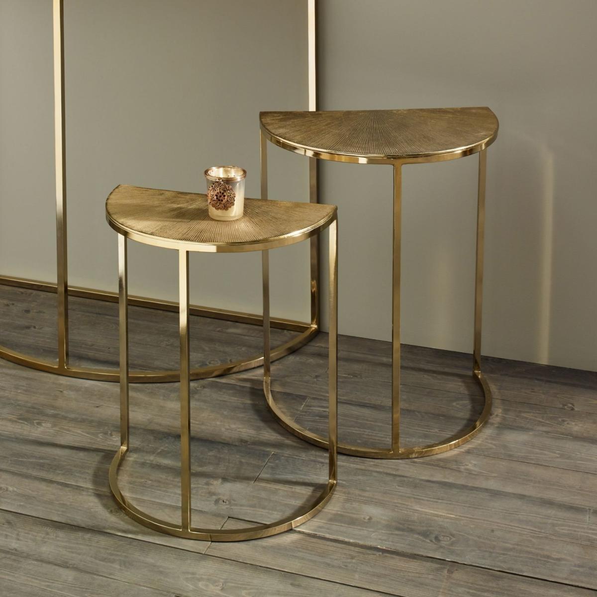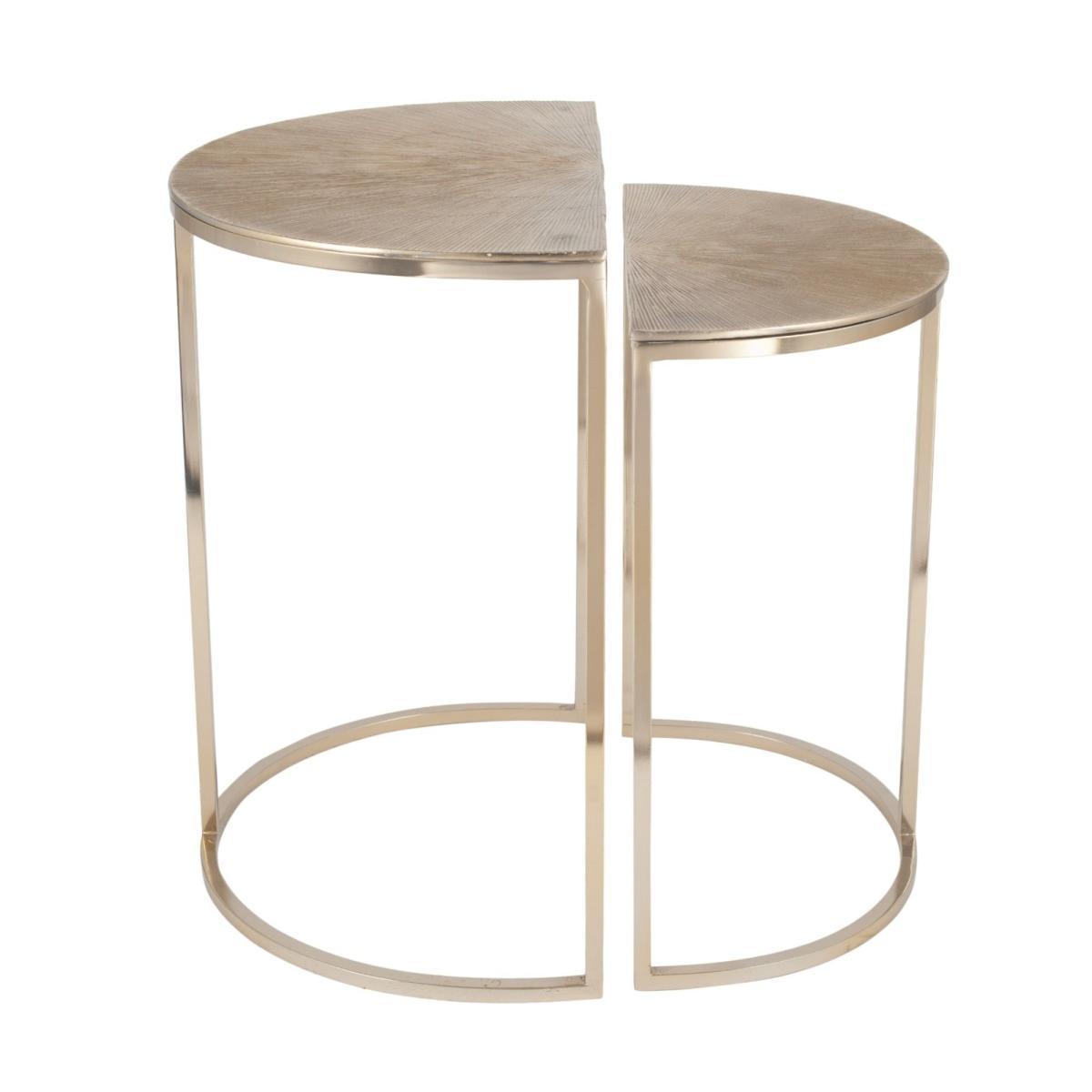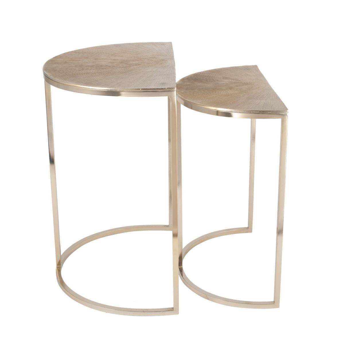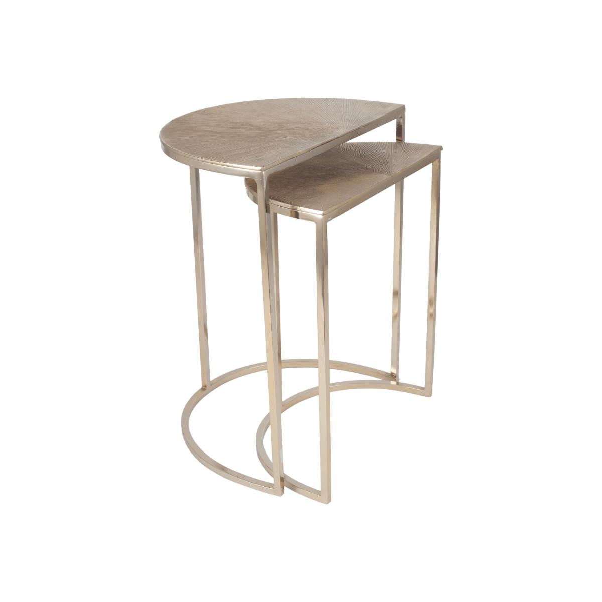 A striking set of two half-moon nesting tables finished in beautiful champagne, adding luxury to any home. A beautiful addition to your home, this glamorous set of half-moon nesting tables is from Pacific Lifestyle. A modern design, these tables are finished in a beautiful champagne cast aluminium top with slim gold metal legs. A striking piece, these nesting tables are both functional and stylish,ideal for use in lounges and living areas for anyone looking for a trend-setting,statement piece.