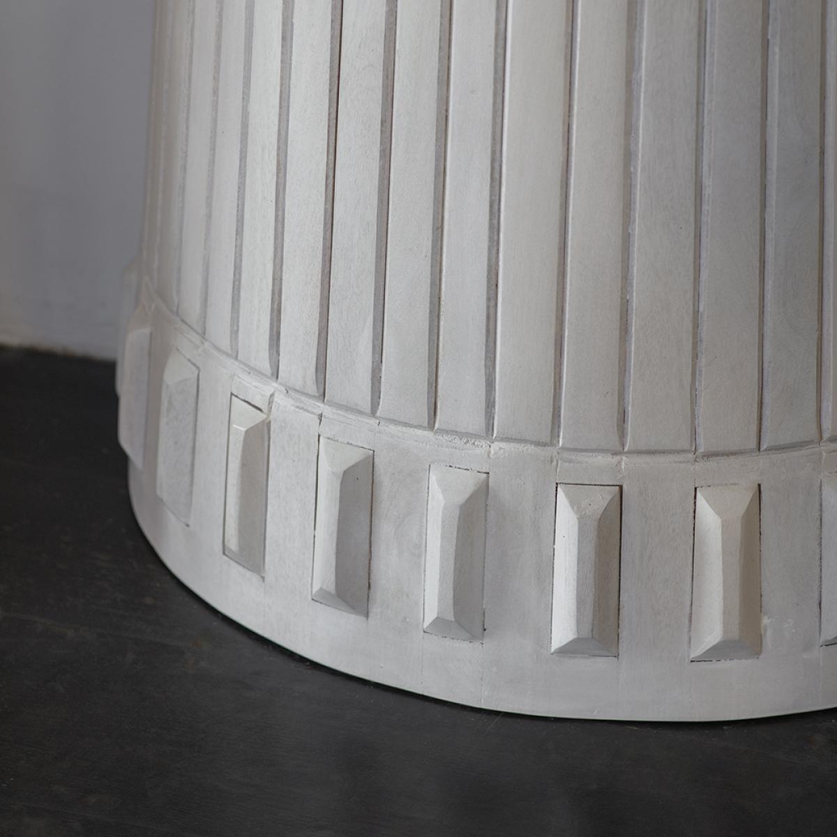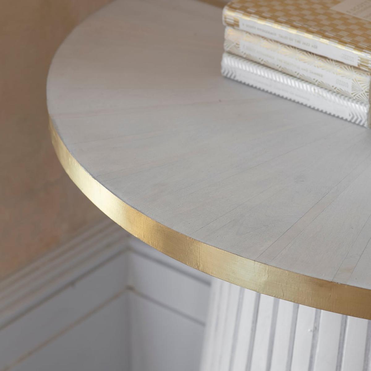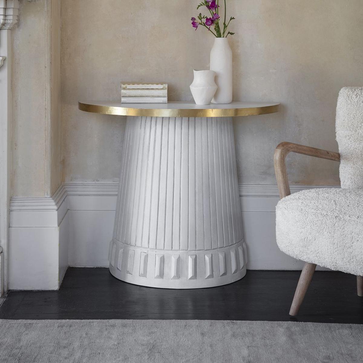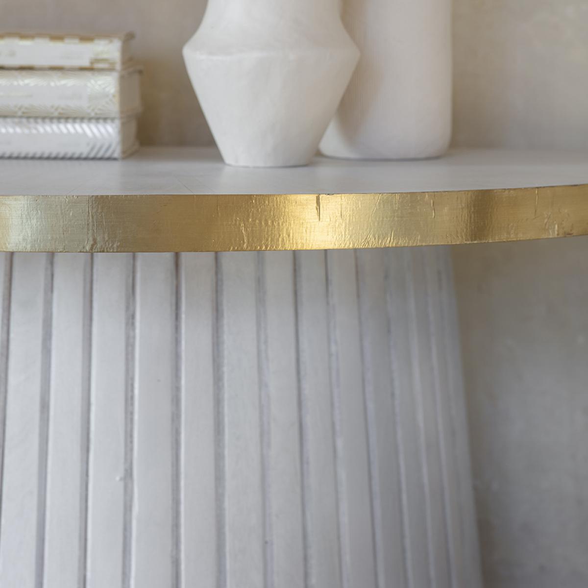 Ideal for small or narrow hallways, our solid wood Half-Moon Console is a space-saving half-moon shaped console table in a striking whitewash wood and brass design. This white half-moon console table will complement any interior and any décor and is a practical and handy tabletop for keys, letters, bills and all those things you tend to forget before leaving the house. It also looks stunning in a living area or dining room. The tabletop features a subtle sunburst parquet wood design in the same whitewash wood effect as the rest of the piece, and the base includes hand crafted wood decoration. This sturdy hallway table is one that will last for years to come.