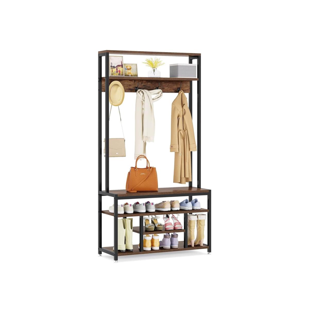 This multifunctional piece combines a coat rack, storage shelf, shoe storage, and bench. After a long day, hang your coat, hat, or scarf and sit comfortably to change your shoes, with everything you need at hand. Its large capacity accommodates all your storage requirements. Designed with a blend of simplicity and industrial style, this unit features shoe storage at different heights for high heels, boots, and sneakers. The top shelf provides space for small items like keys, bags, and decorative pieces. With dimensions of 13.78 D x 35.43 W x 71.26 H, this bench with coat rack takes up minimal floor space, making it ideal for entryways, bedrooms, mudrooms, or closets, keeping your space tidy and well-organized. Crafted from thick particle board and a strong metal frame, this hall tree is designed for durability and long-term use. Each hook can hold up to 3.3 lbs, and the bench supports up to 220 lbs. Featuring 4 adjustable feet, this freestanding closet organizer remains stable on carpets or uneven floors. The assembly is simple, with all necessary tools and instructions included in the package.