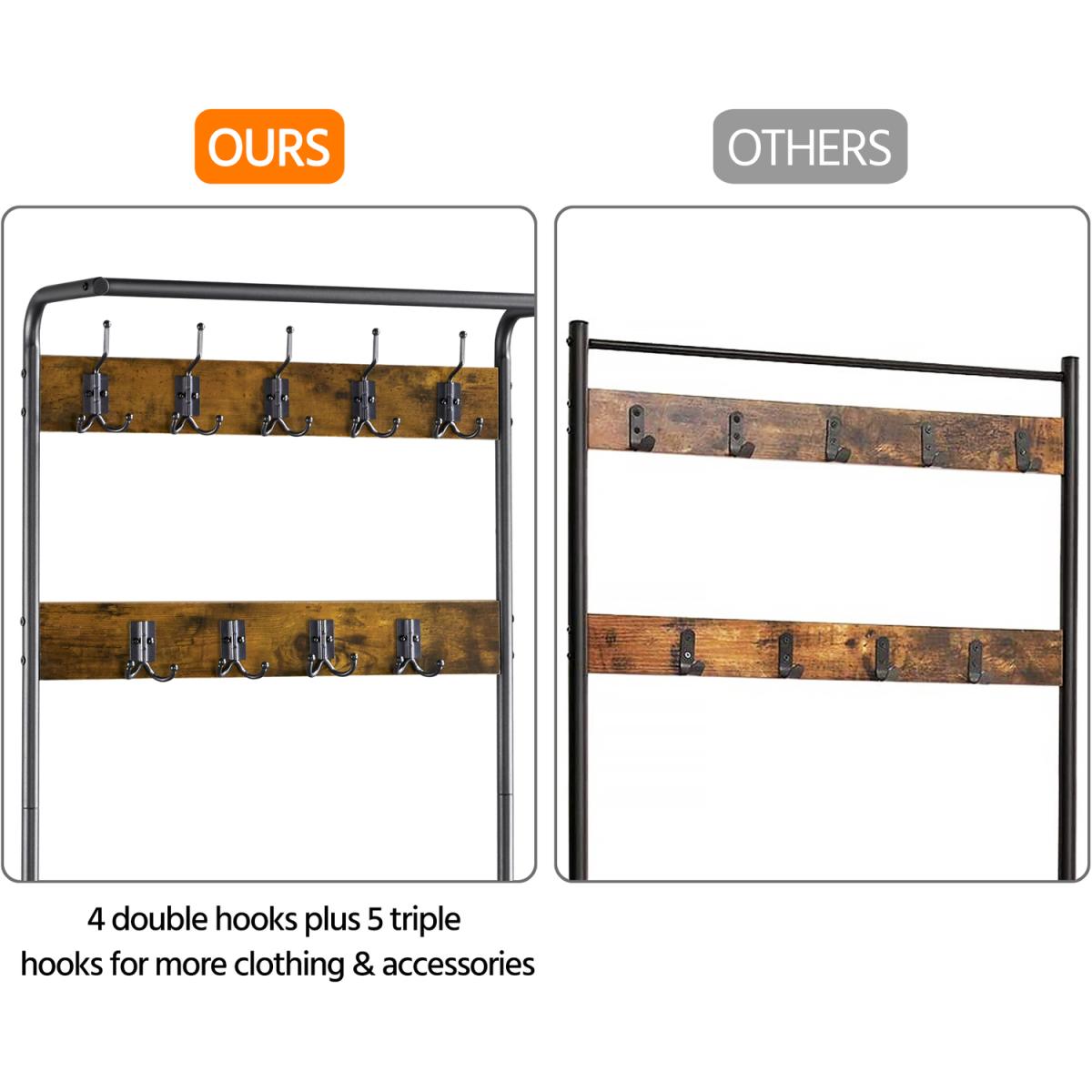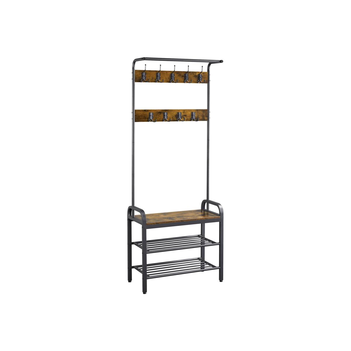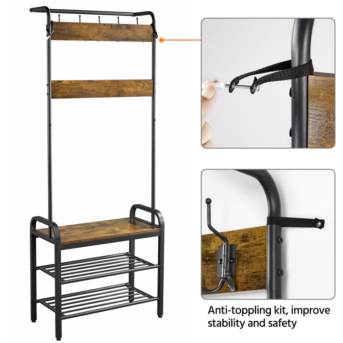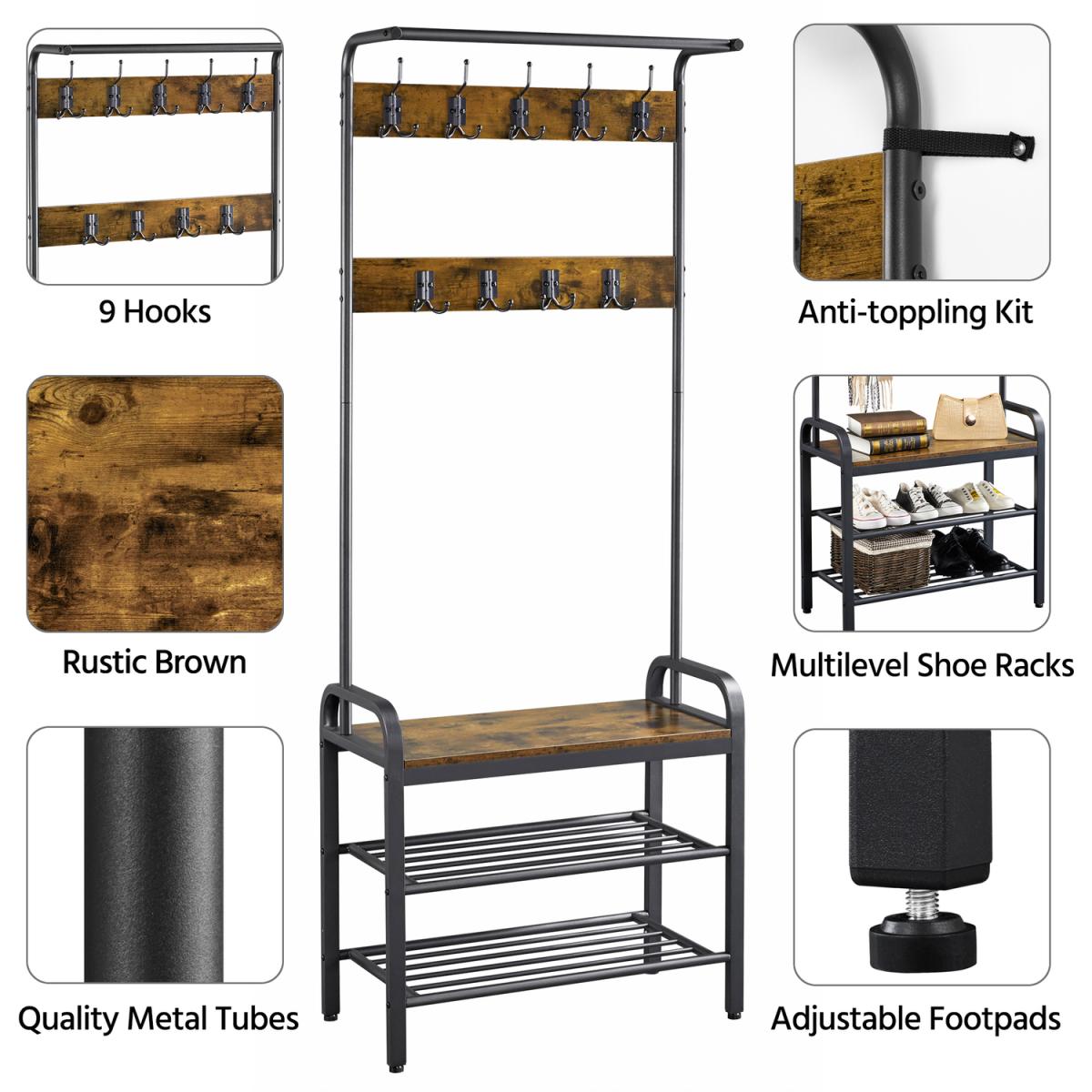 Bring style and order to your entryway, mudroom, or hallway with this rustic industrial hall tree. The beautifully linear coat rack applies a quality metal framework baked and finished with rust-resistant paint and CARB P2-compliant manufactured wood for competitive durability and strength. This multifunctional coat rack provides vertical storage for small-space living. Offering the perfect place for shoe changing, the bench with 120kg capacity features 2 racks below to neatly hold shoes out of the way. It has 23 ball-end hooks to keep your bags, hats, coats, keys, and dog leashes handy and tidy. The bench finished in rustic brown matches wonderfully with the matte black racks. A practical addition to the entryway, hall, foyer, mudroom and bedroom.