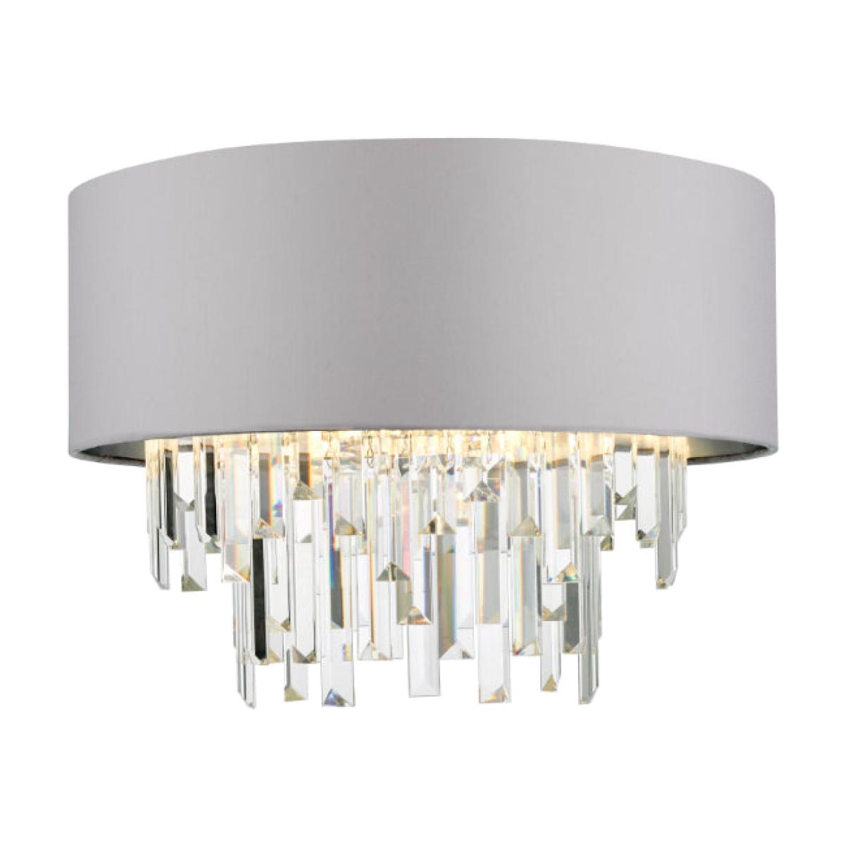 Contemporary flush ceiling light featuring a grey shade and crystal detail An elegant addition to your home, this ceiling light is part of the Halle range. This fitting features a grey satin shade and hanging faceted crystals. Opulent and stylish, this light creates beautiful prism reflections when illuminated.   Contemporary flush ceiling light featuring a grey shade and crystal detail An elegant addition to your home, this ceiling light is part of the Halle range. This fitting features a grey satin shade and hanging faceted crystals. Opulent and stylish, this light creates beautiful prism reflections when illuminated.