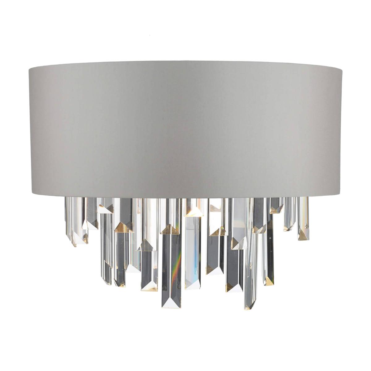 Contemporary wall light with grey shade. An elegant addition to your home, this wall light is part of the Halle range from Dar Lighting. The fitting features a grey satin shade and faceted coffin crystals. This opulent 2 light fitting creates a beautiful prism reflection through the double tier crystals when illuminated. Contemporary wall light with grey shade. An elegant addition to your home, this wall light is part of the Halle range from Dar Lighting. The fitting features a grey satin shade and faceted coffin crystals. This opulent 2 light fitting creates a beautiful prism reflection through the double tier crystals when illuminated.